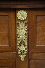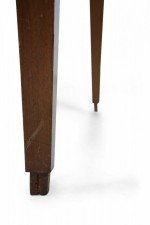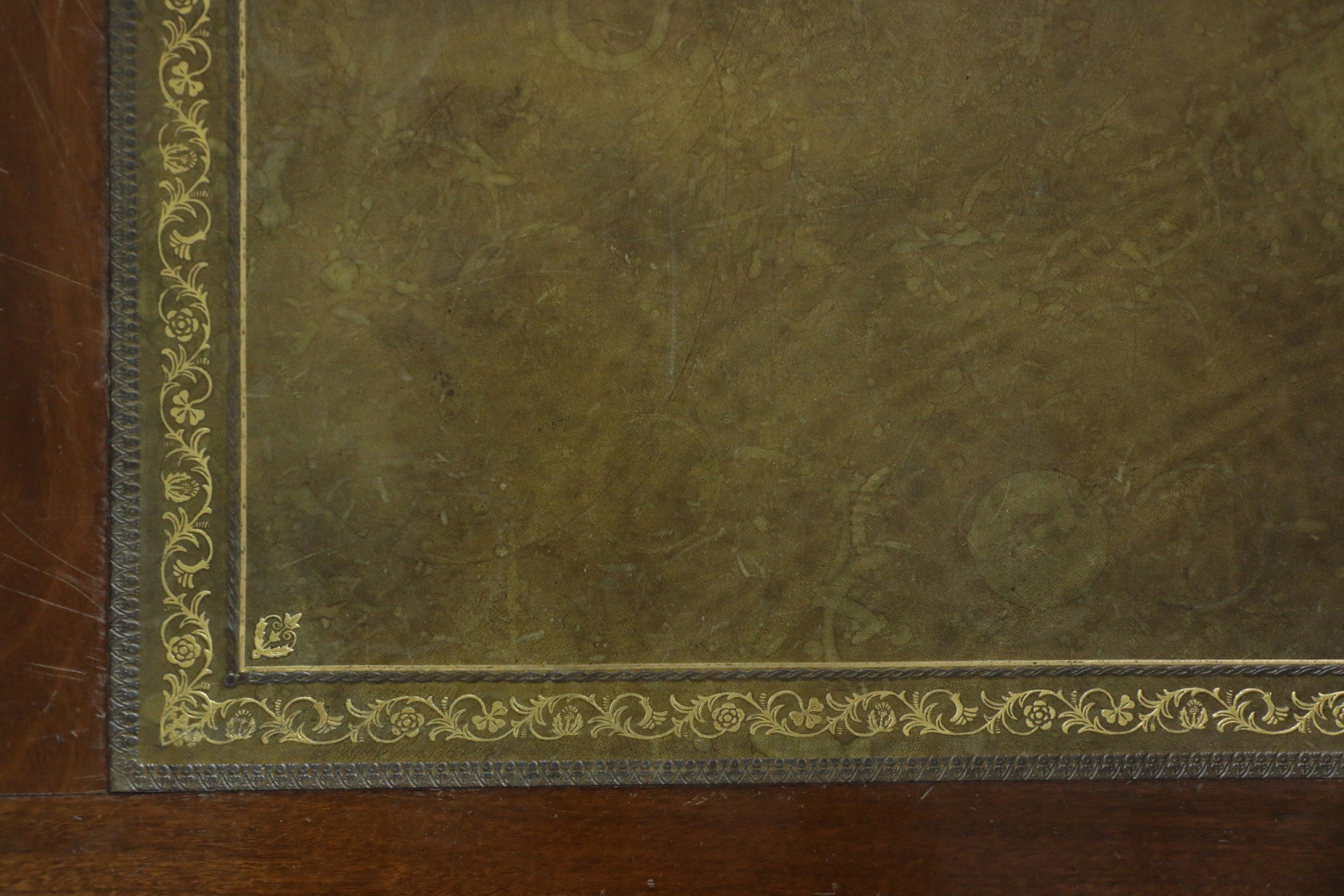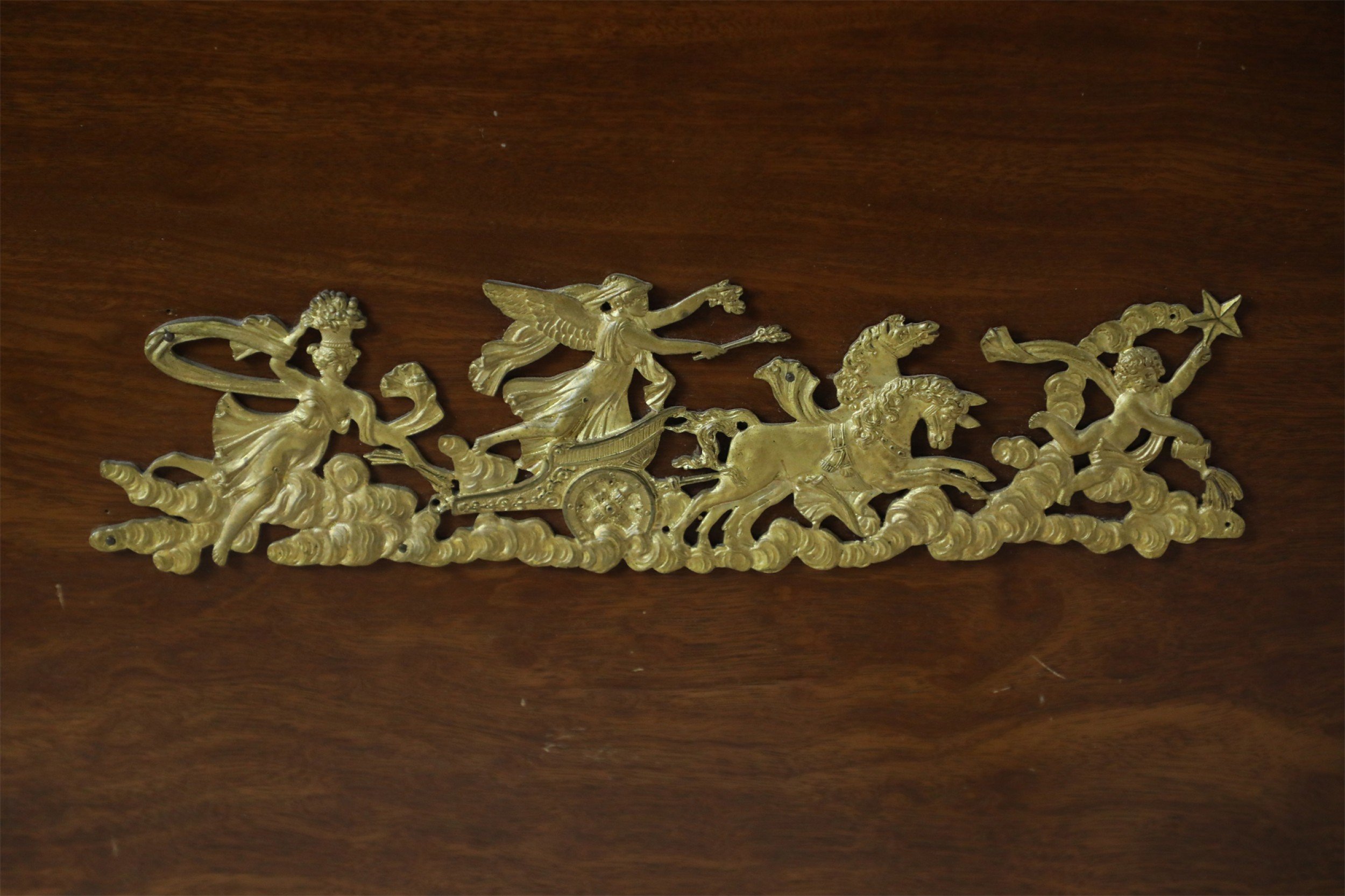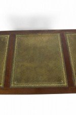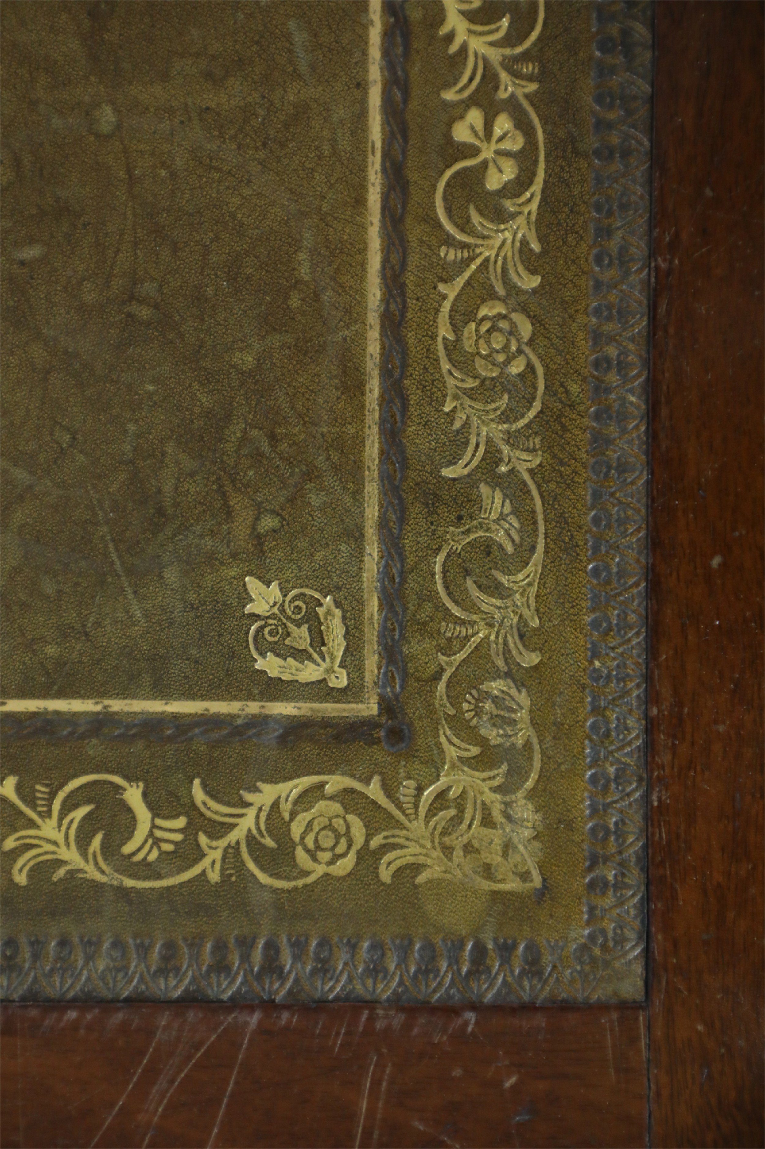Style: French Materials & Techniques: Brass, embossed, lacquered, leather, mahogany, metal, wood Category: Tables, Office/Library Condition: Water stains on top consistent with age and use.