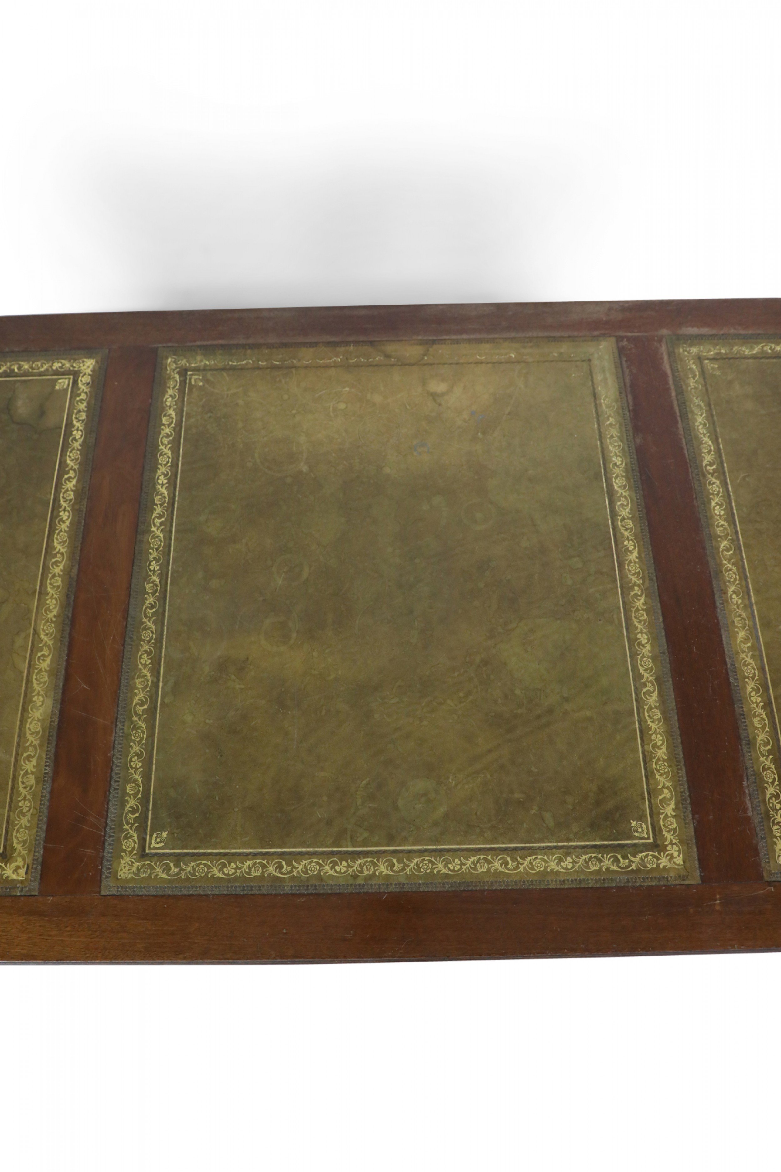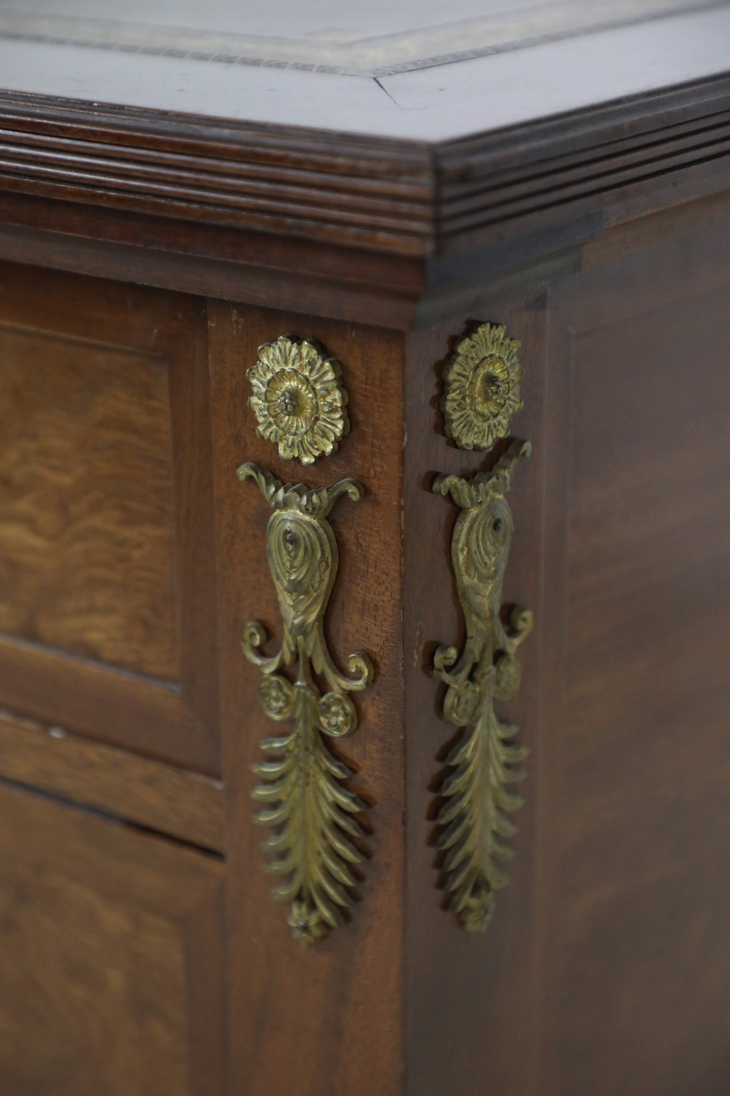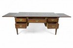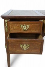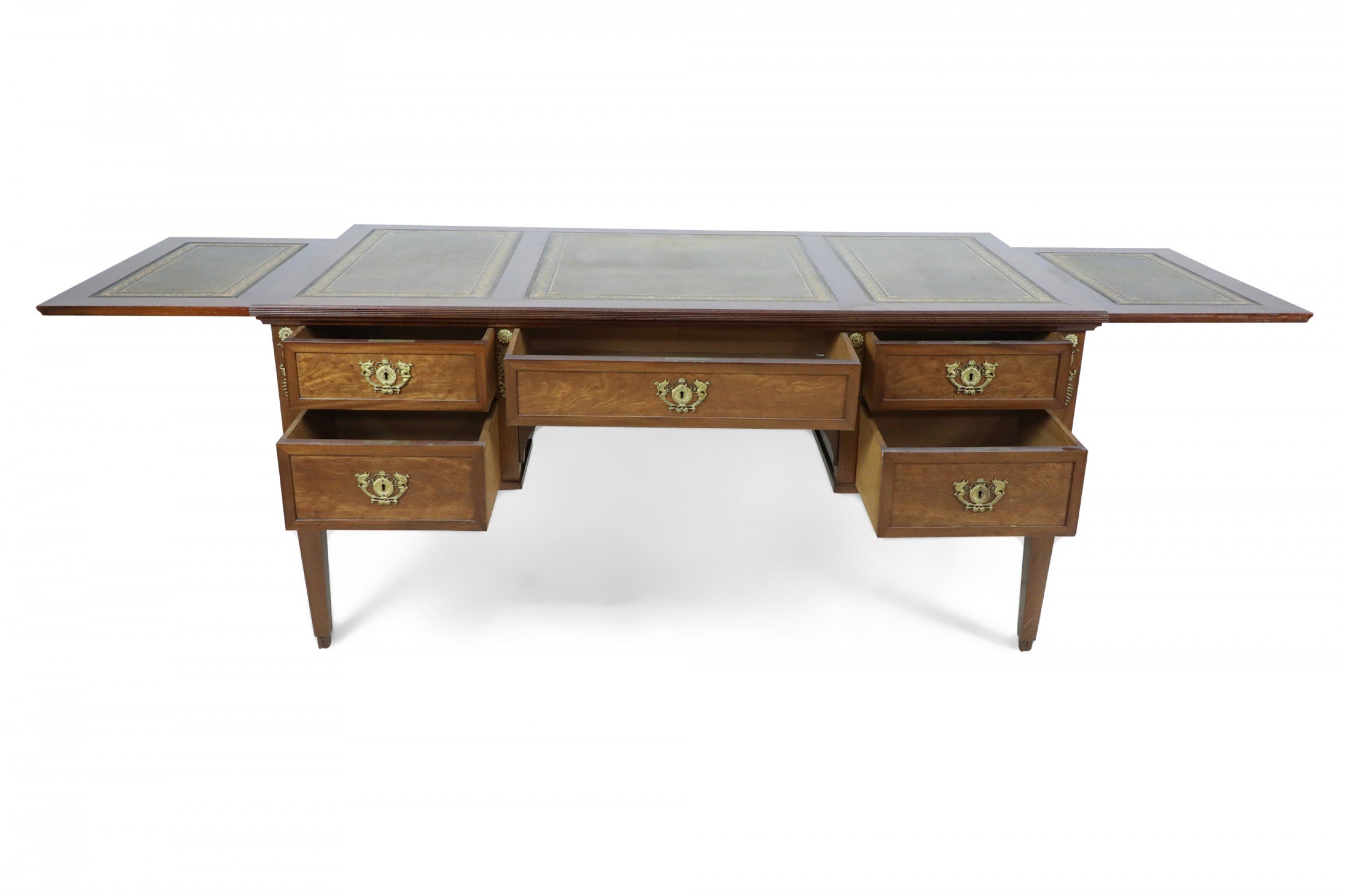 French Louis XVI-style (late 19th/early 20th Century) mahogany writing desk with bronze trim, gilt embossed leather writing top, with pull-out side extensions and 5 front and back drawers (with key).