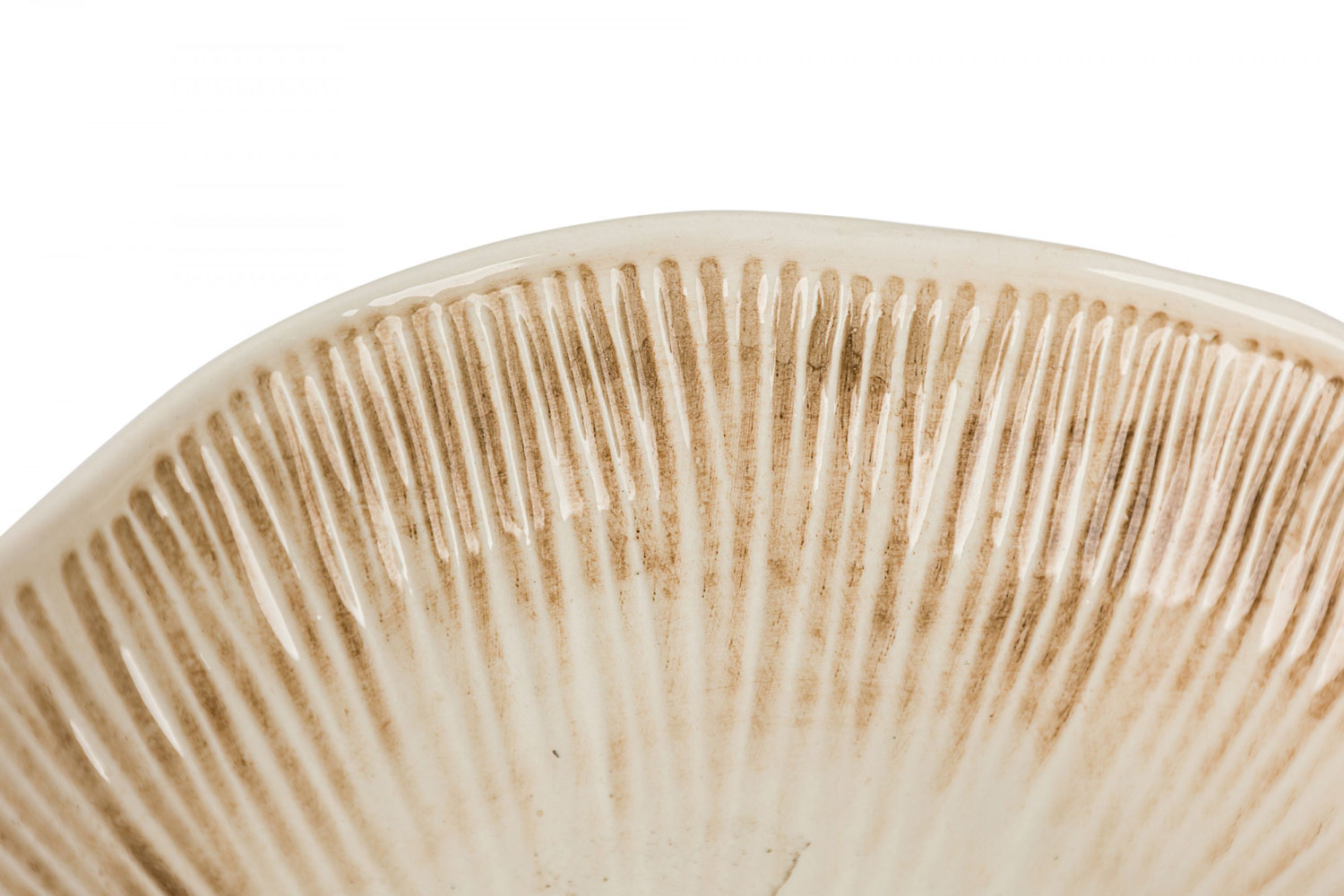 2-Piece Vintage ceramic plate set containing one large serving plate and a double compartments serving plate with a mushroom motif, incised surfaces, and a beige, brown, and green glazed finish. (PRICED AS SET)