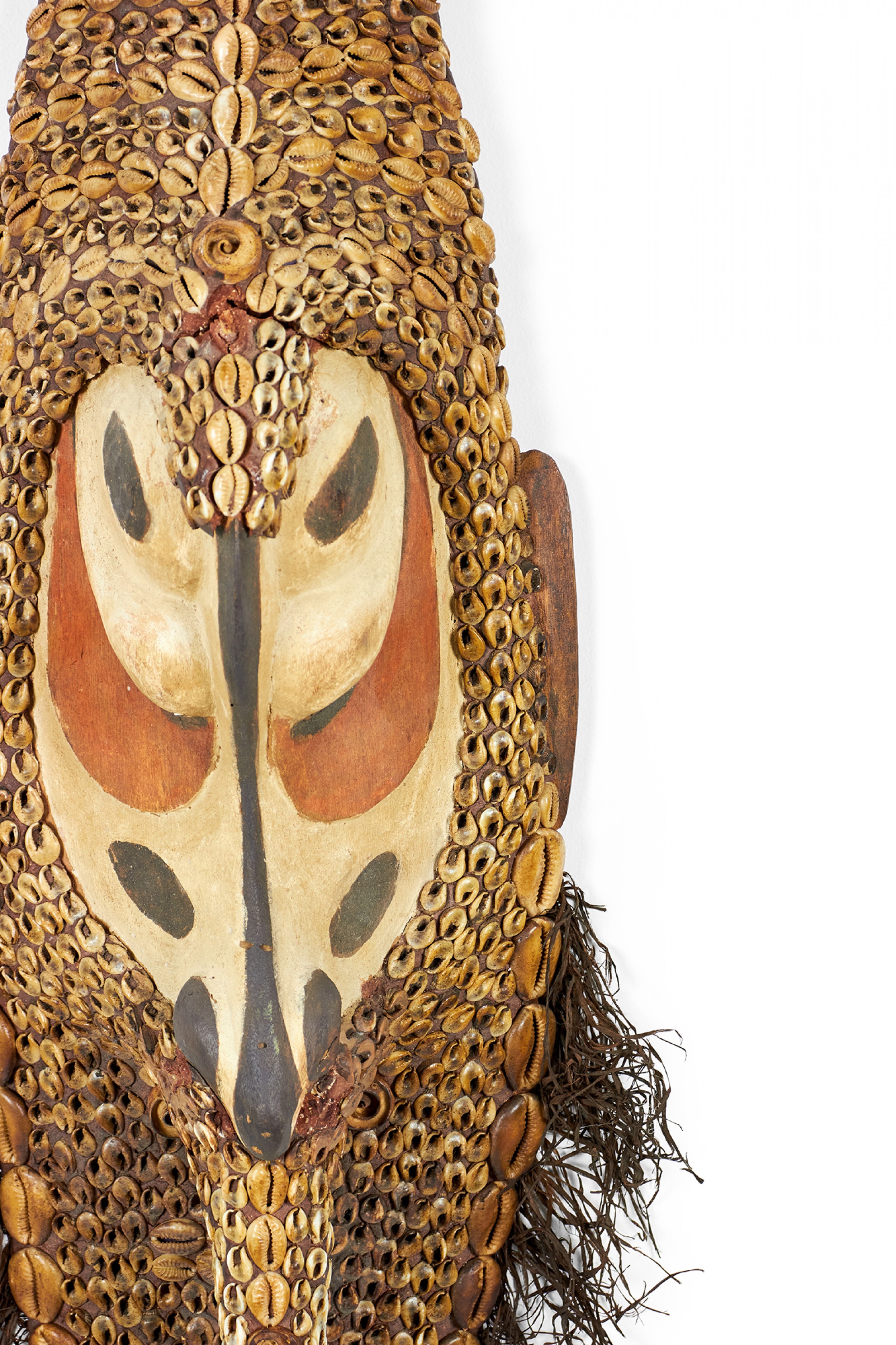 African (possibly Liberian / Dan-Style) carved wooden mask decorated with an intricate pattern of cowrie shells along its outer face and long beak with orange, black and beige painted accents and a root fiber beard.