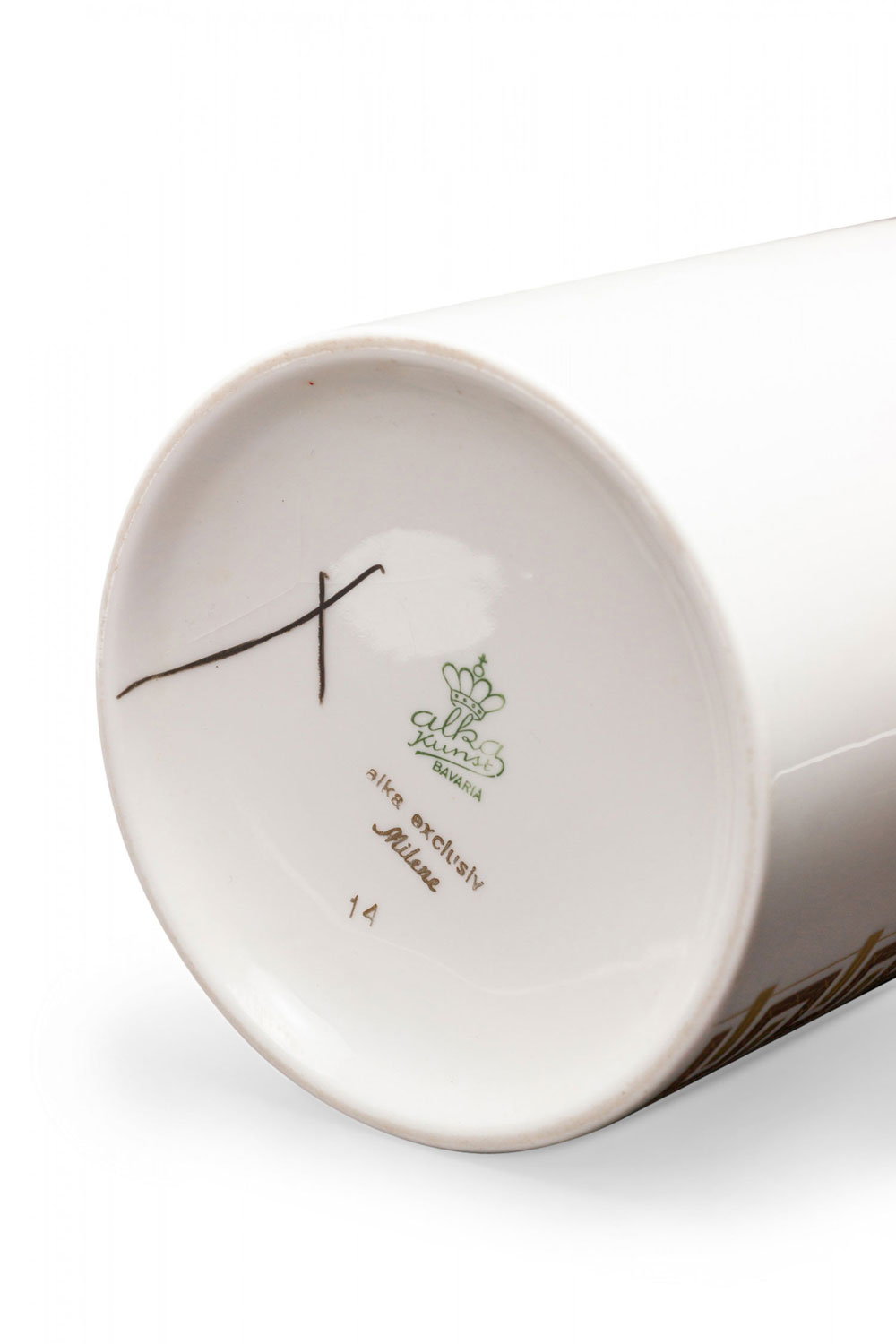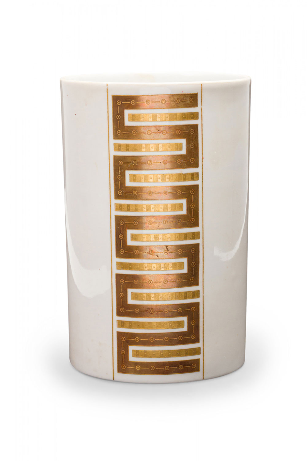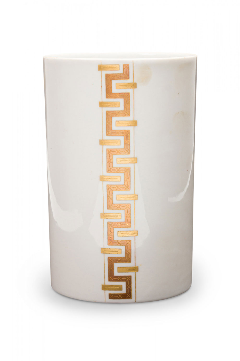Alka Kunst Bavarian German Mid-Century Cylindrical Gilt Geometric Stripe White Porcelain Vase