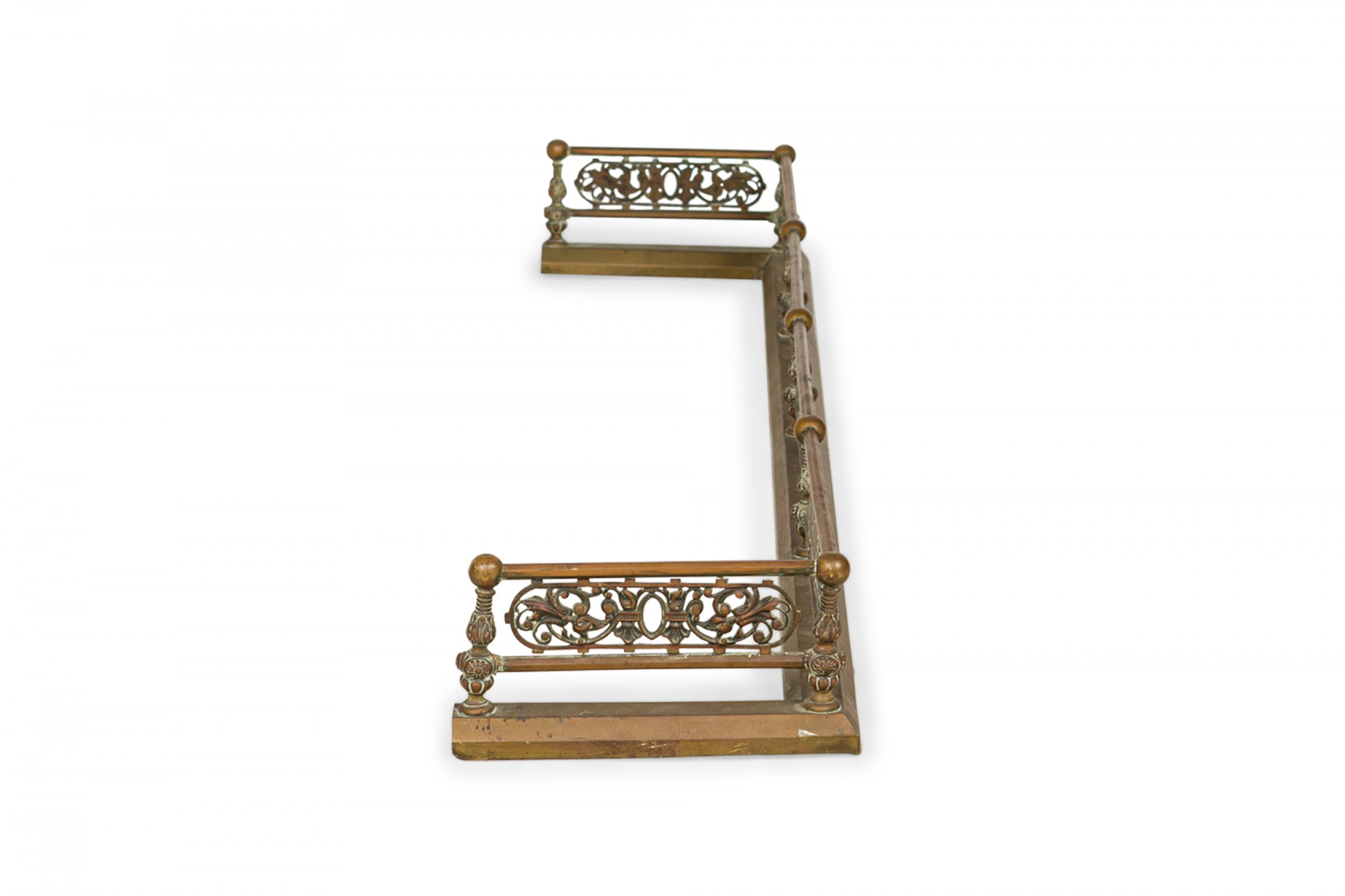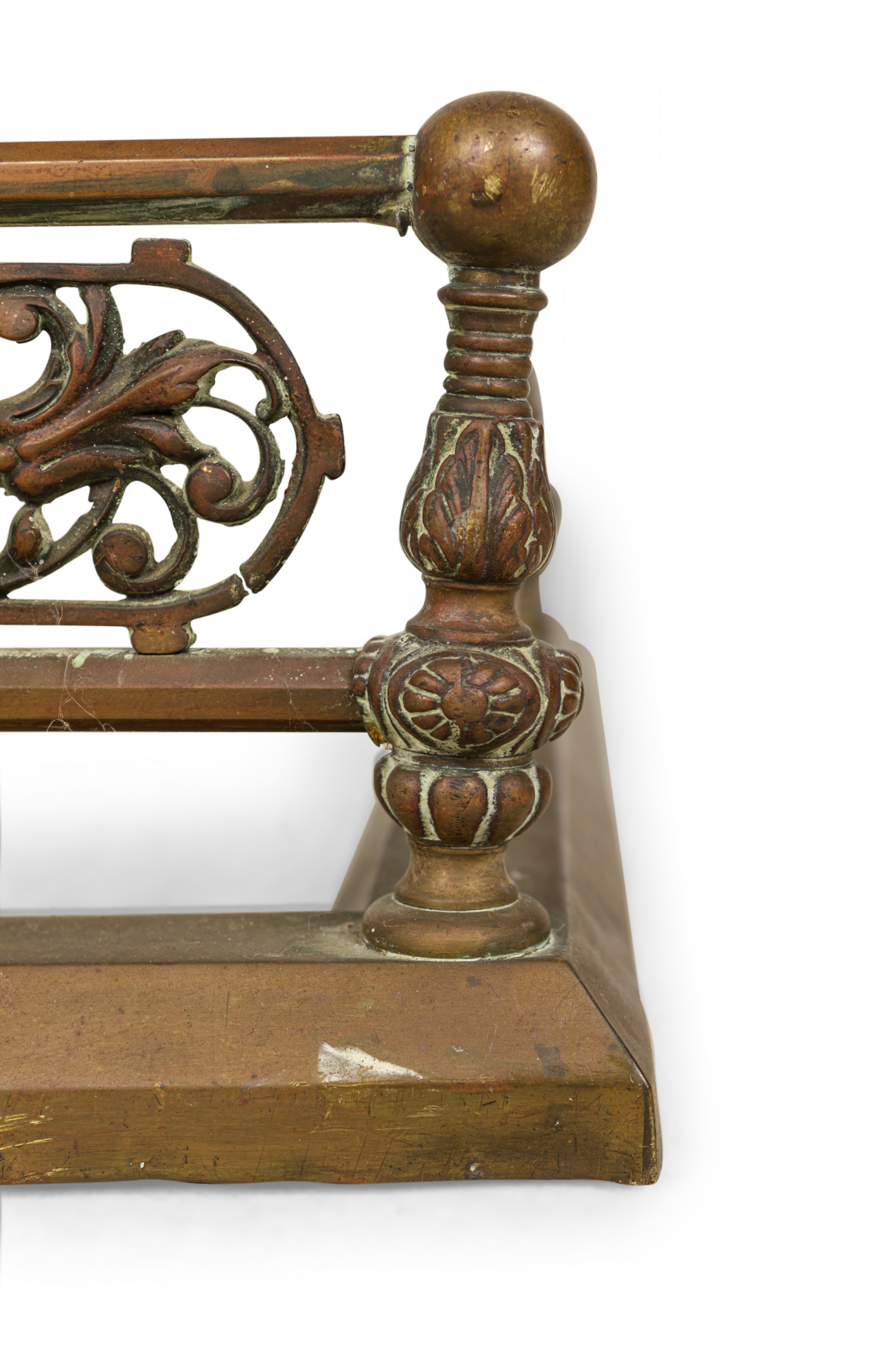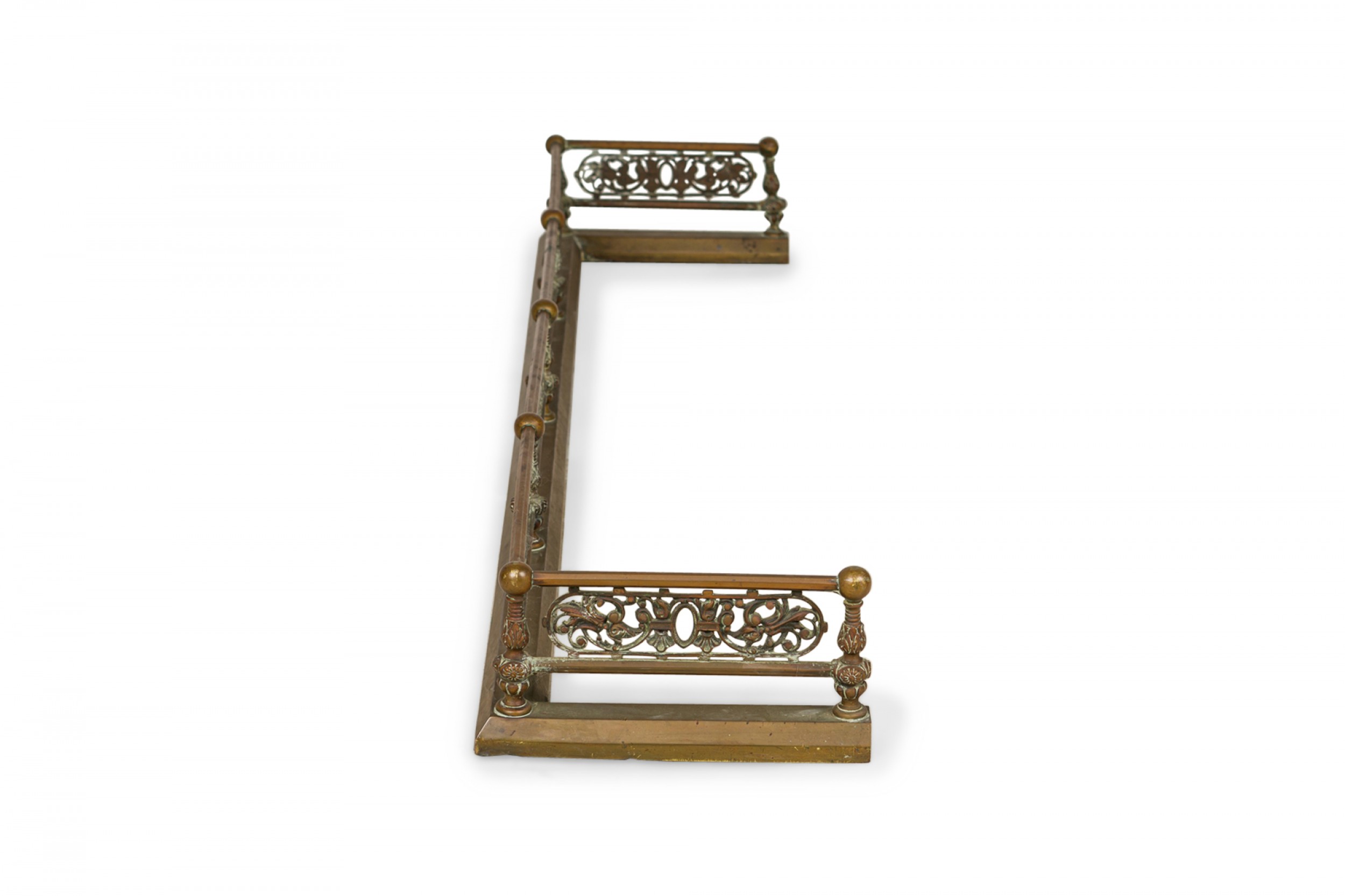 American Victorian bracket-shaped bronze and iron fireplace fender with a sectioned foliate design between two rails with ball joint connections.