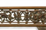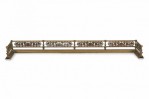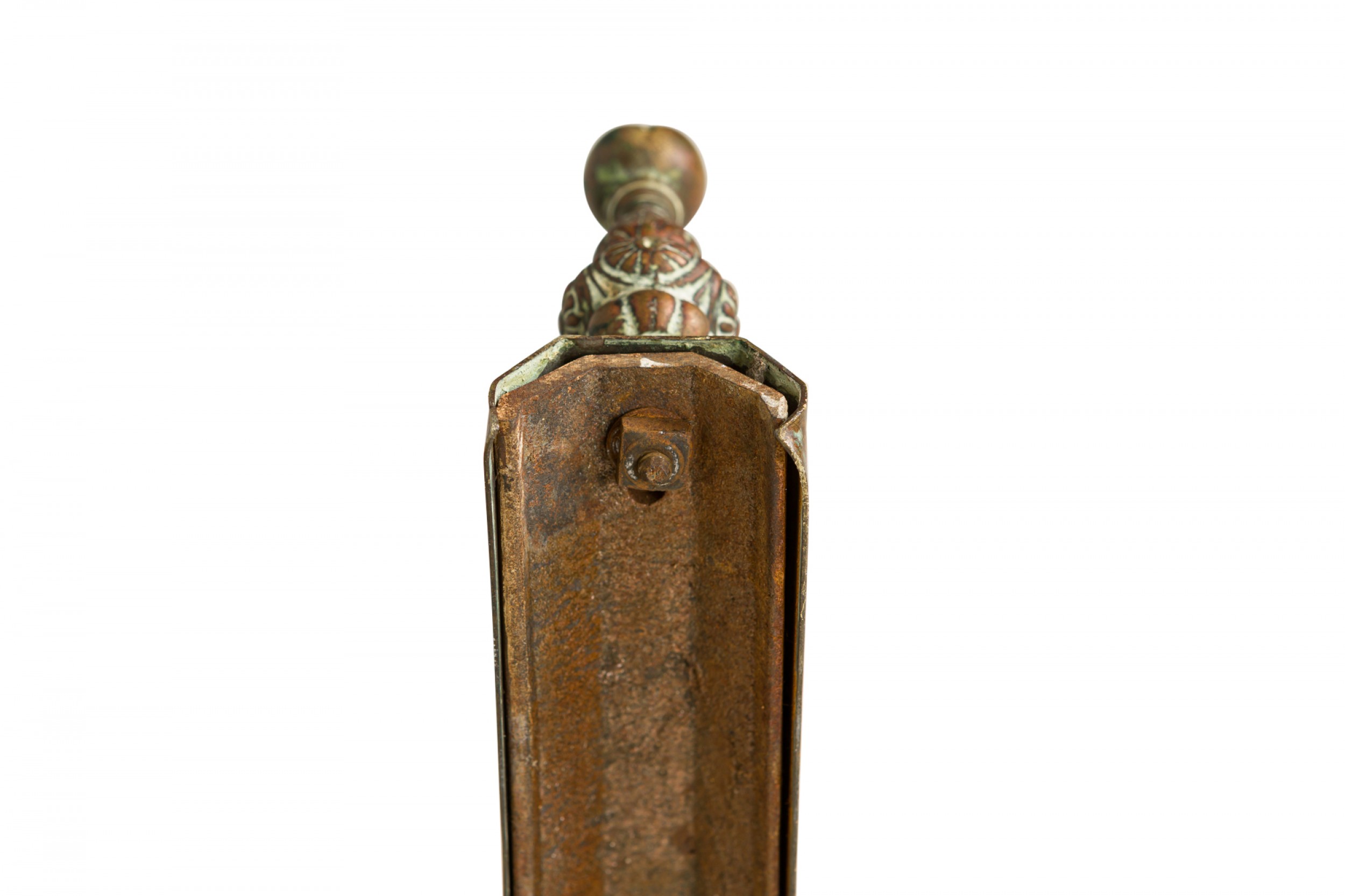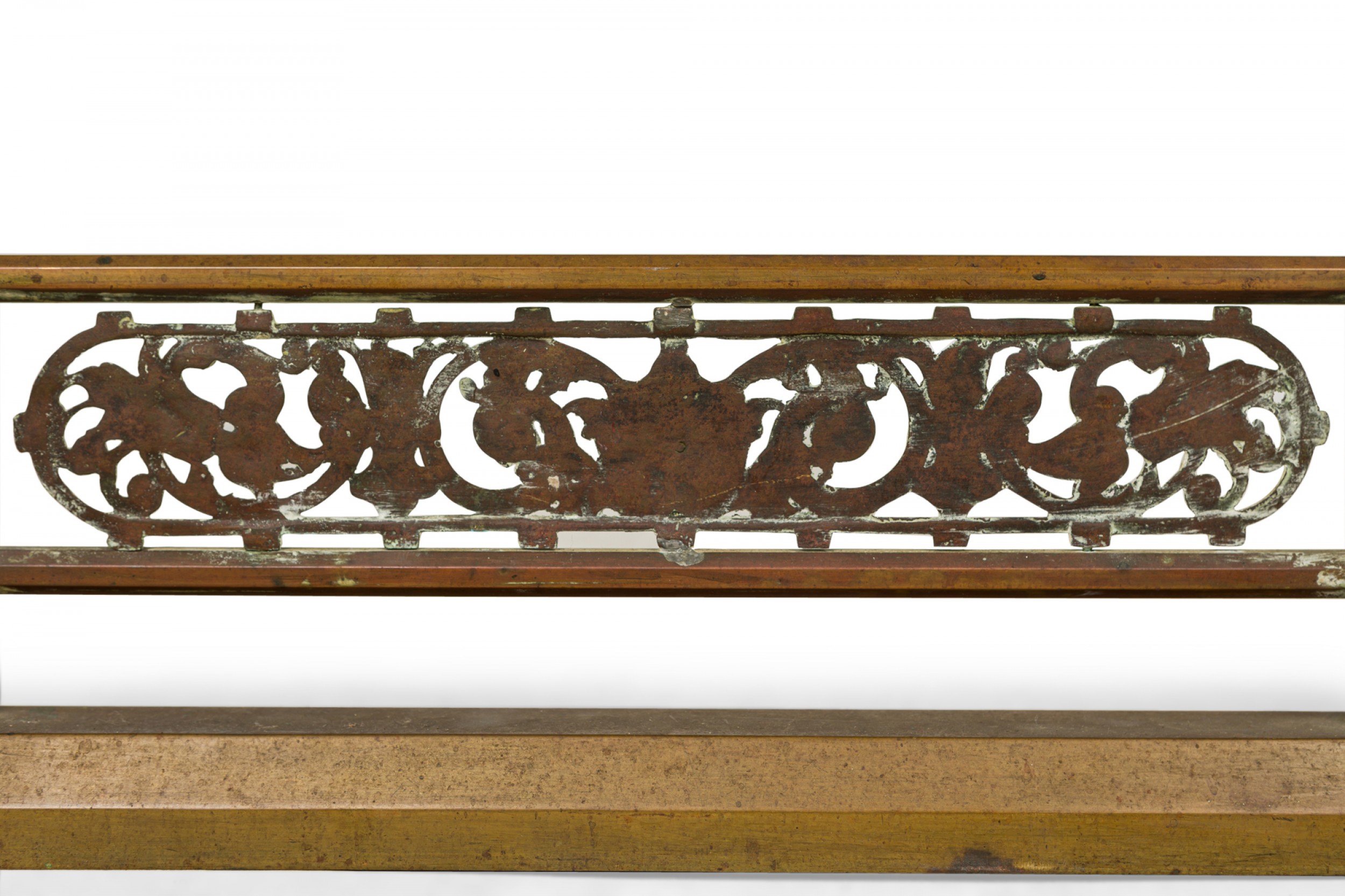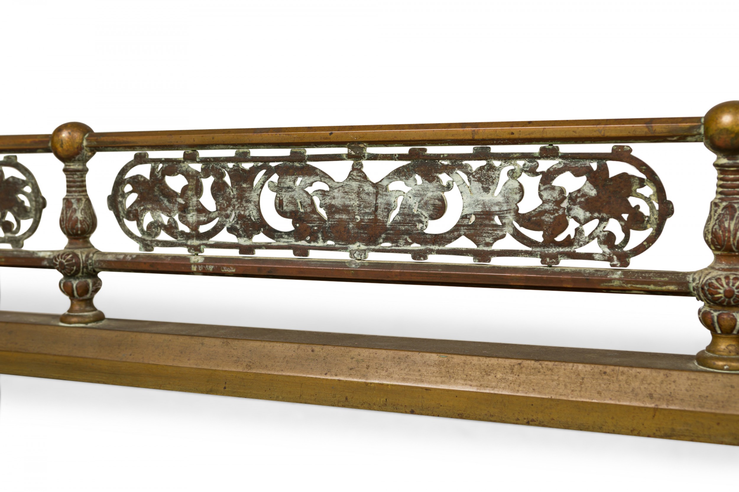 American Victorian bracket-shaped bronze and iron fireplace fender with a sectioned foliate design between two rails with ball joint connections.