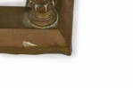 American Victorian bracket-shaped bronze and iron fireplace fender with a sectioned foliate design between two rails with ball joint connections..