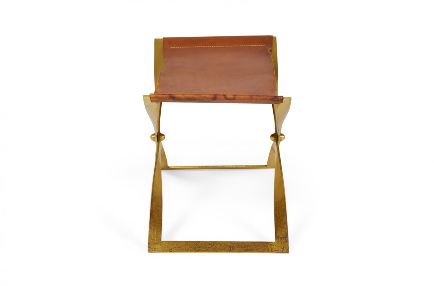 American Mid-Century Brass and Leather Sling Seat Scissor Bench