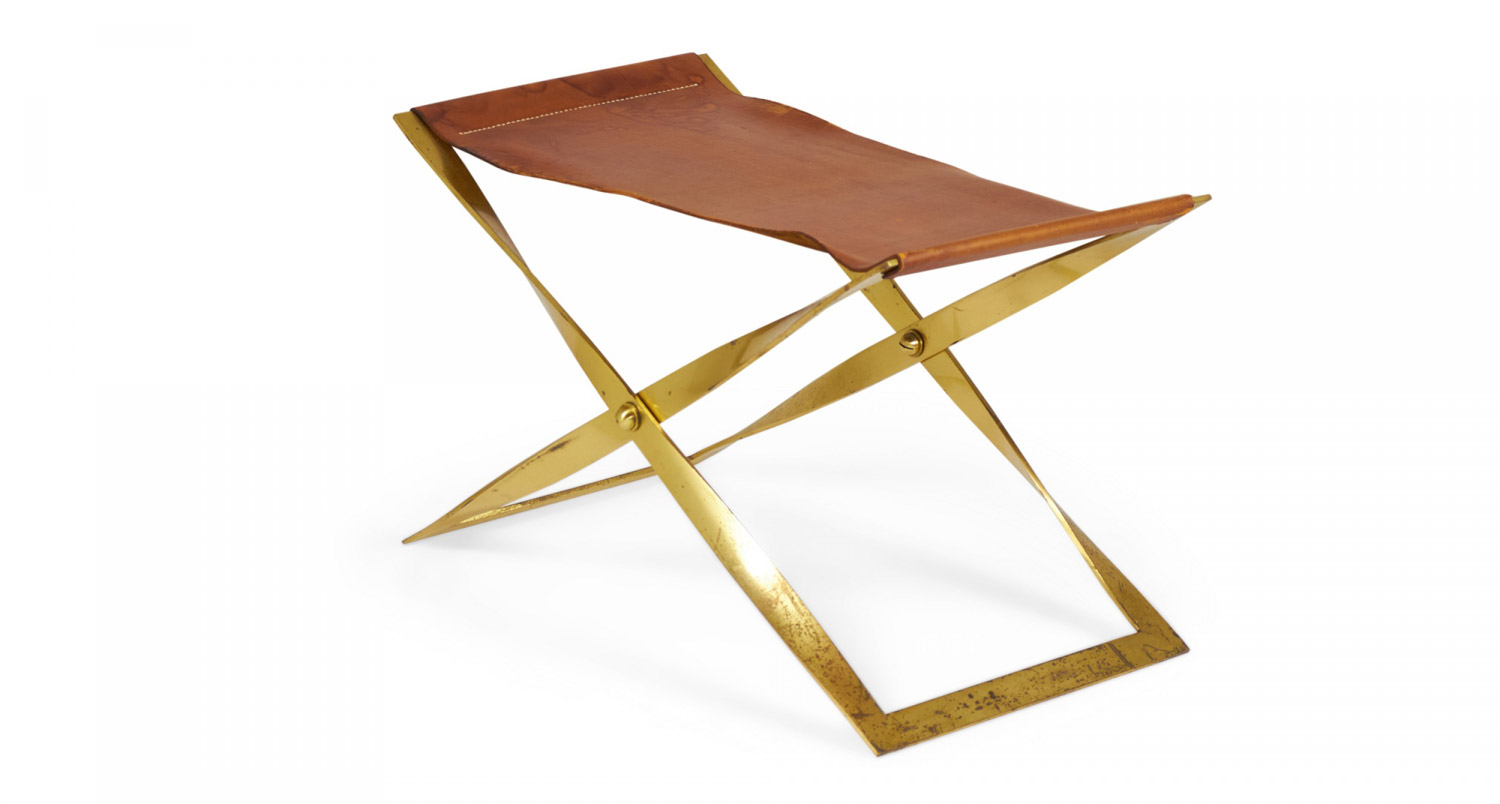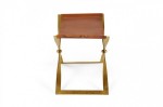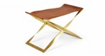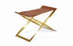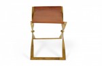 American Mid-Century scissor bench with a polished brass x-shaped frame and a brown leather sling seat.