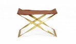 American Mid-Century scissor bench with a polished brass x-shaped frame and a brown leather sling seat..