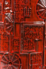 West German Mid-Century cylindrical ceramic vase with a raised irregular pattern titled "Narvik," featuring geometric shapes, highlighted and dotted in black against a deep red glaze. (BODO MANS for BAY KERAMIK, stamped on bottom, BAY, W-GERMANY 956-45).