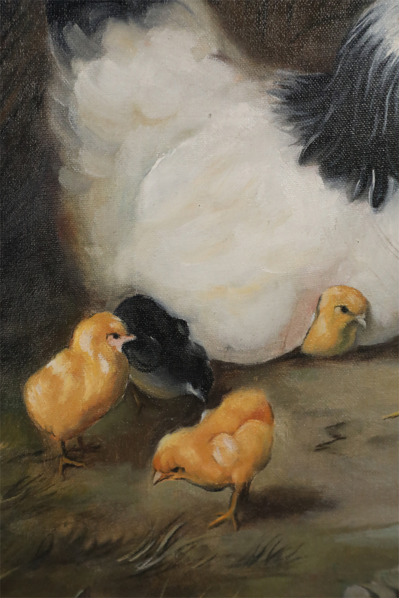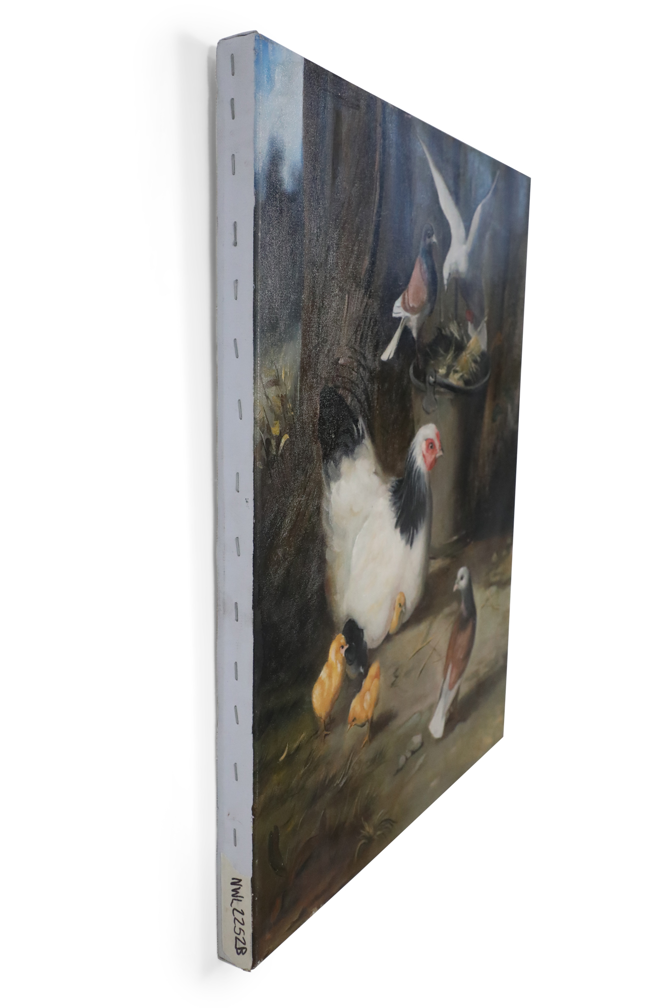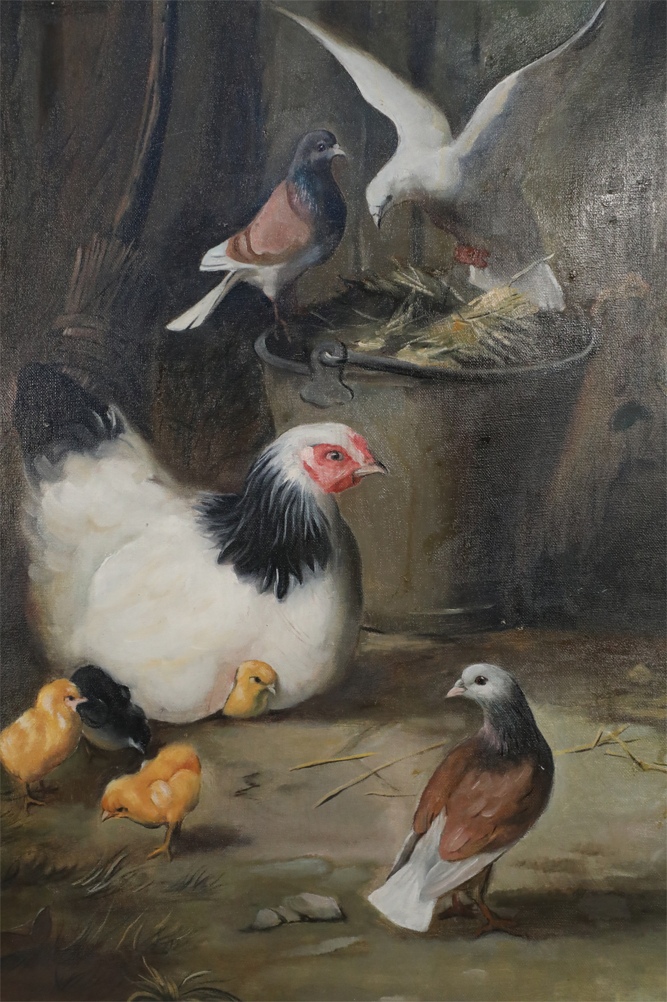 English Victorian style (20th Century) oil painting depicting varied fowl, including chickens, chicks, pigeons and doves, pecking straw from both the ground and a bucket, on rectangular unframed canvas (Similar copy of same painting with minor variations: NWL2252A)..