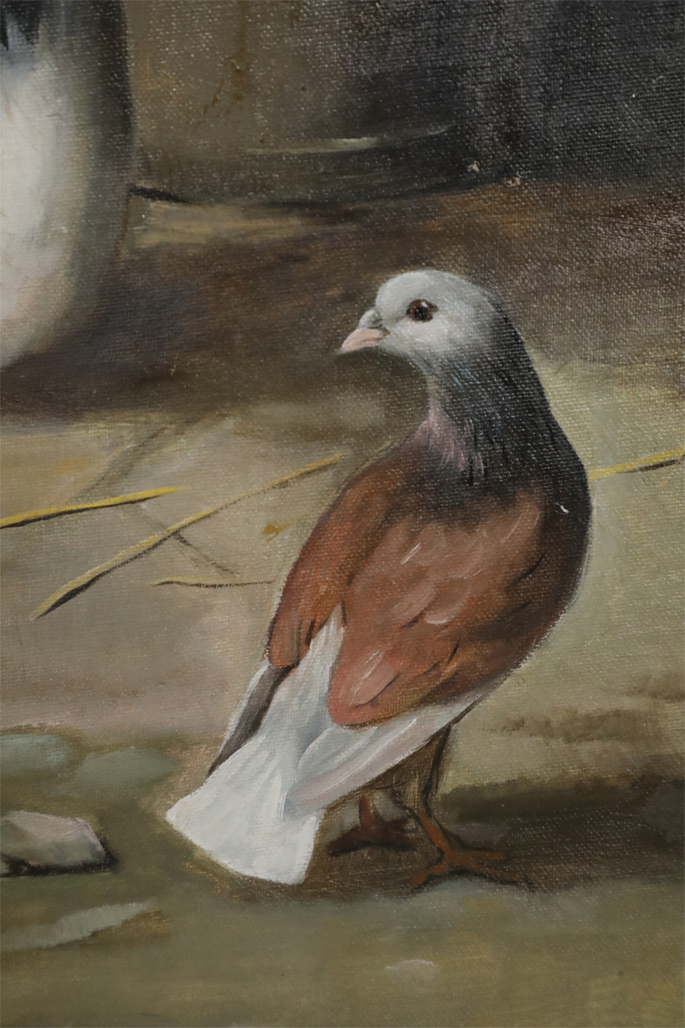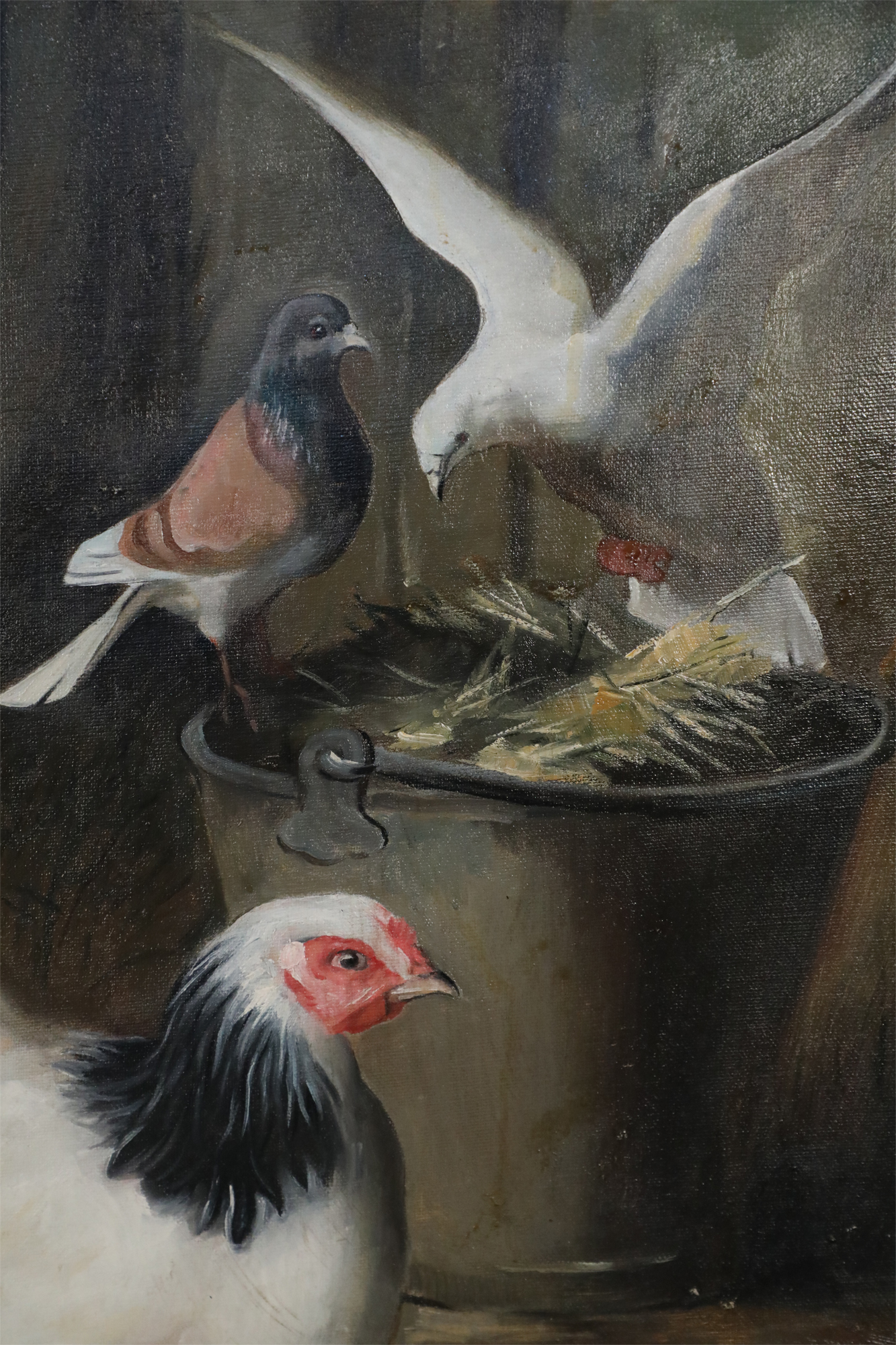 English Victorian style (20th Century) oil painting depicting varied fowl, including chickens, chicks, pigeons and doves, pecking straw from both the ground and a bucket, on rectangular unframed canvas (Similar copy of same painting with minor variations: NWL2252A).