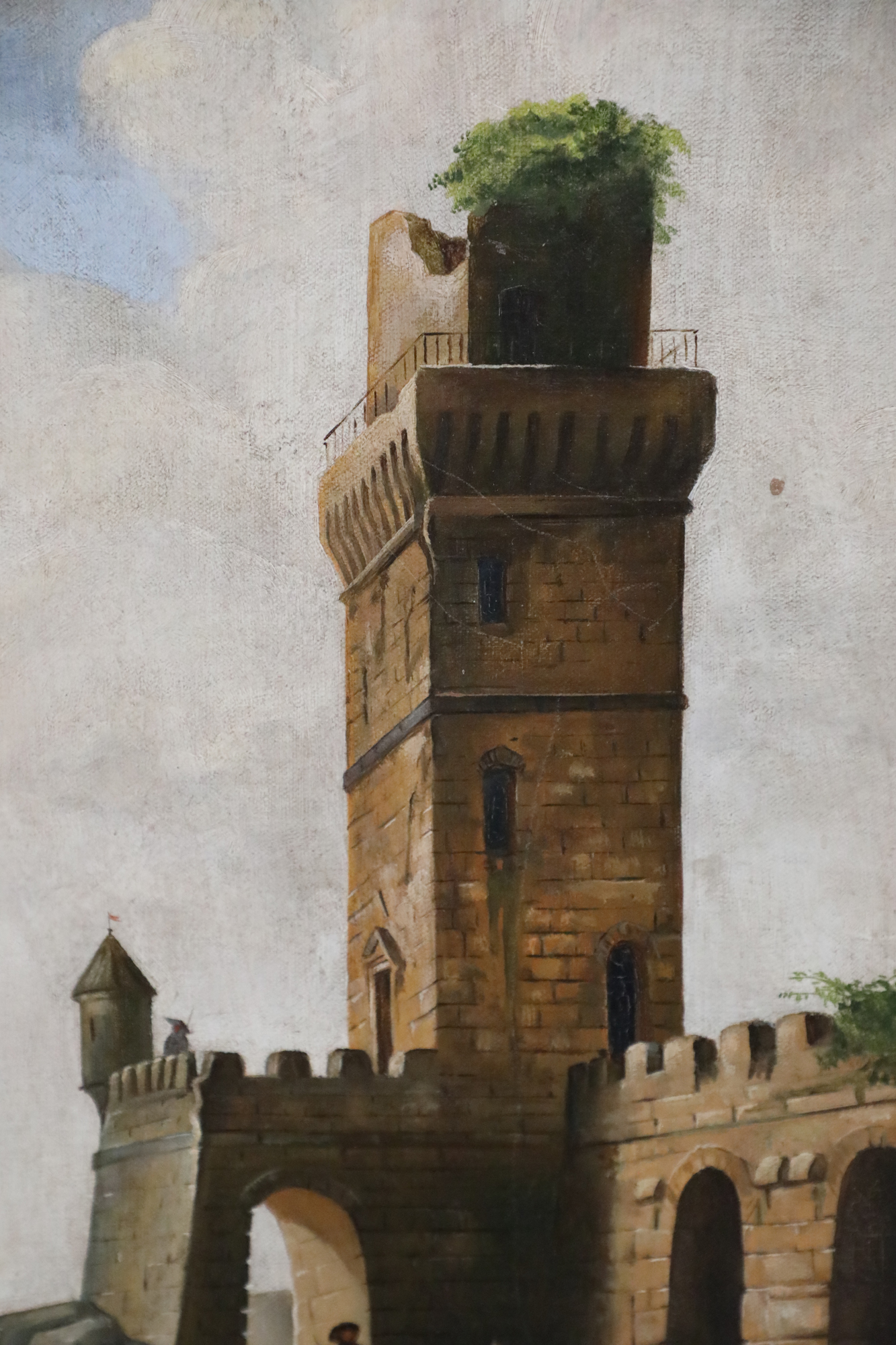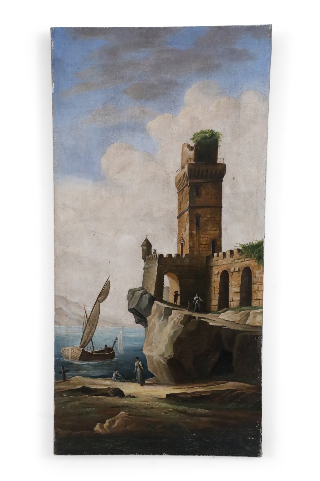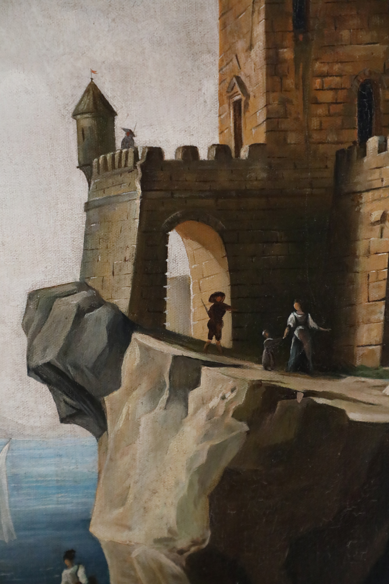 Italian Neo-classic style (20th Century) painting of a castle on a rocky cliff over the sea with figures seen on the beach and the castle grounds, and a sailboat just offshore, on unframed, rectangular canvas.