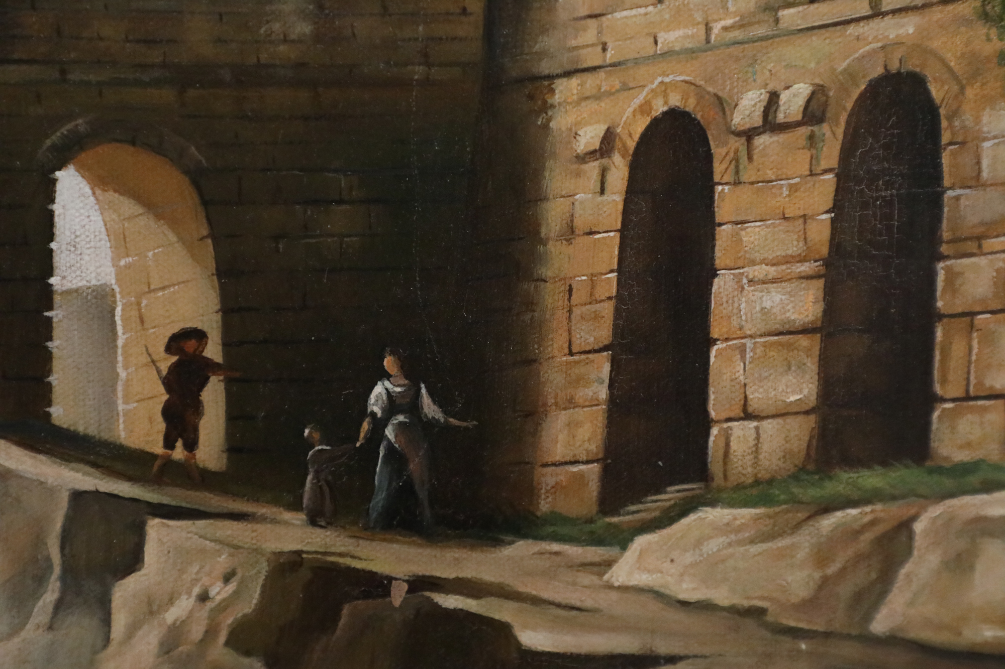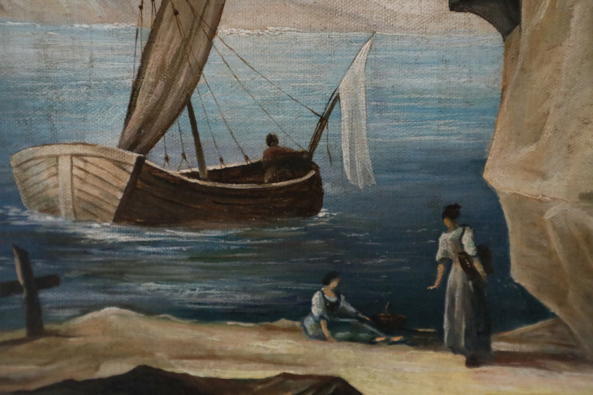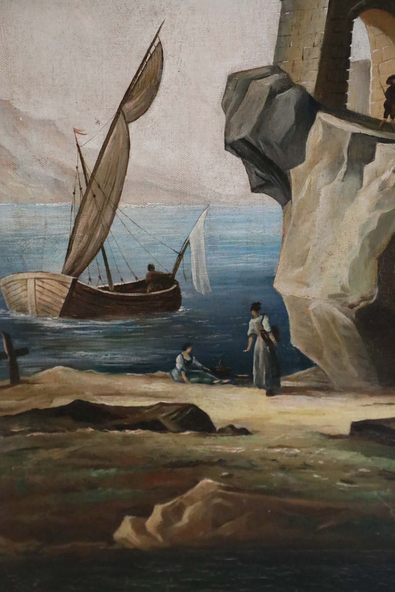 Italian Neo-classic style (20th Century) painting of a castle on a rocky cliff over the sea with figures seen on the beach and the castle grounds, and a sailboat just offshore, on unframed, rectangular canvas..