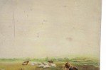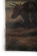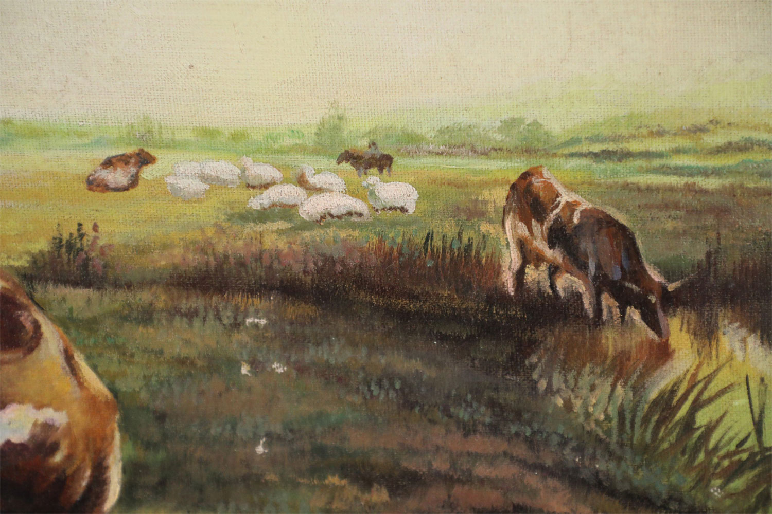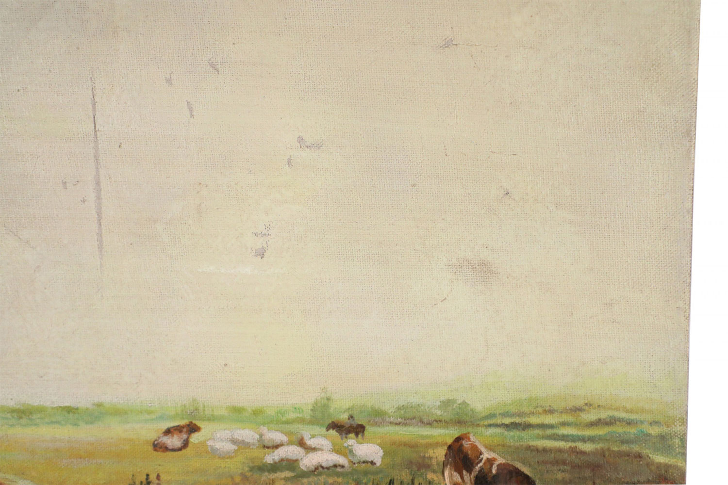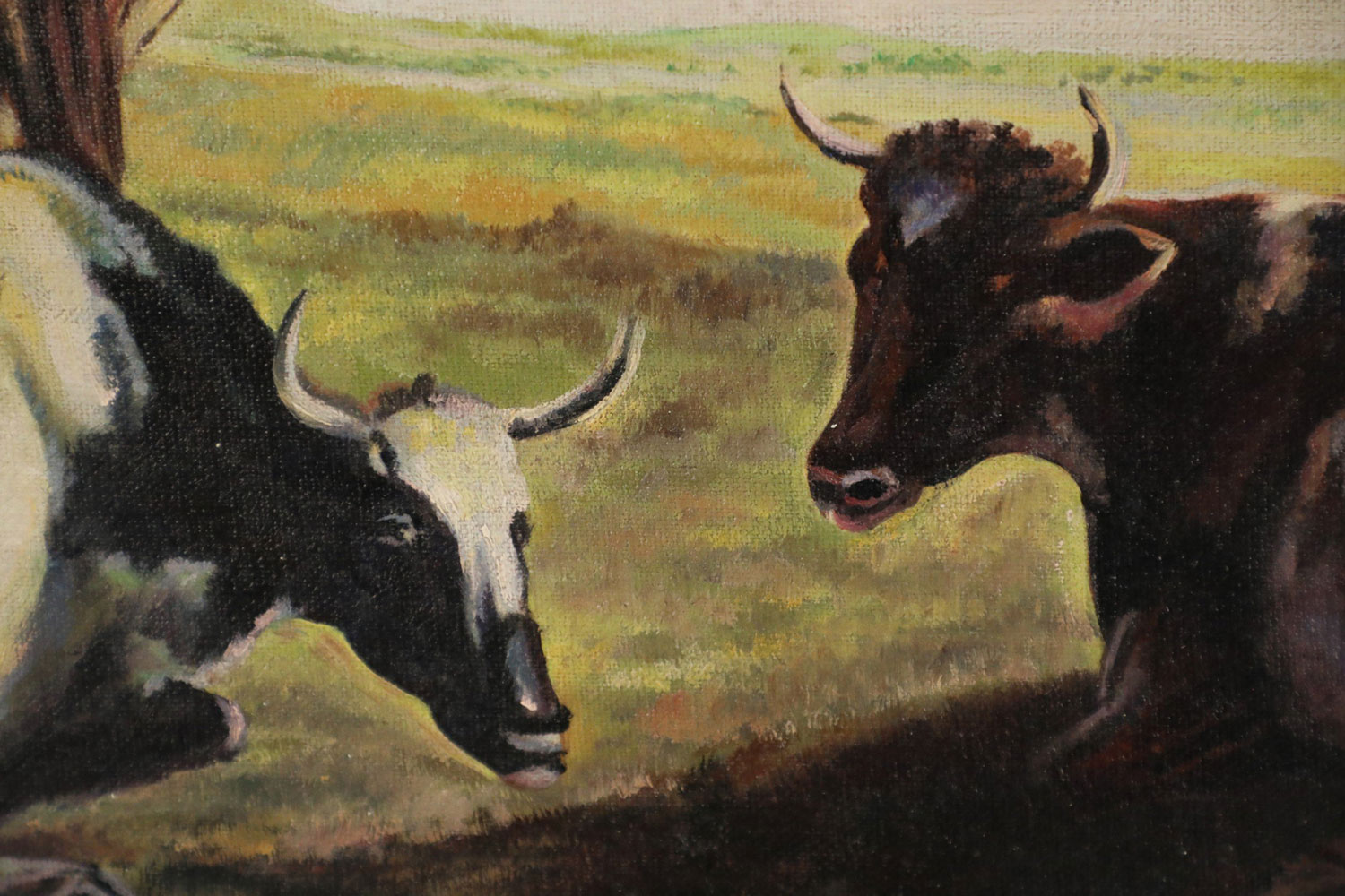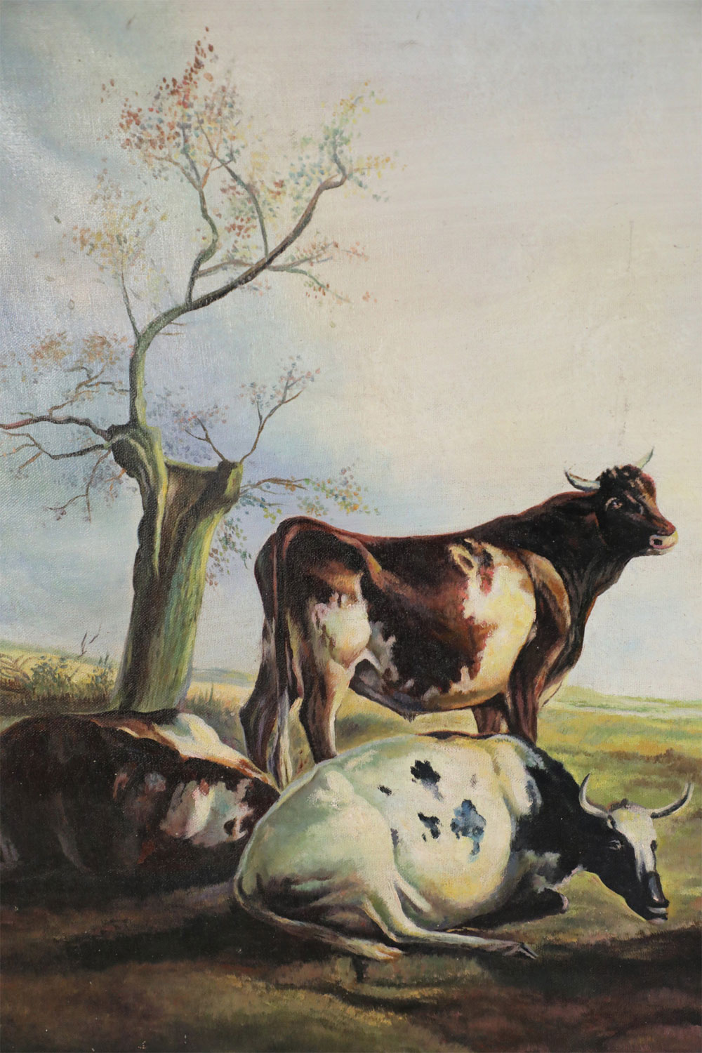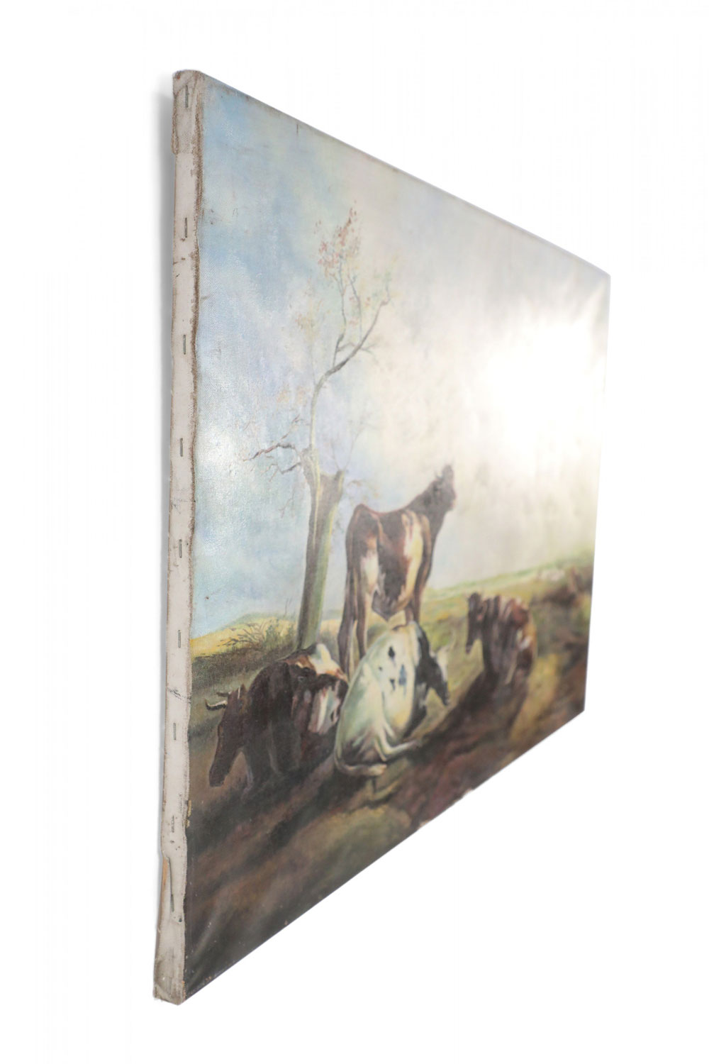 English Victorian style (20th Century) oil painting depicting a group of dairy cows relaxing in a field with a background of sweeping flat planes interrupted only by a single tree, on rectangular unframed canvas (Similar copy with minor variants: NWL2257B)..