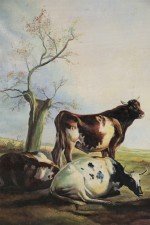English Victorian style (20th Century) oil painting depicting a group of dairy cows relaxing in a field with a background of sweeping flat planes interrupted only by a single tree, on rectangular unframed canvas (Similar copy with minor variants: NWL2257B).