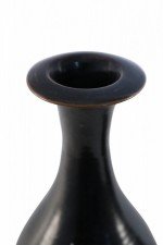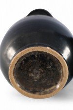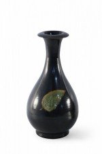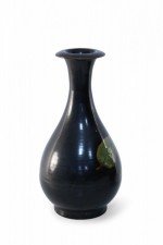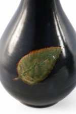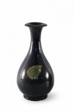 Chinese (17th Century-style) black glazed ceramic pear-shaped vase decorated with a green leaf on the front and back. (Similar piece: NWL2367).