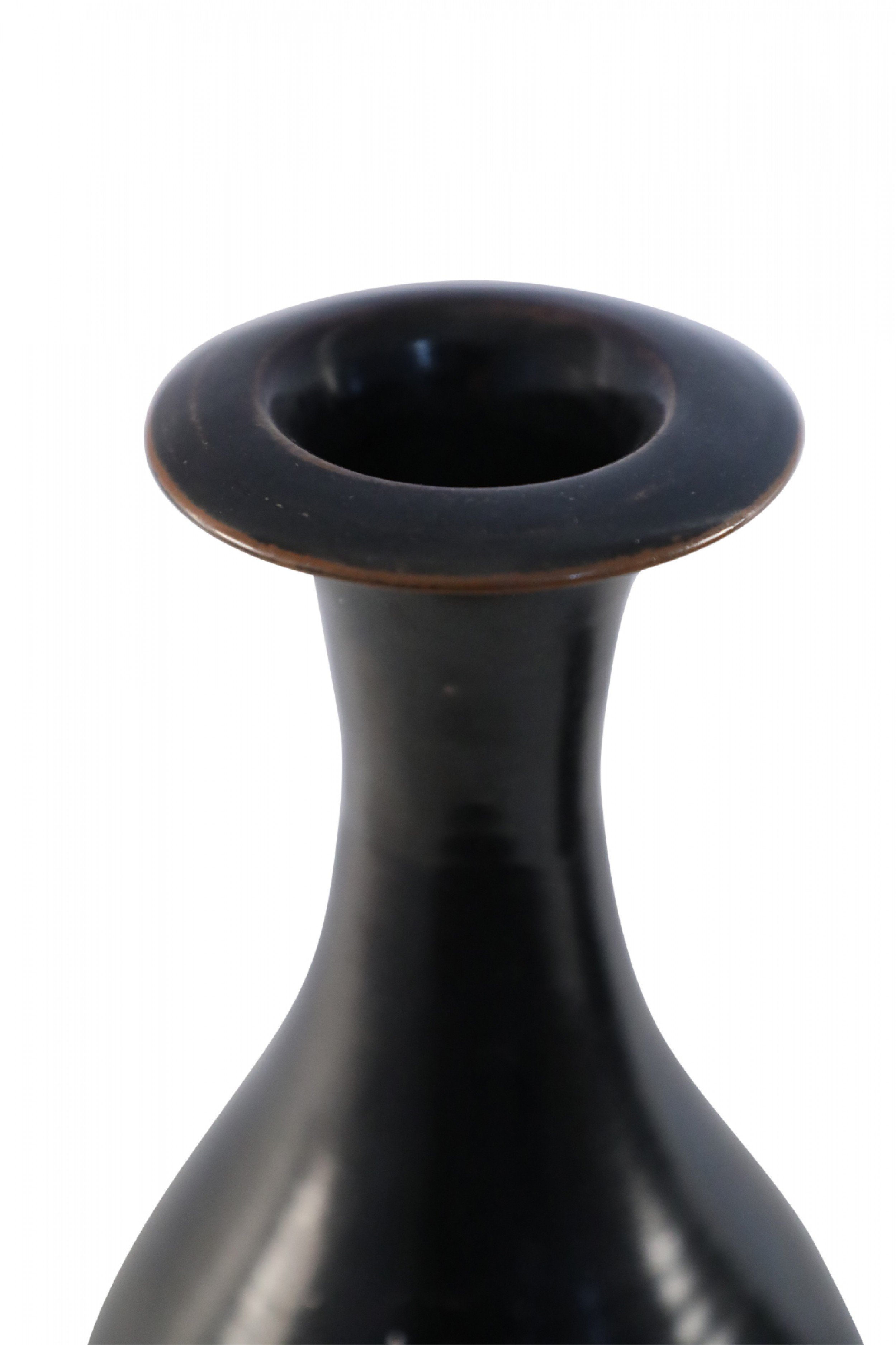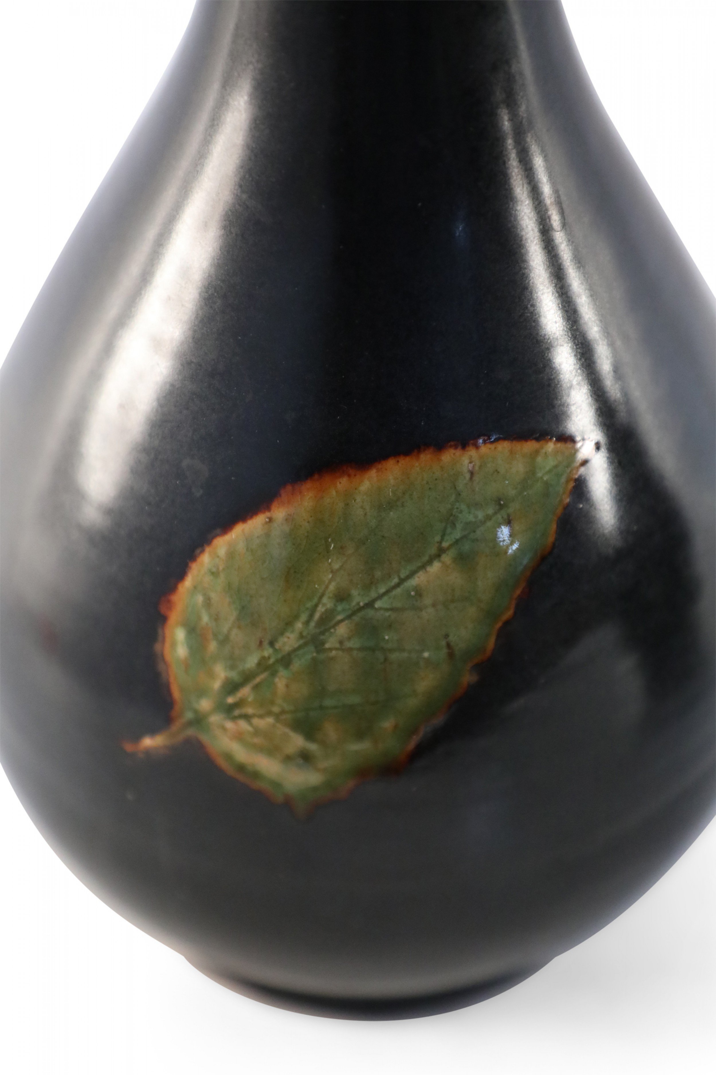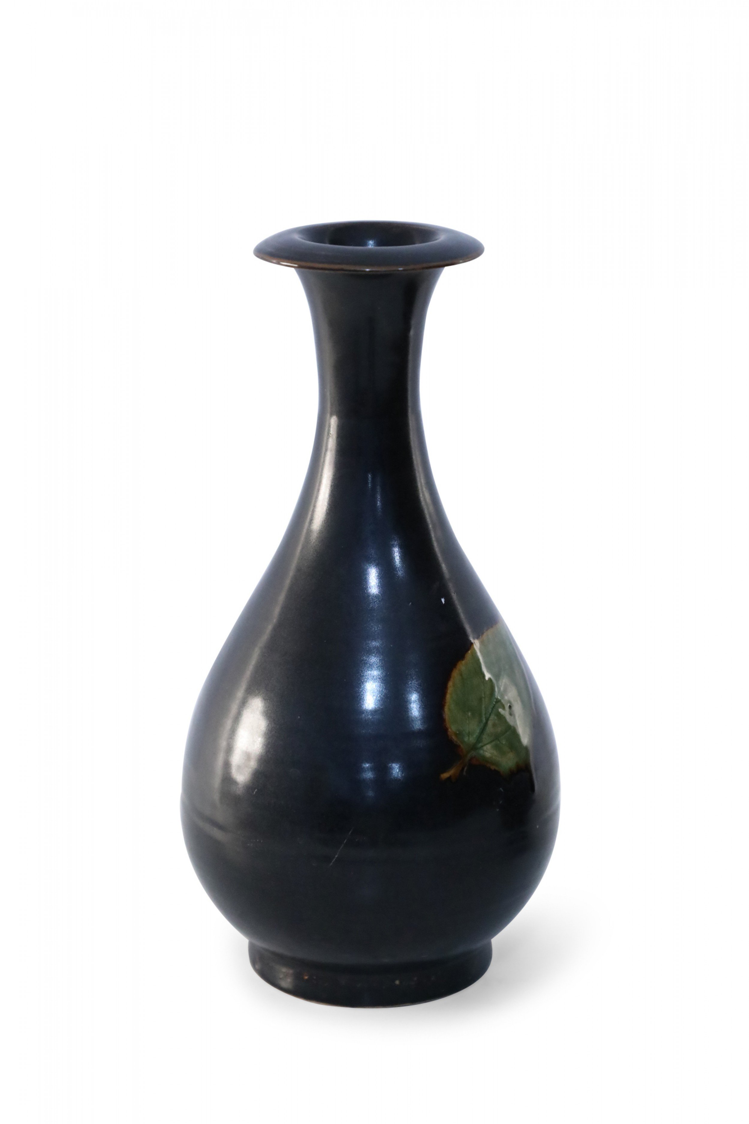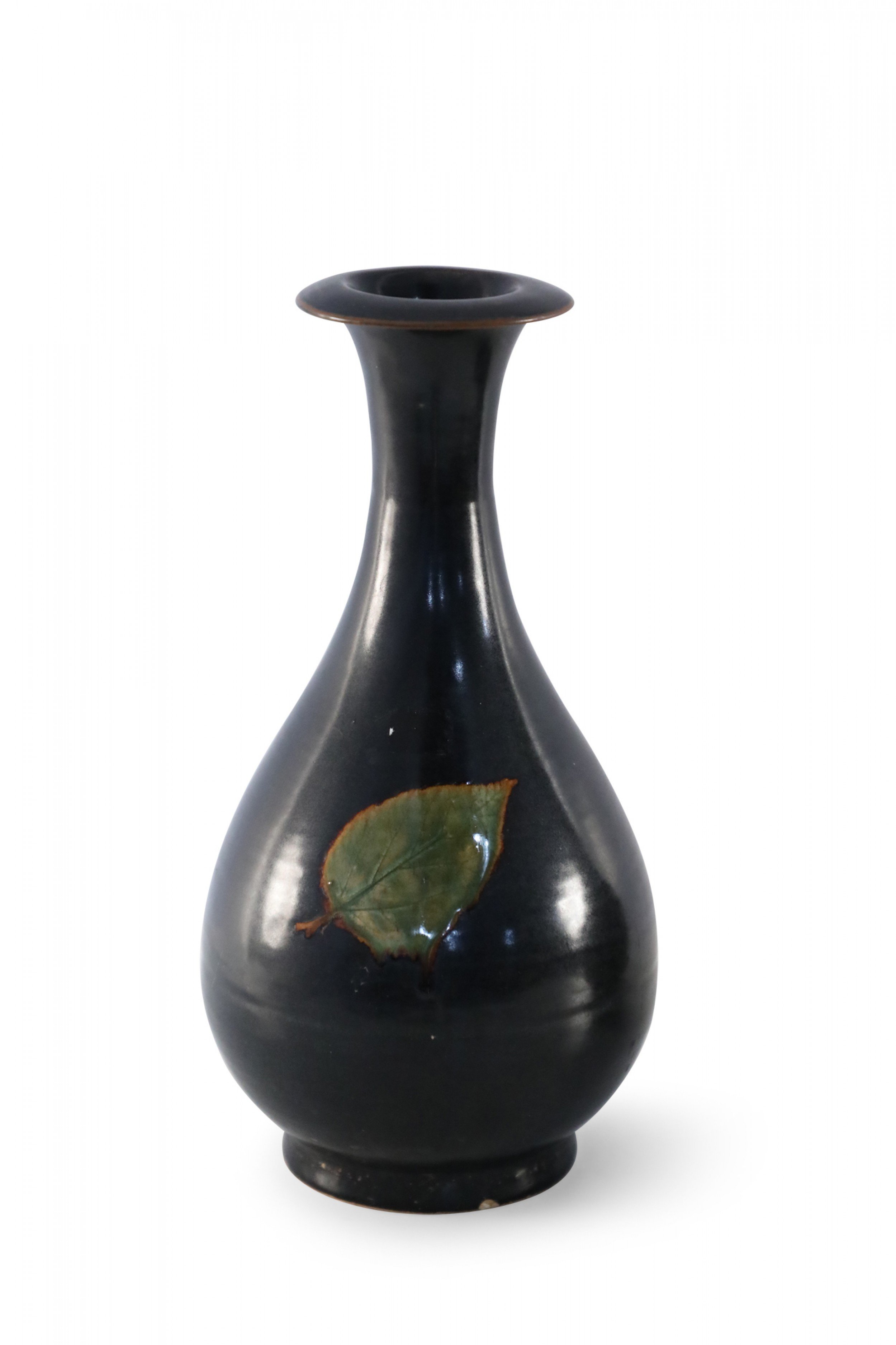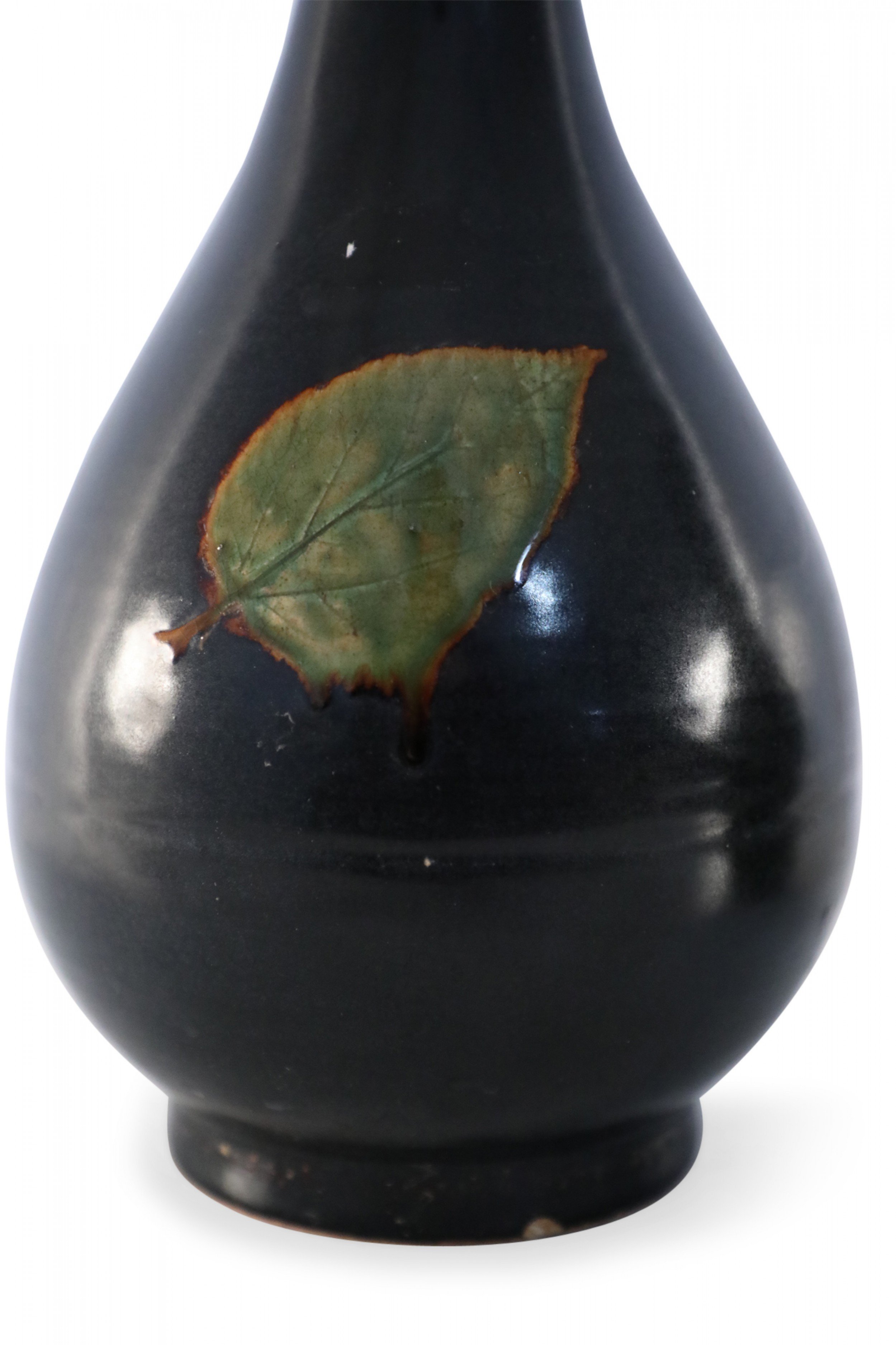 Chinese (17th Century-style) black glazed ceramic pear-shaped vase decorated with a green leaf on the front and back. (Similar piece: NWL2367)