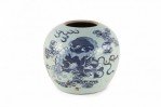 Chinese celadon porcelain vase painted with a blue dragon amid the clouds and made with a small mouth opening.