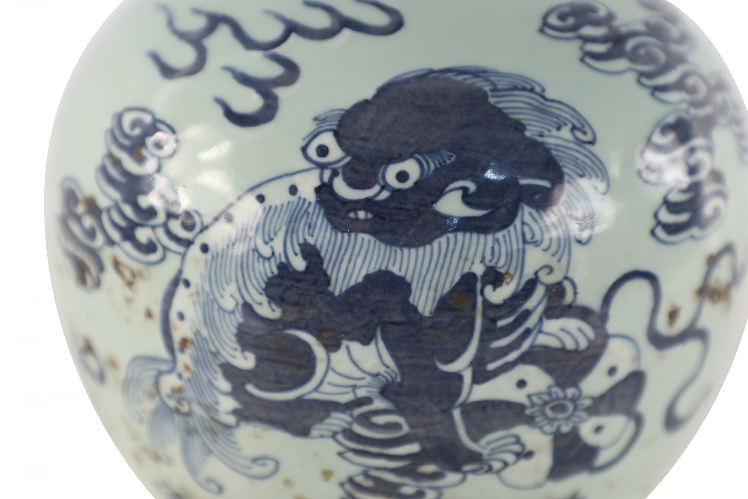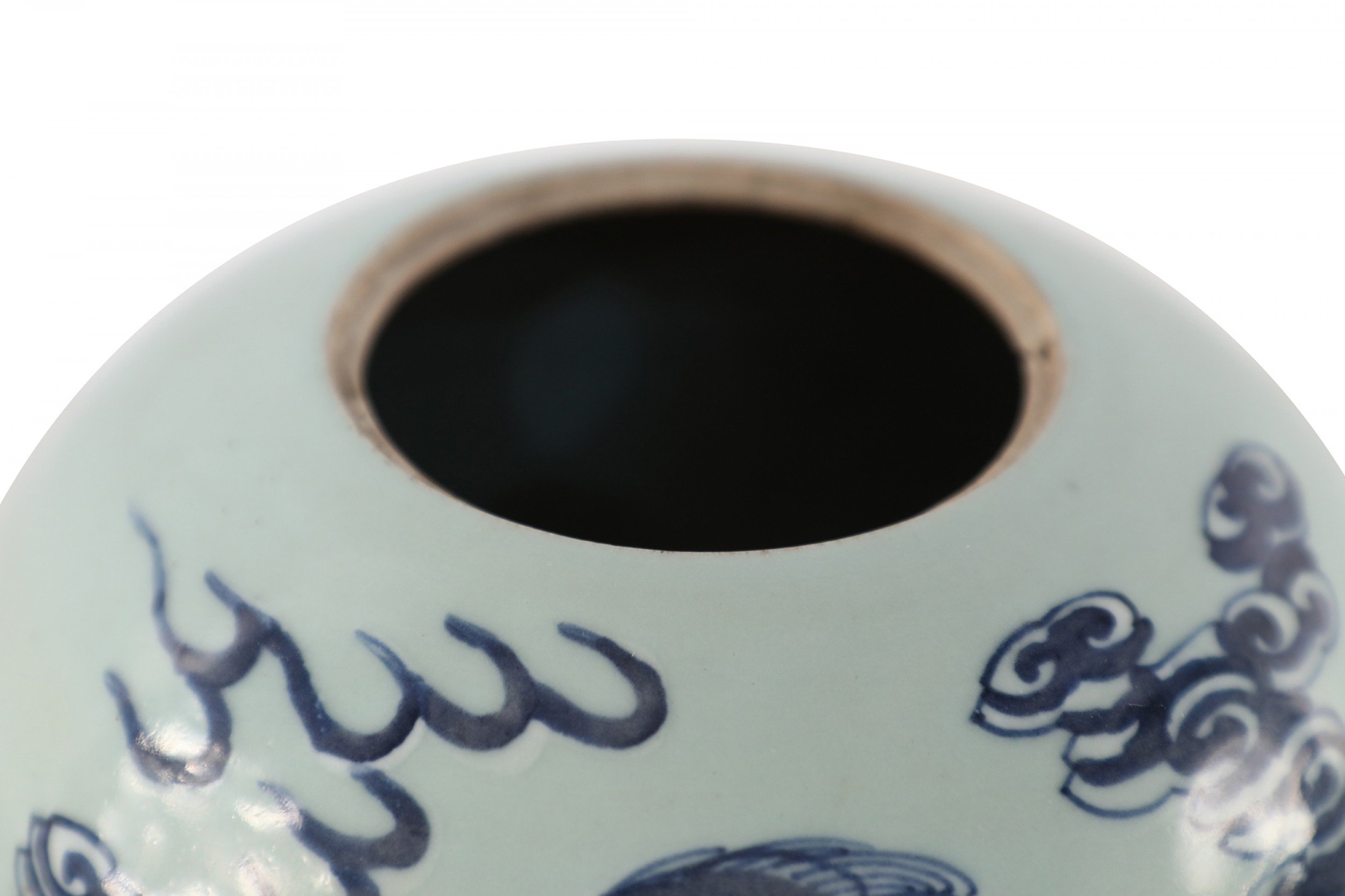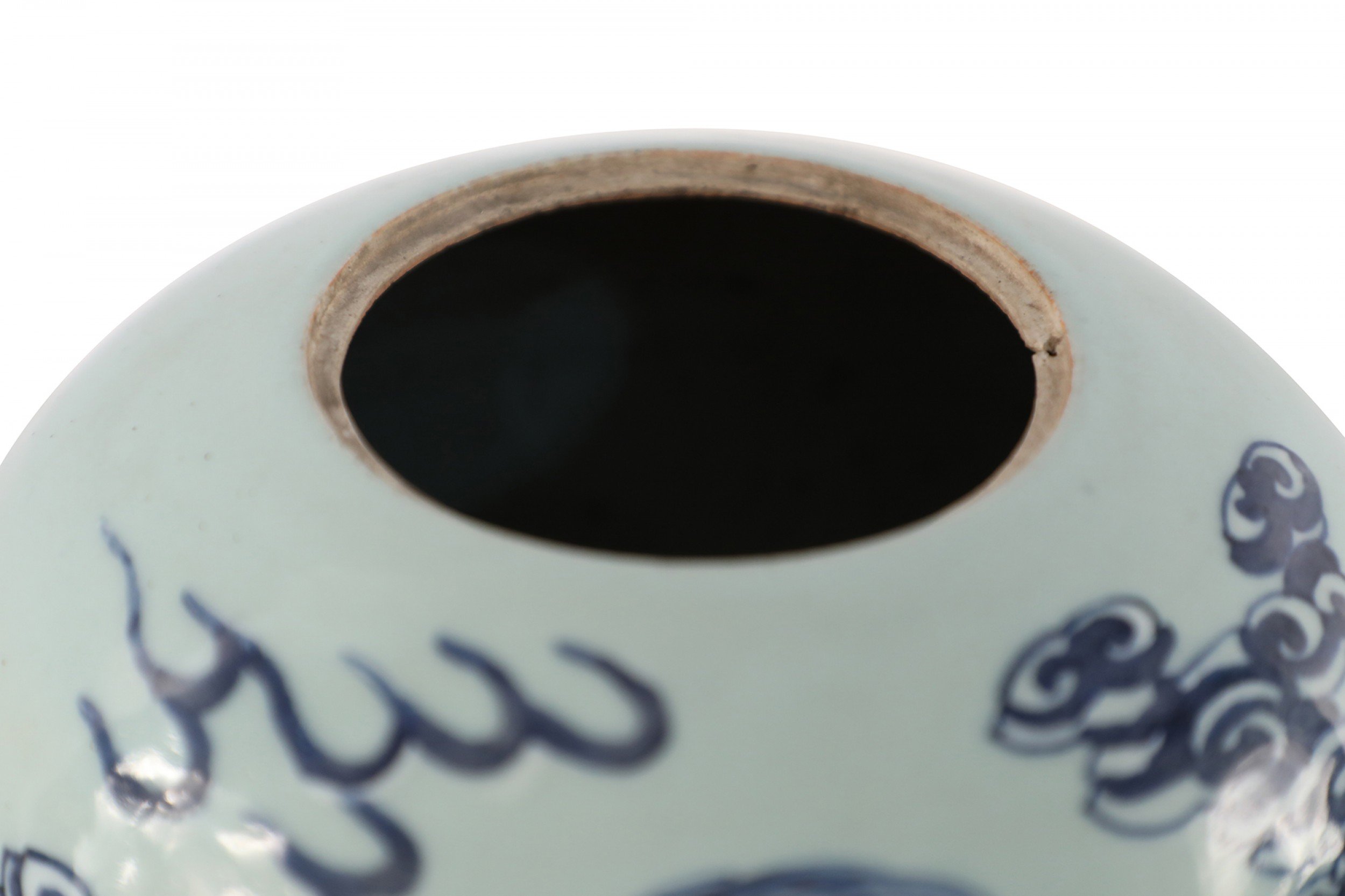 Chinese celadon porcelain vase painted with a blue dragon amid the clouds and made with a small mouth opening..