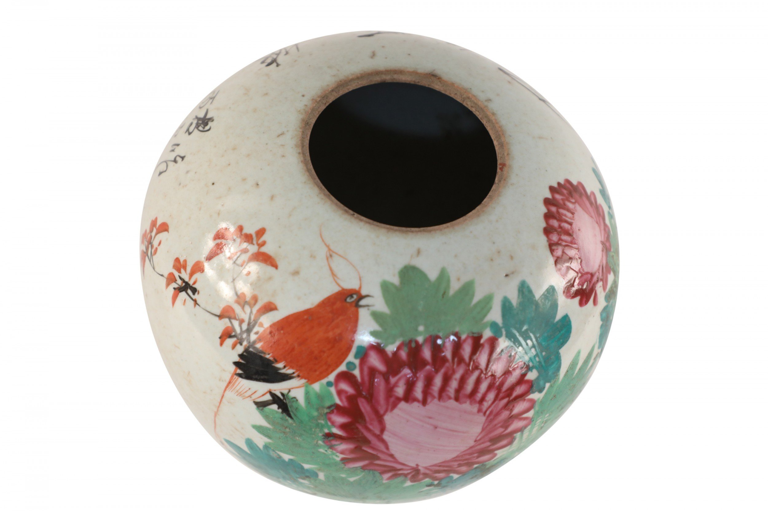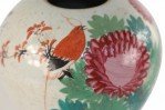 Chinese cream porcelain vase decorated with softly rendered pink florals blooming from green leaves alongside an orange bird on one side, and character script on the reverse..