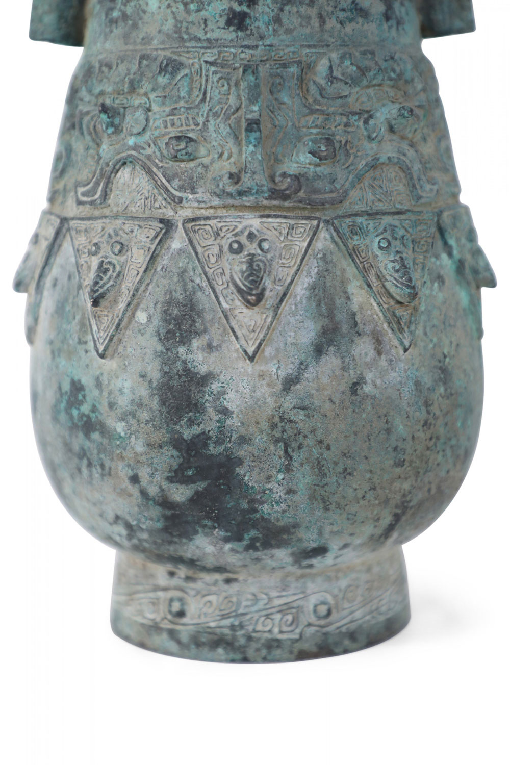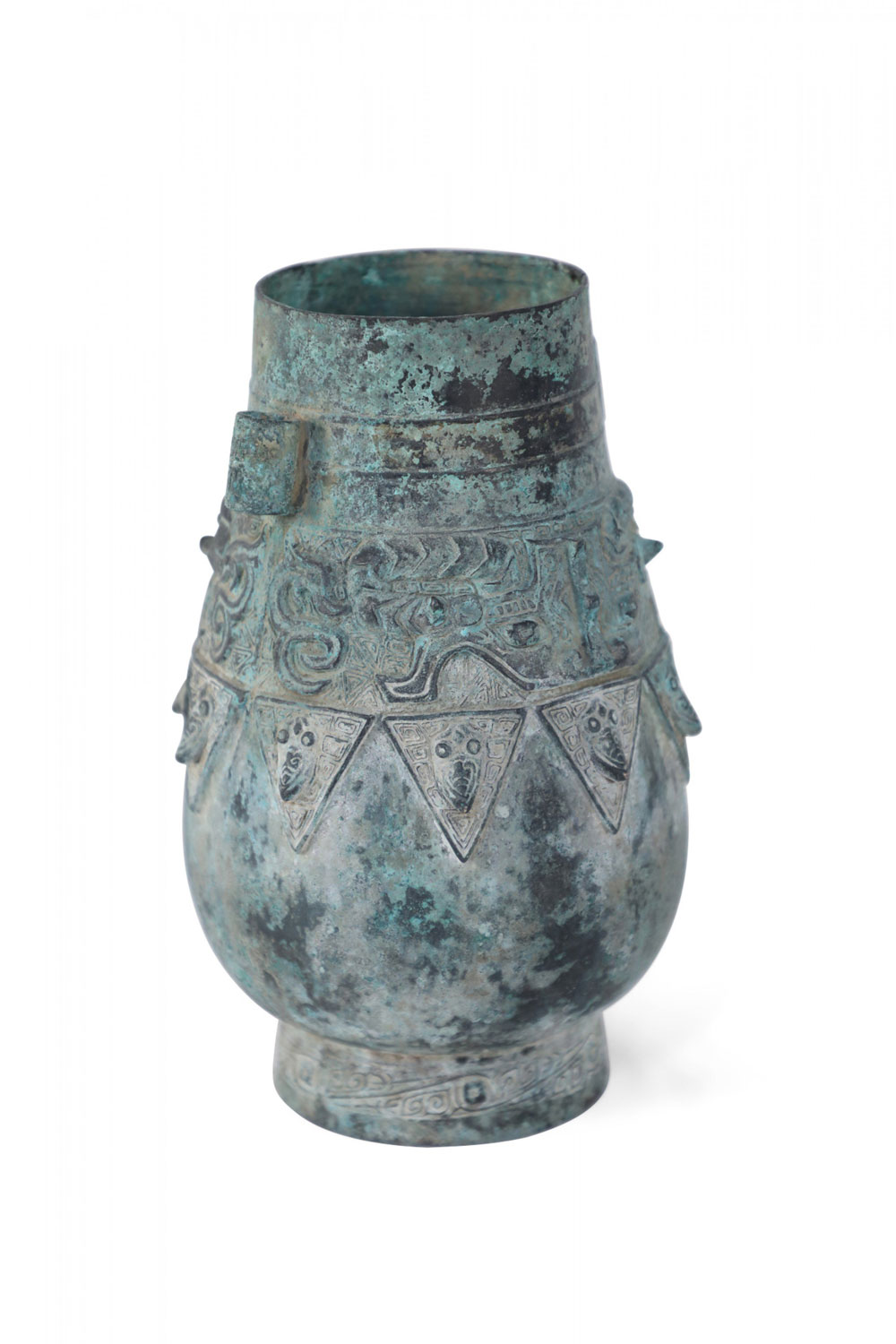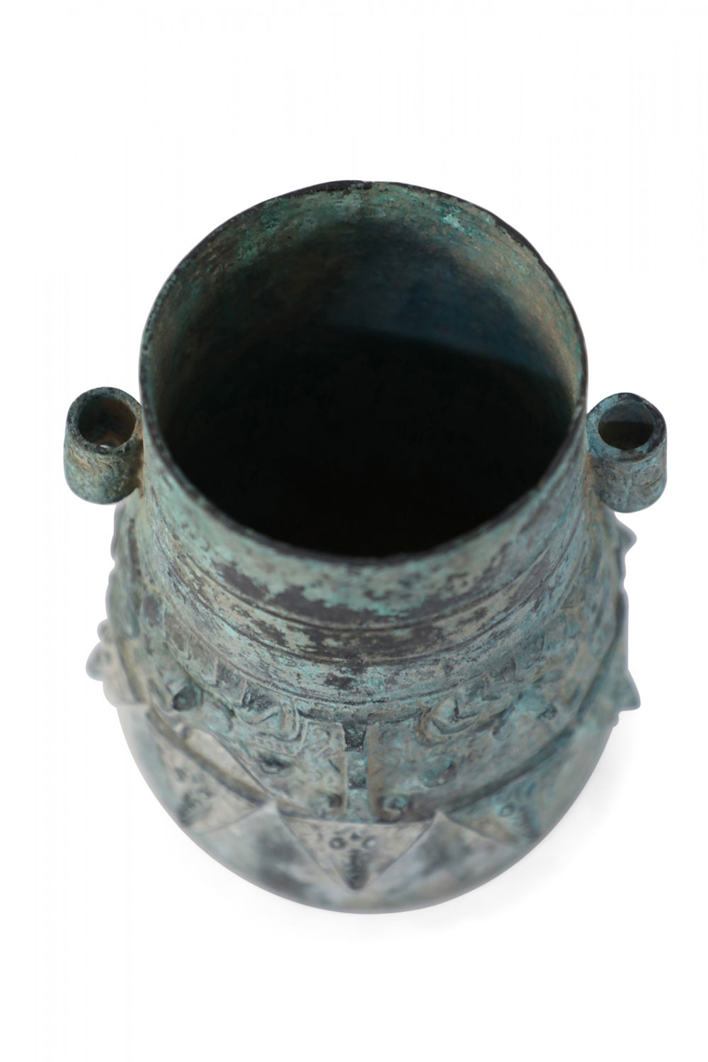 Antique Chinese Han Dynasty-style copy of a patinated bronze vase with a bulbous body decorated in raised geometric pattern bands, sitting atop a circular base, and accented with two lug ears on the sides..