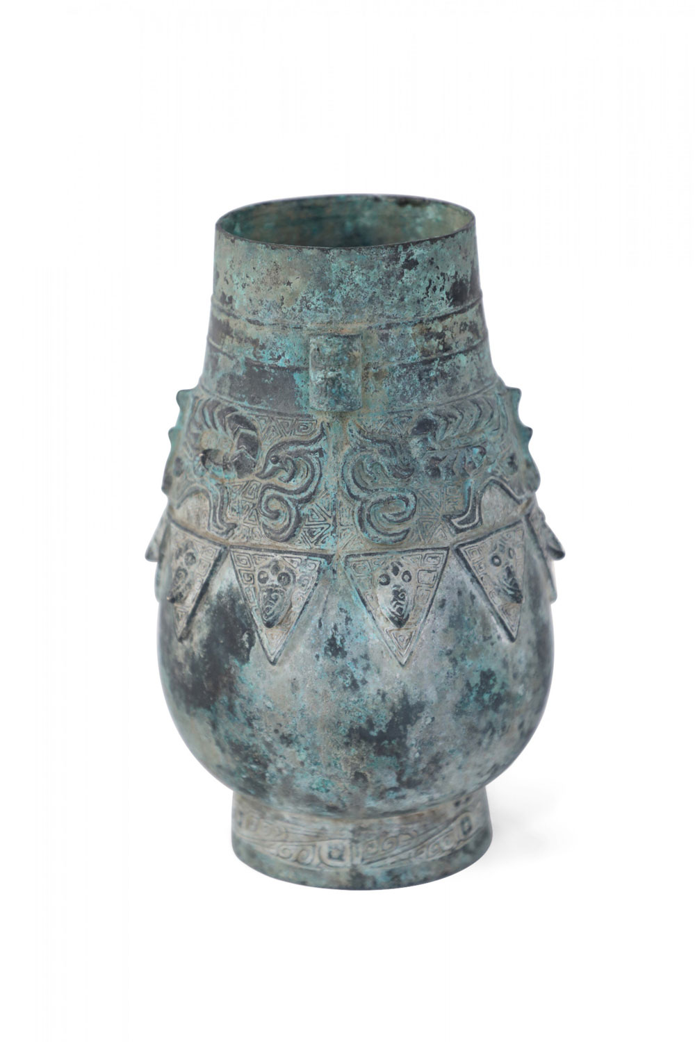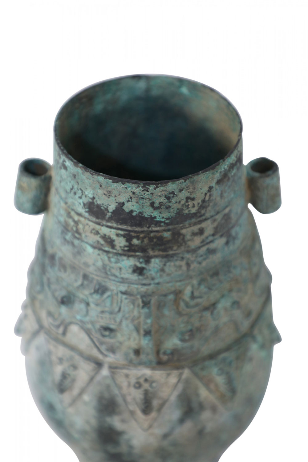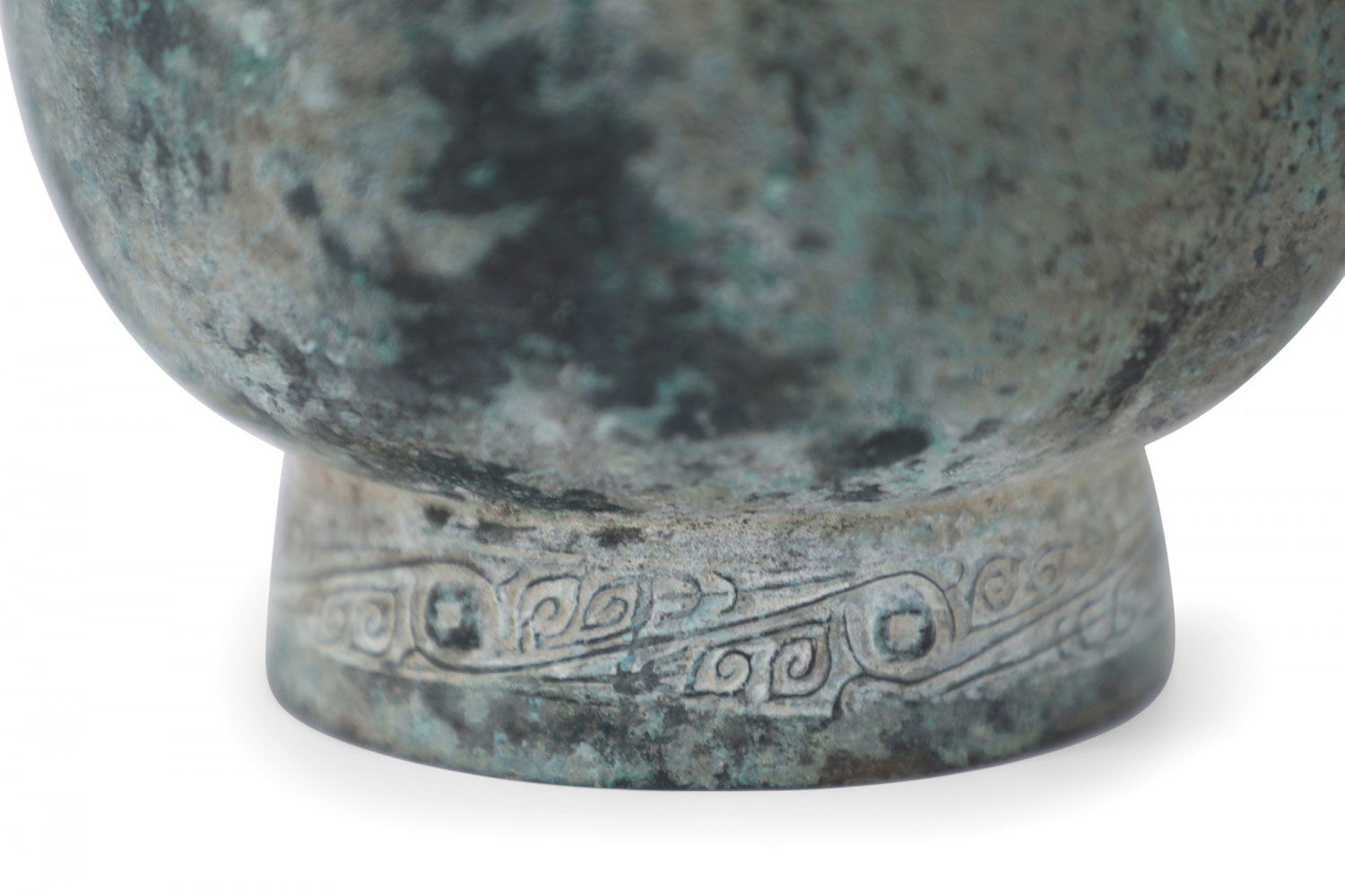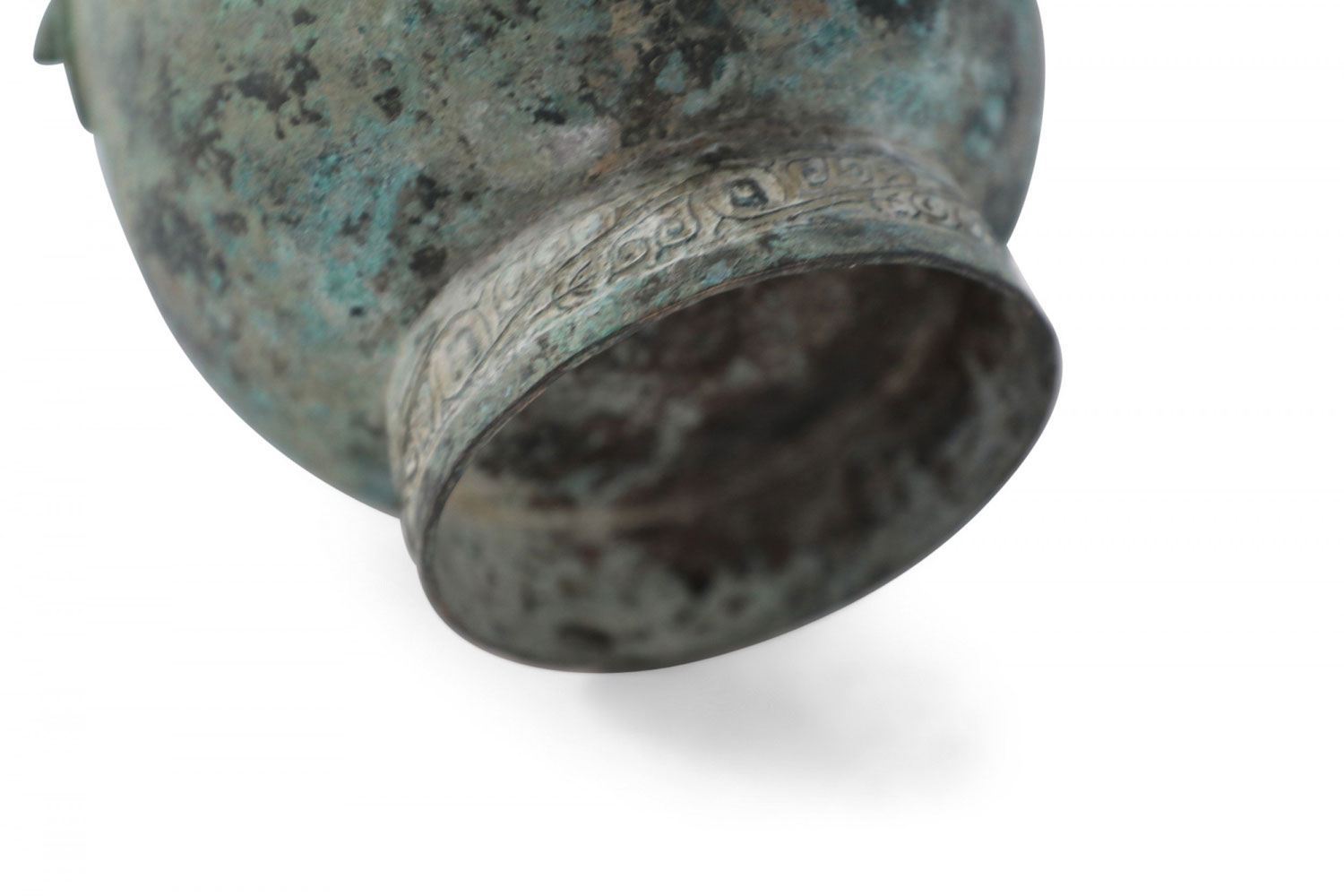 Antique Chinese Han Dynasty-style copy of a patinated bronze vase with a bulbous body decorated in raised geometric pattern bands, sitting atop a circular base, and accented with two lug ears on the sides..