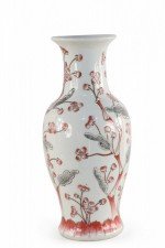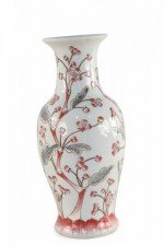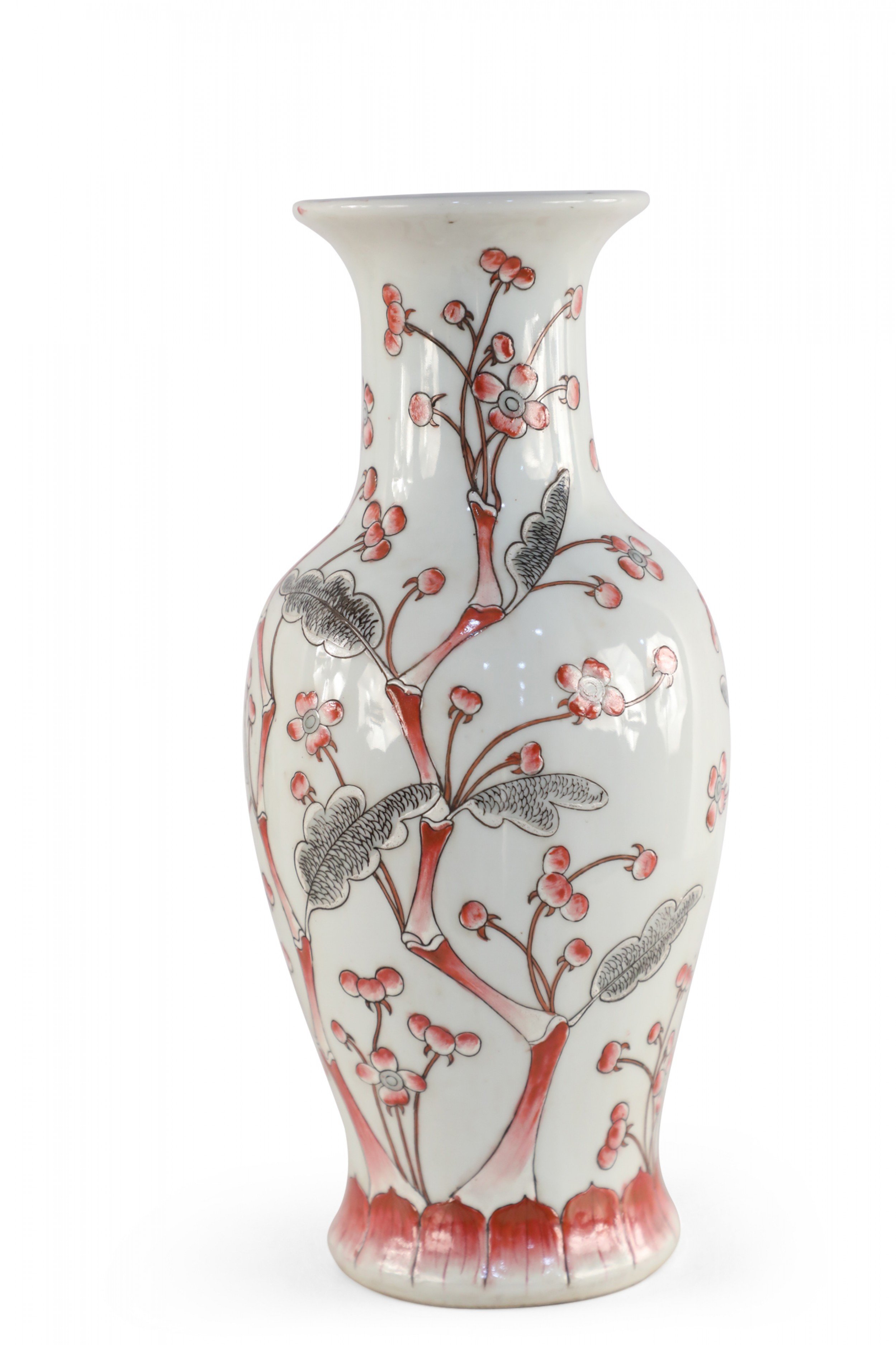 Chinese light gray porcelain vase with a flowering red and gray cherry blossom tree stretching up its urn-shaped form..