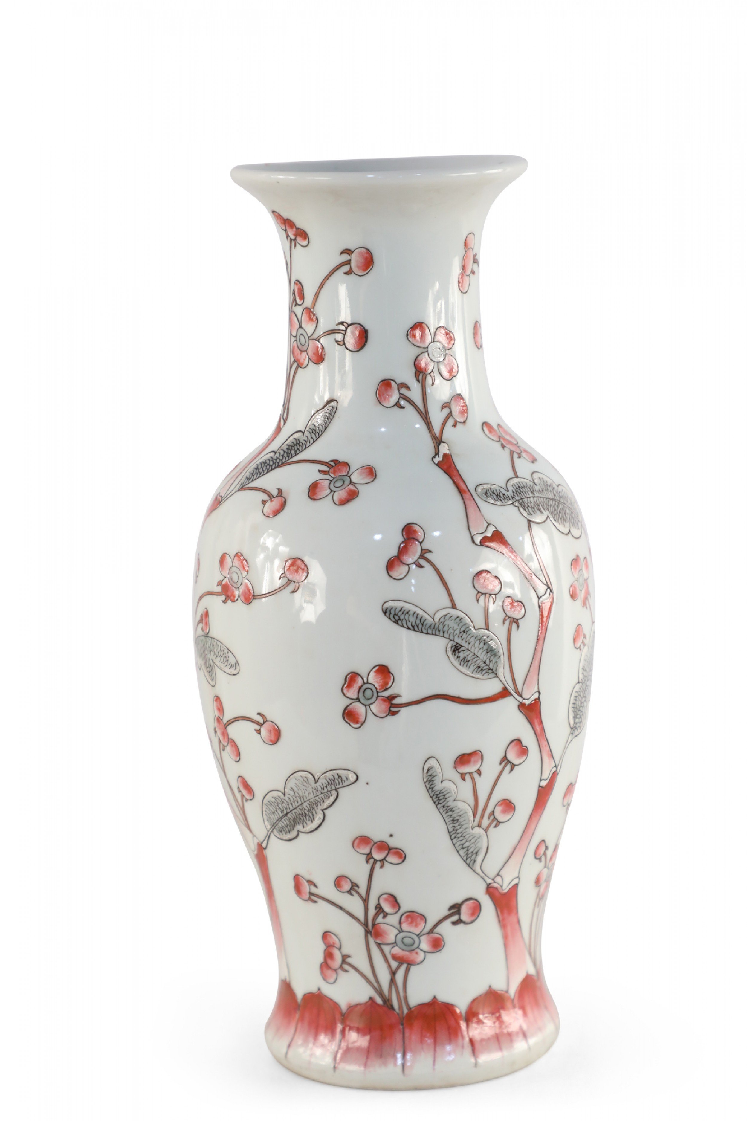 Chinese light gray porcelain vase with a flowering red and gray cherry blossom tree stretching up its urn-shaped form.