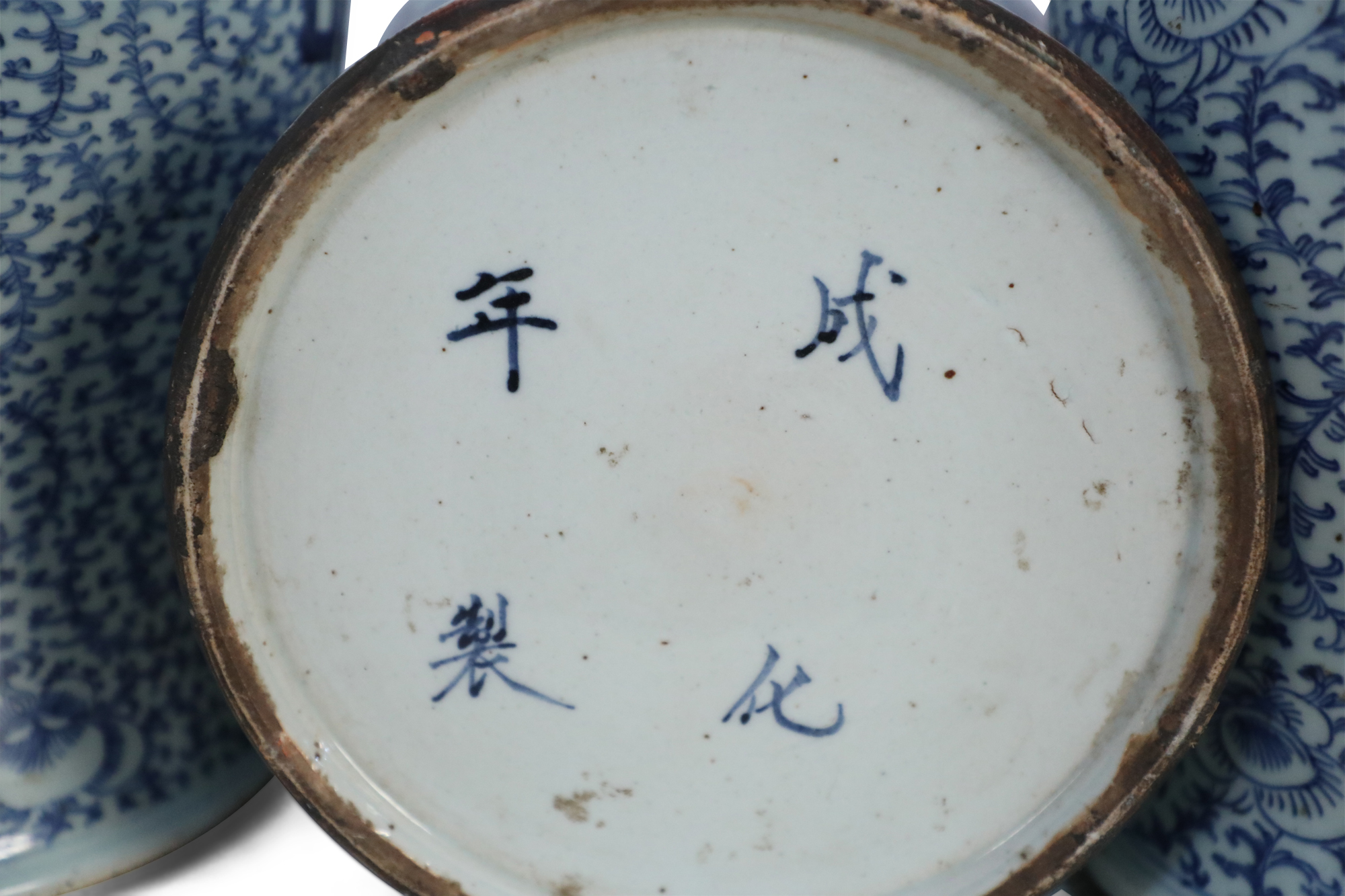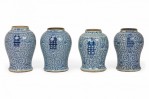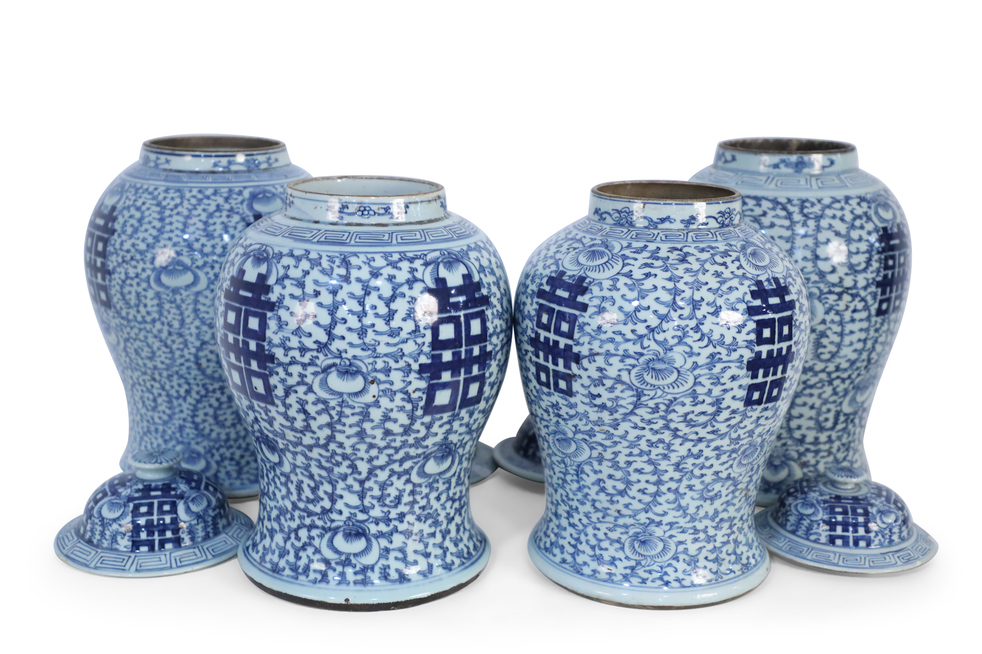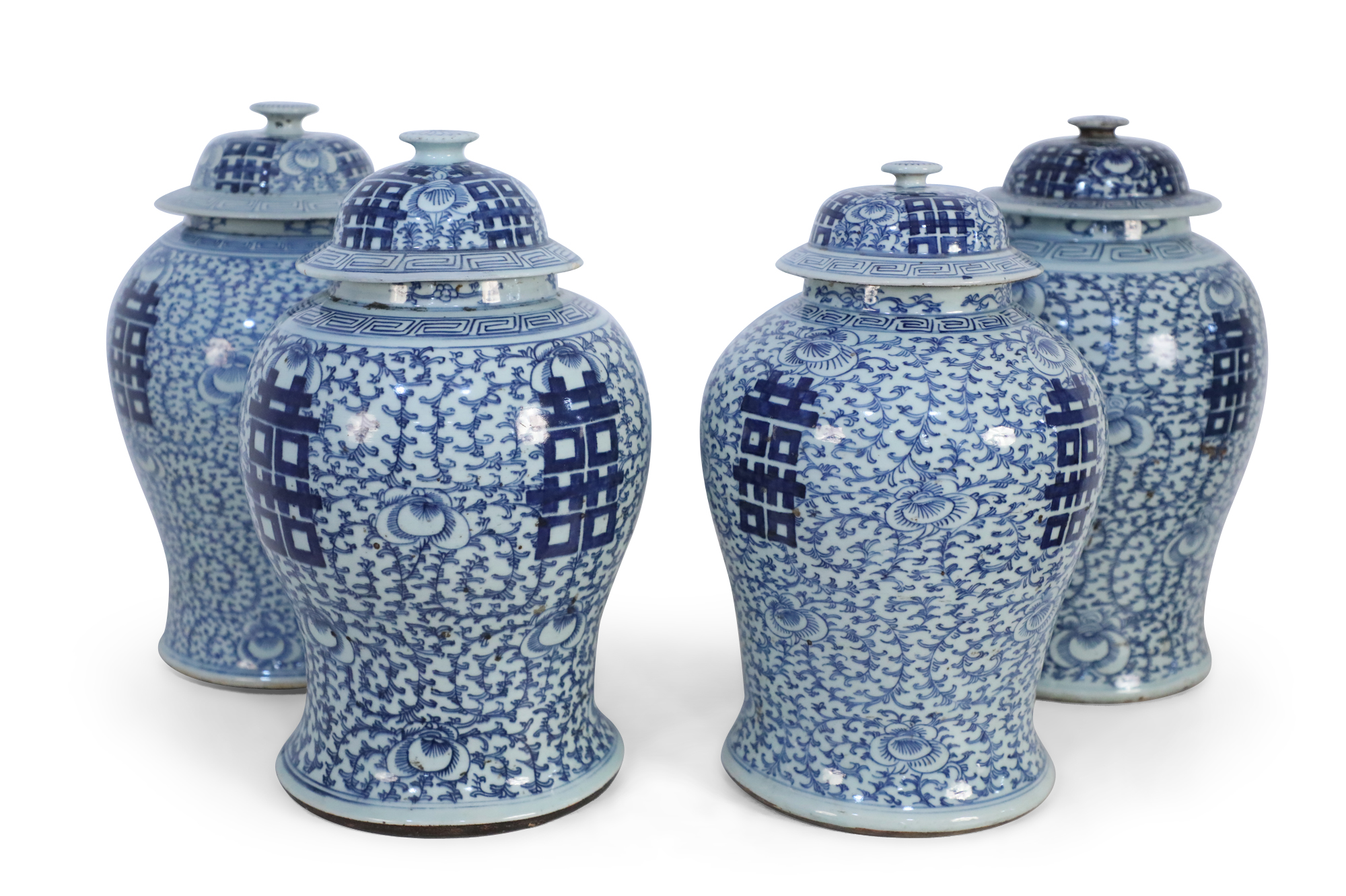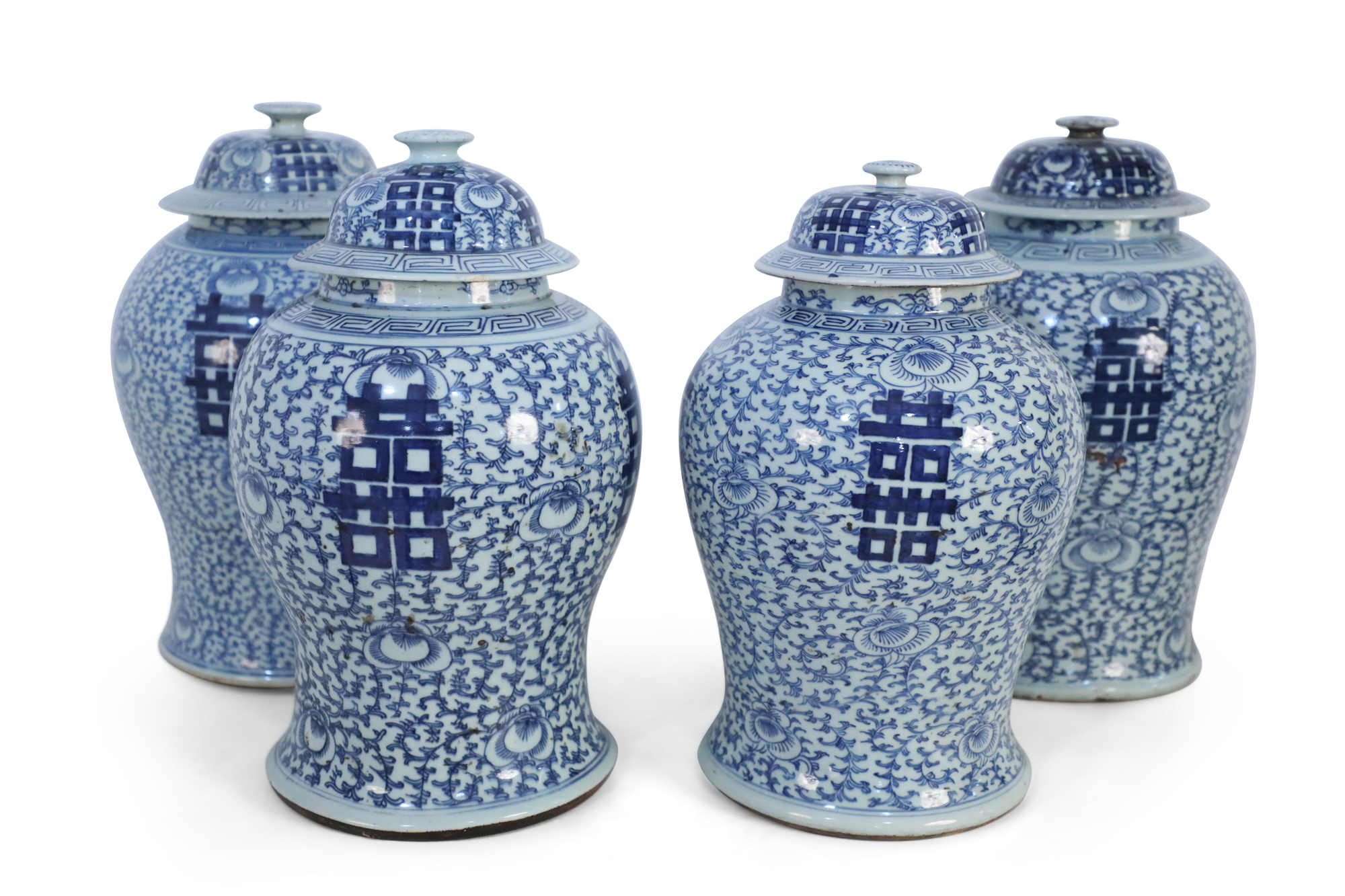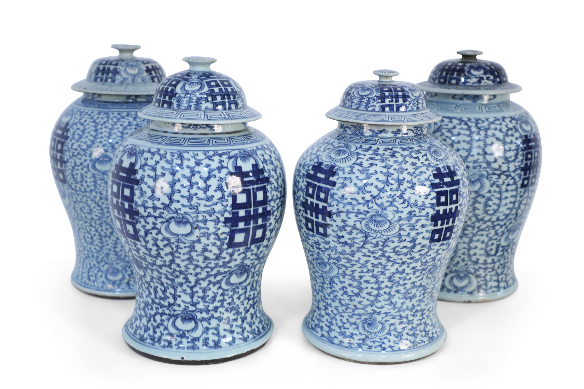 4 Antique Chinese (Early 20th Century) lidded porcelain ginger jars with a swirling light blue dense vines and spaced floral motifs against off-white backgrounds, and bold blue characters on 4 sides and the lids. (PRICED EACH)(Vases vary slightly)