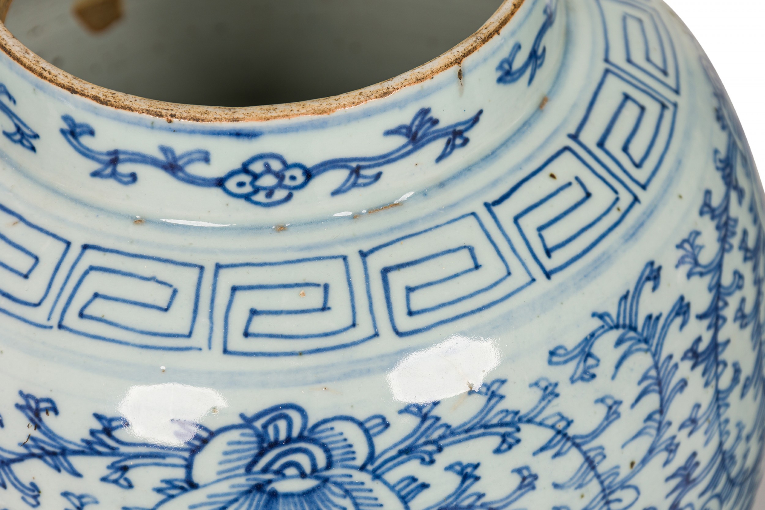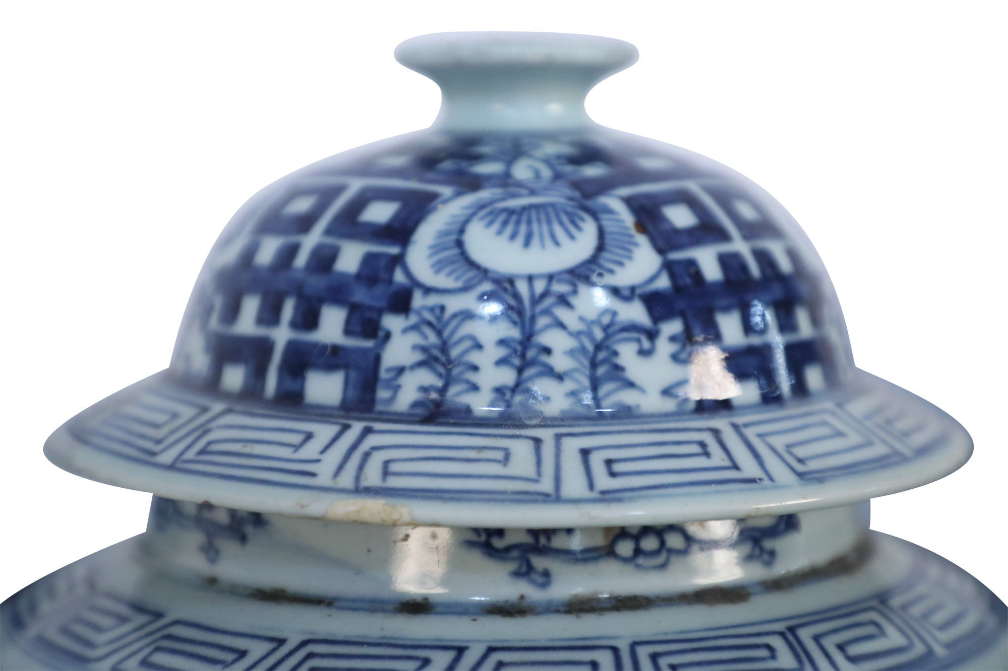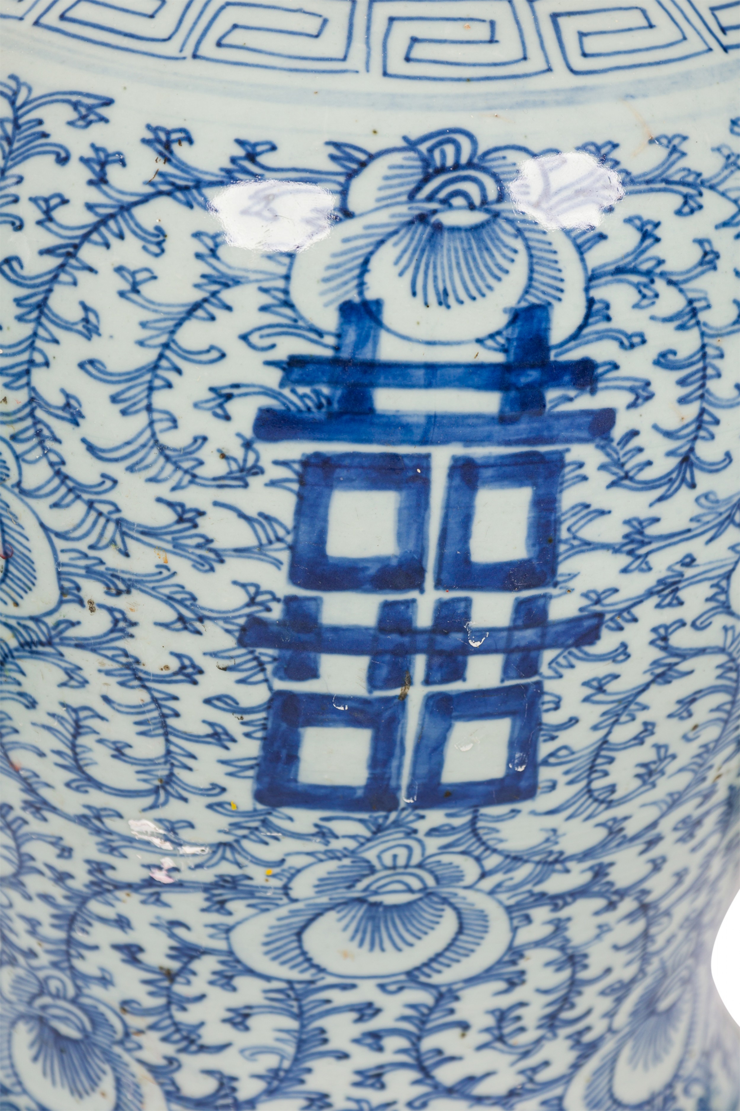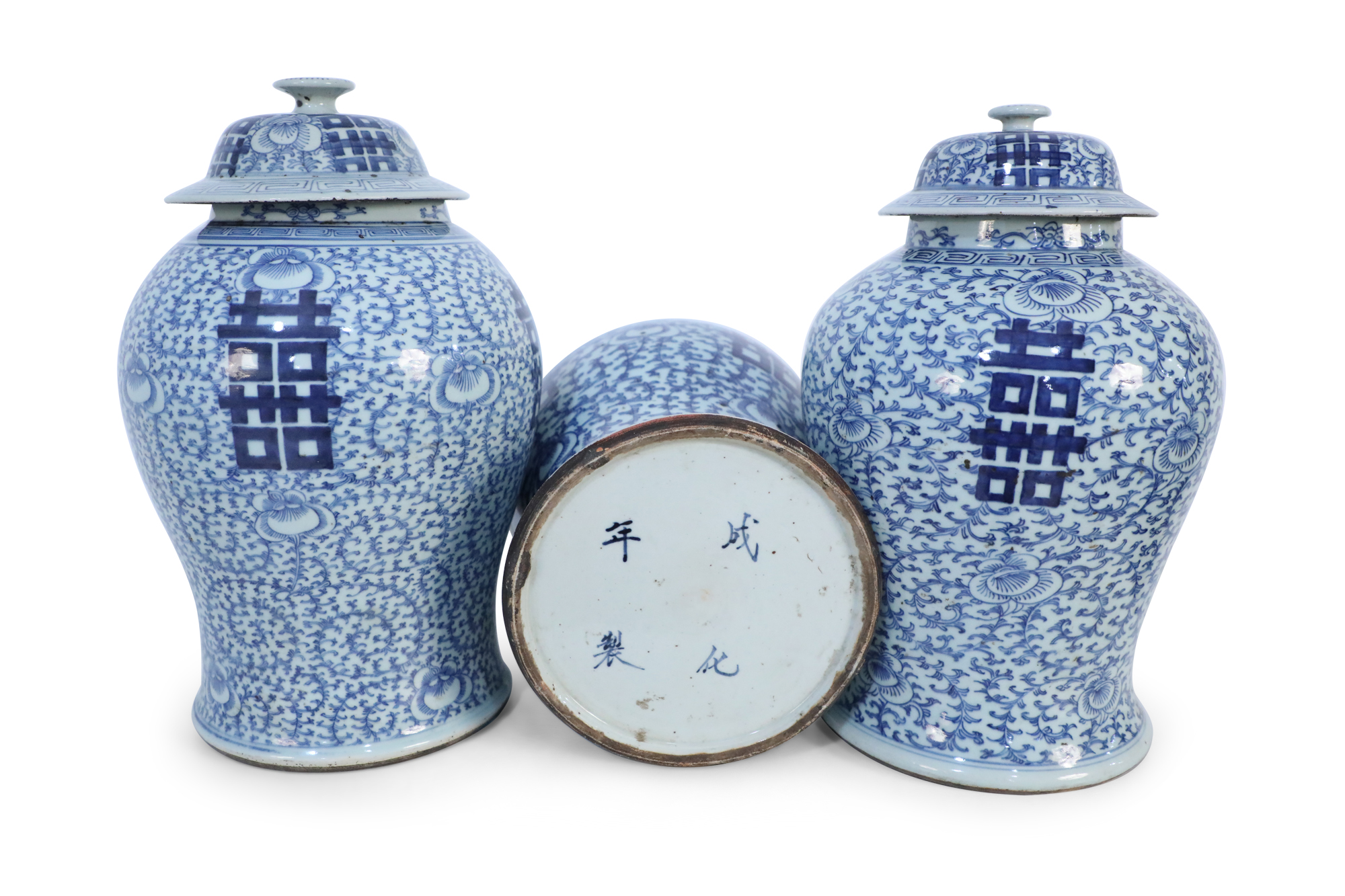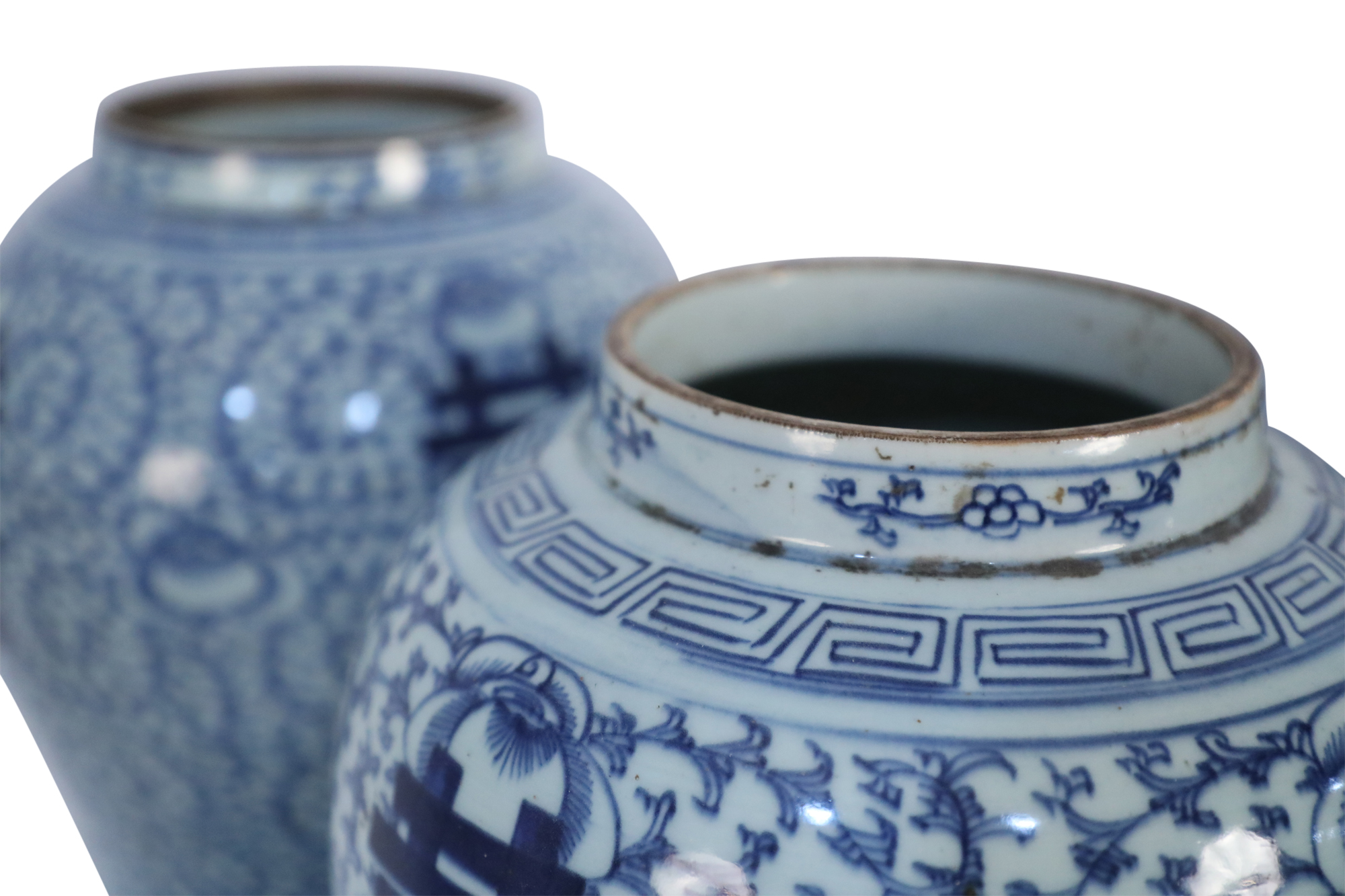 4 Antique Chinese (Early 20th Century) lidded porcelain ginger jars with a swirling light blue dense vines and spaced floral motifs against off-white backgrounds, and bold blue characters on 4 sides and the lids. (PRICED EACH)(Vases vary slightly)
