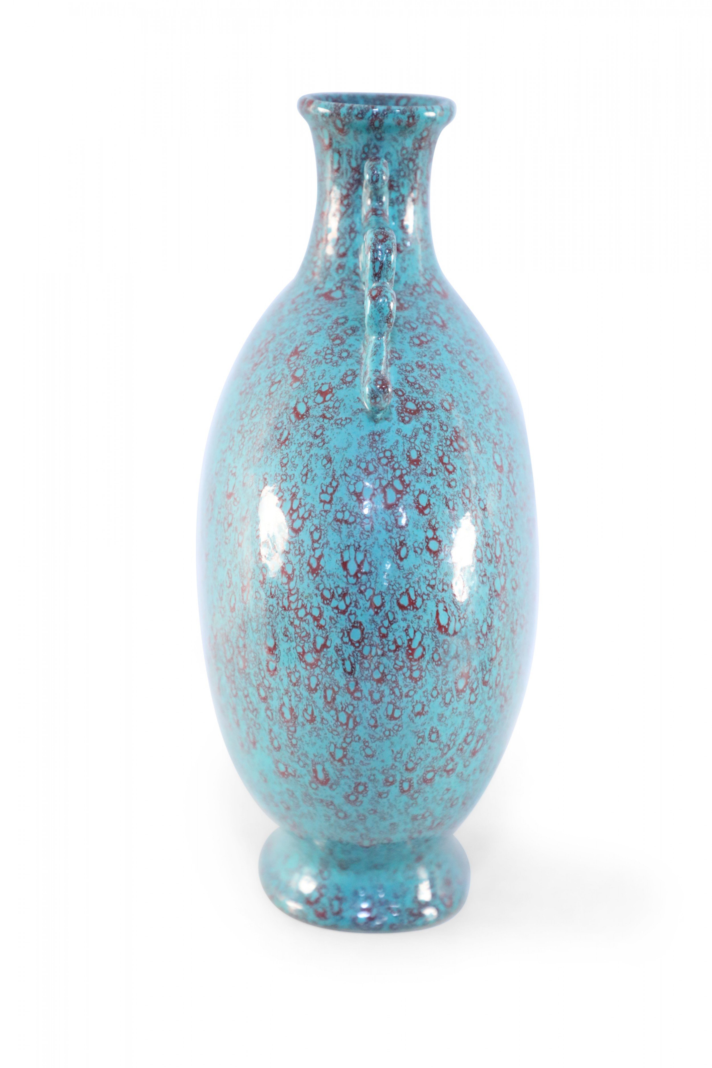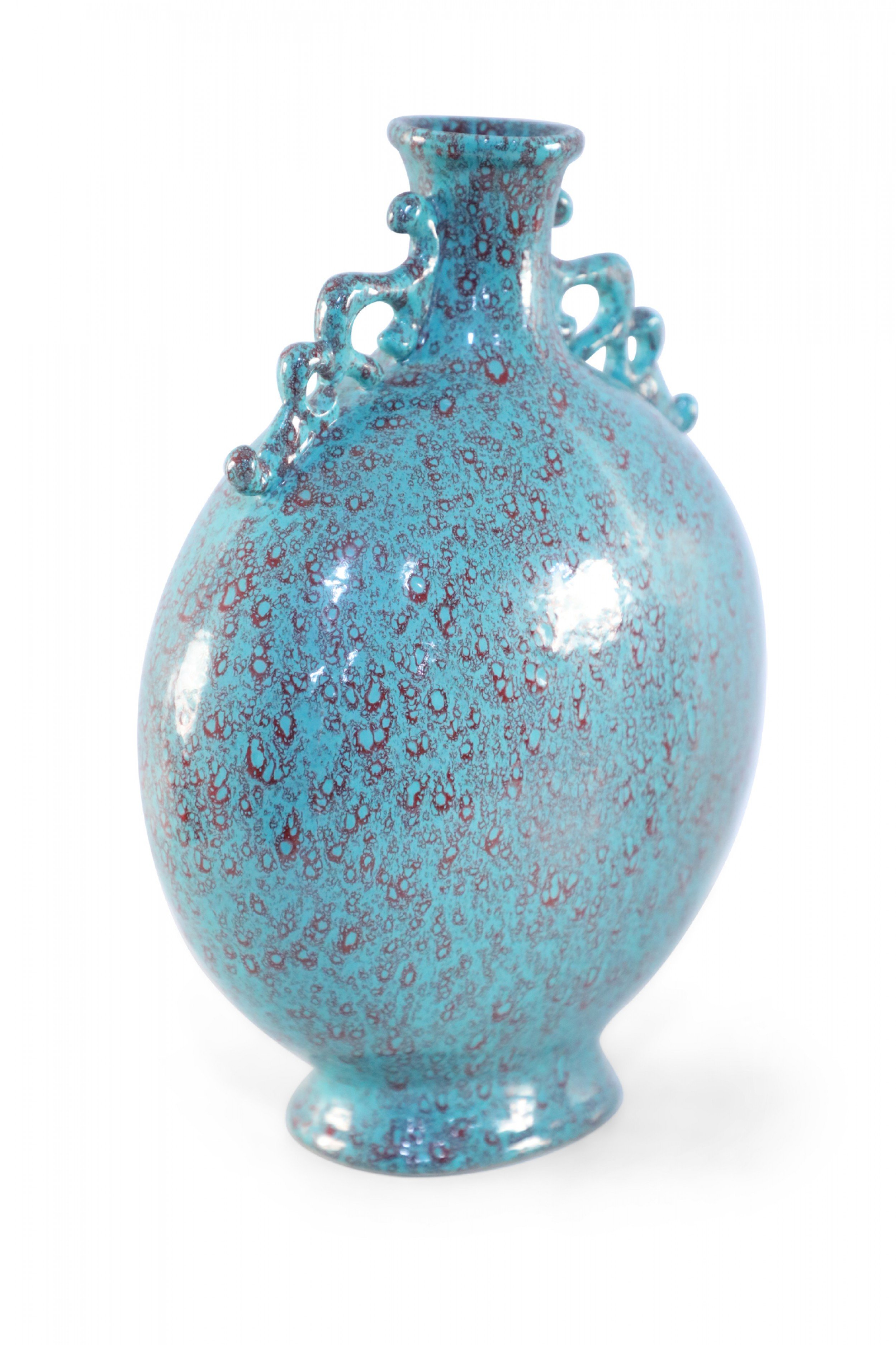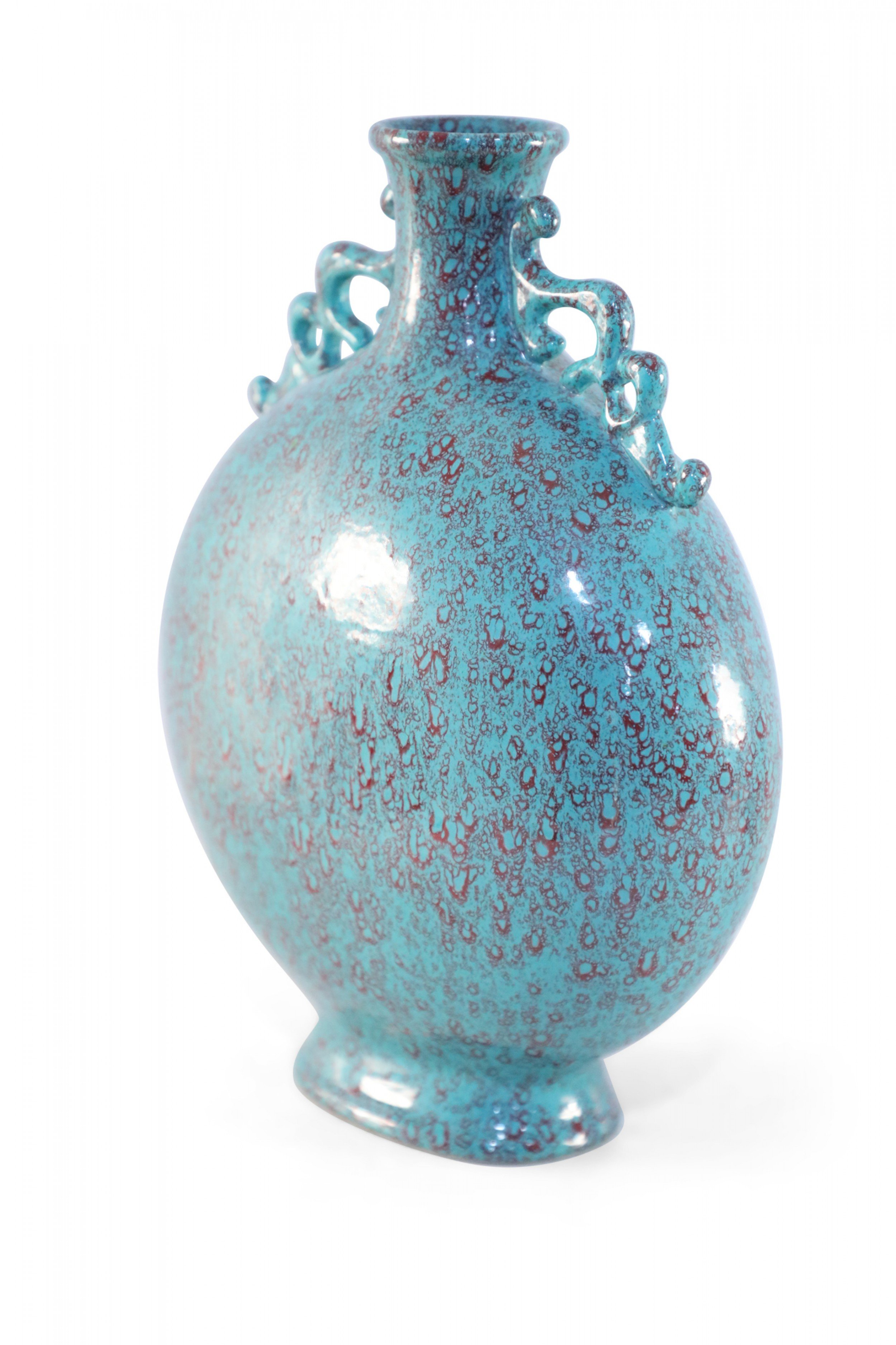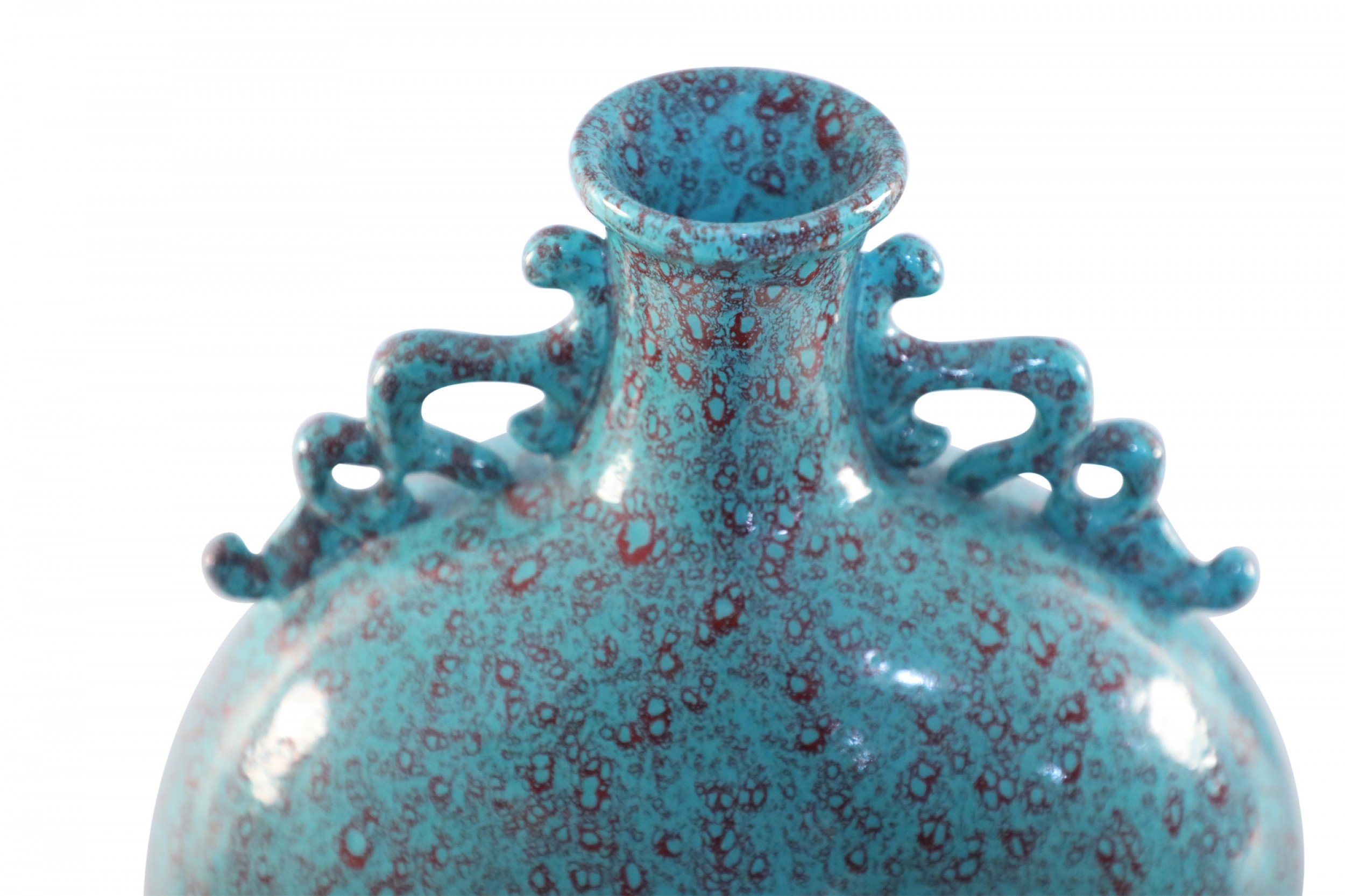 Antique Chinese (Late 19th Century) teal moon flask porcelain vase decorated with a red crackle overlay and topped with two stepped handles (mark on bottom, see photos)..