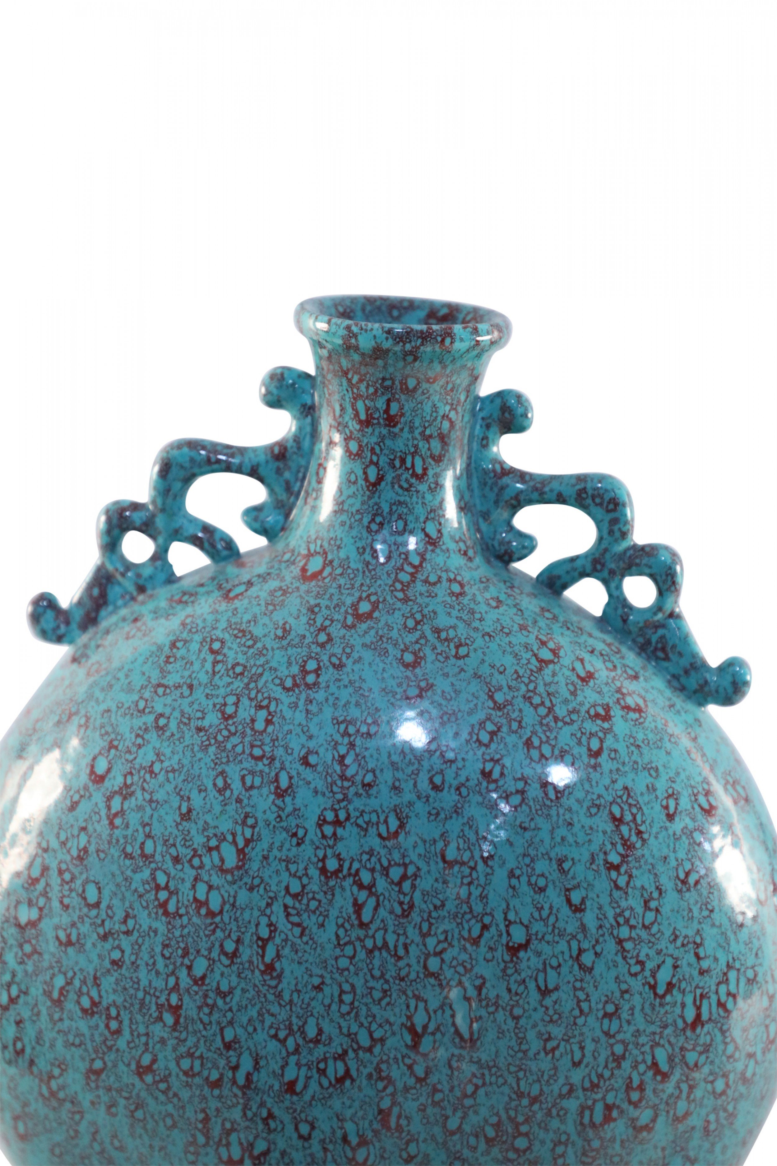 Antique Chinese (Late 19th Century) teal moon flask porcelain vase decorated with a red crackle overlay and topped with two stepped handles (mark on bottom, see photos).