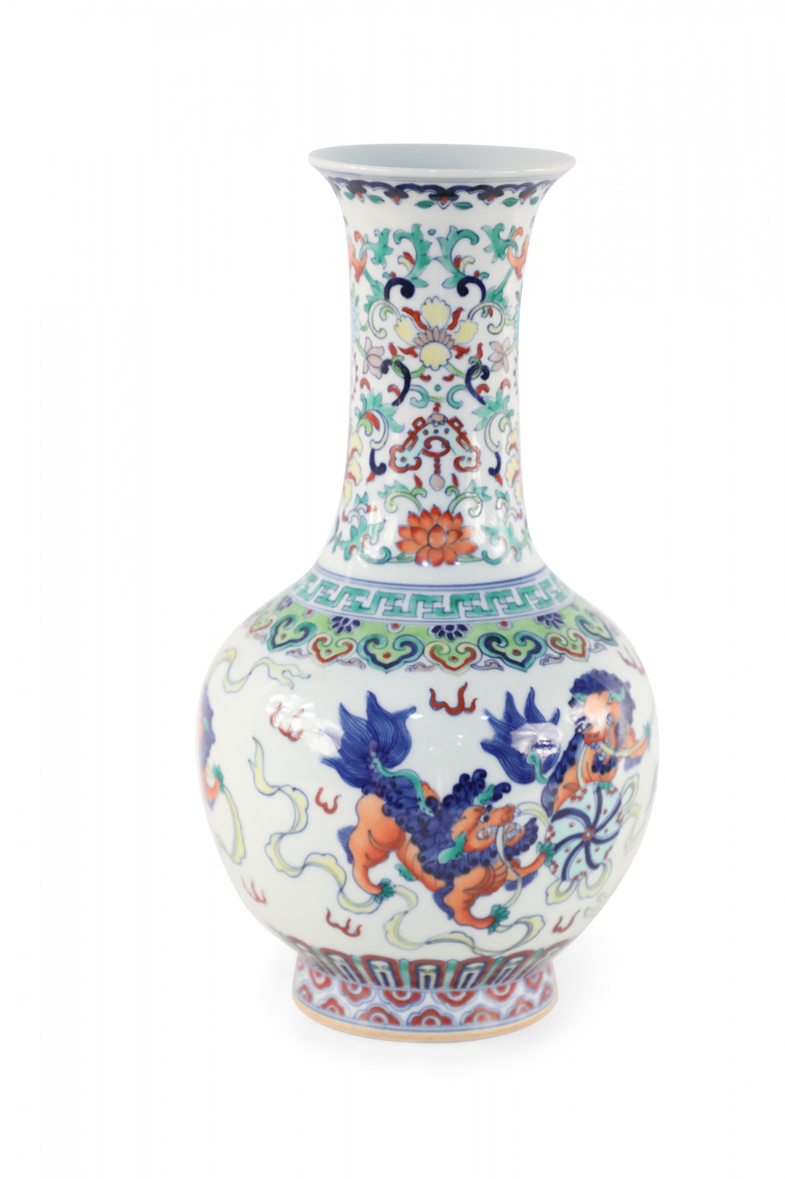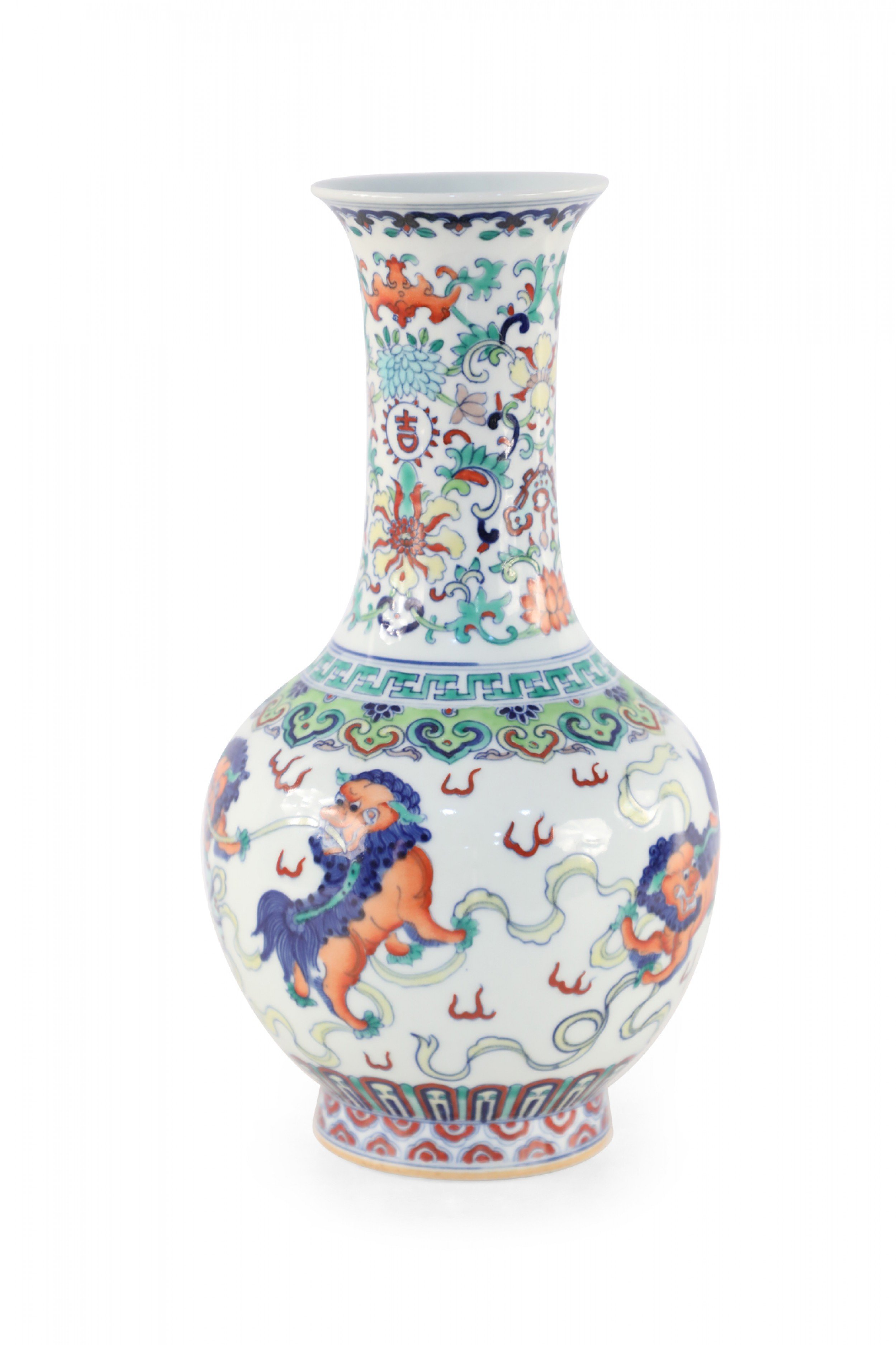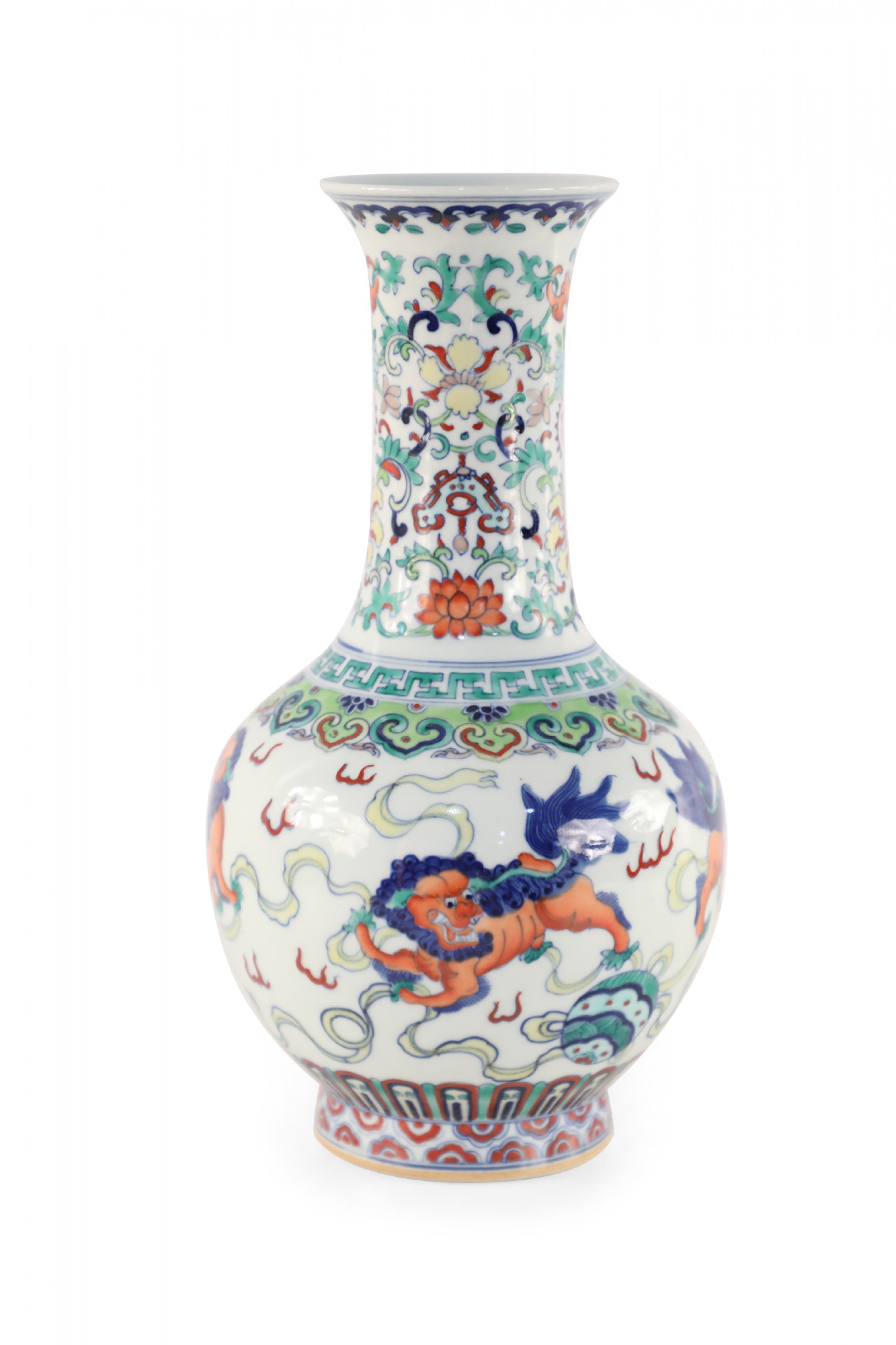 Chinese (late 19th Century) white, globular porcelain vase with colorful kylin beasts, symbolizing good luck, amid geometric and floral designs..