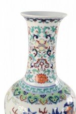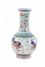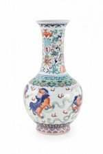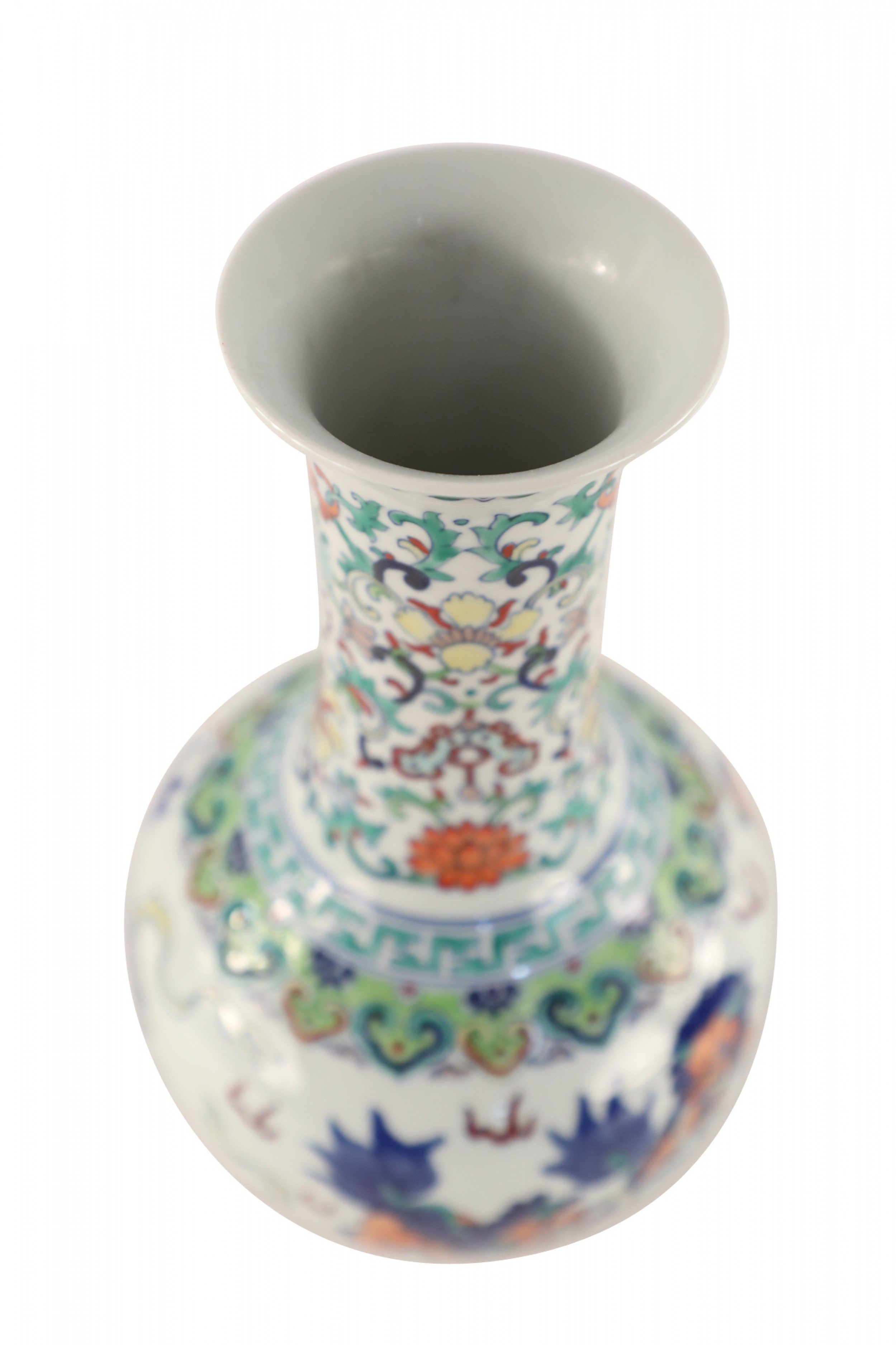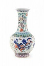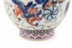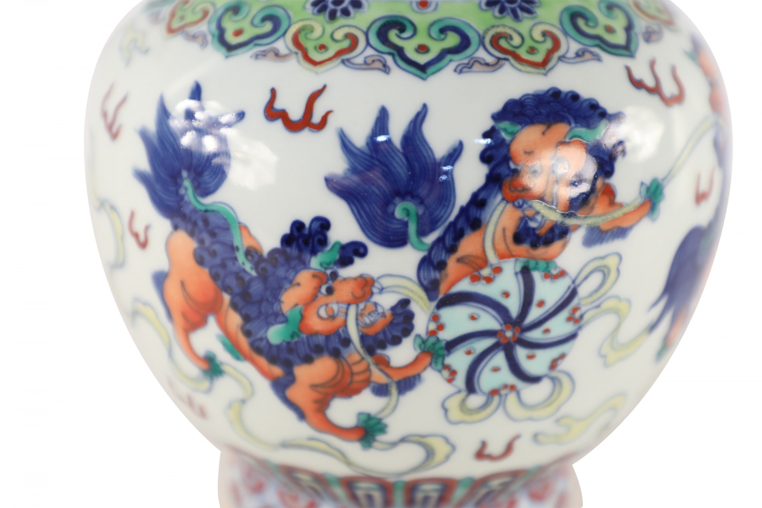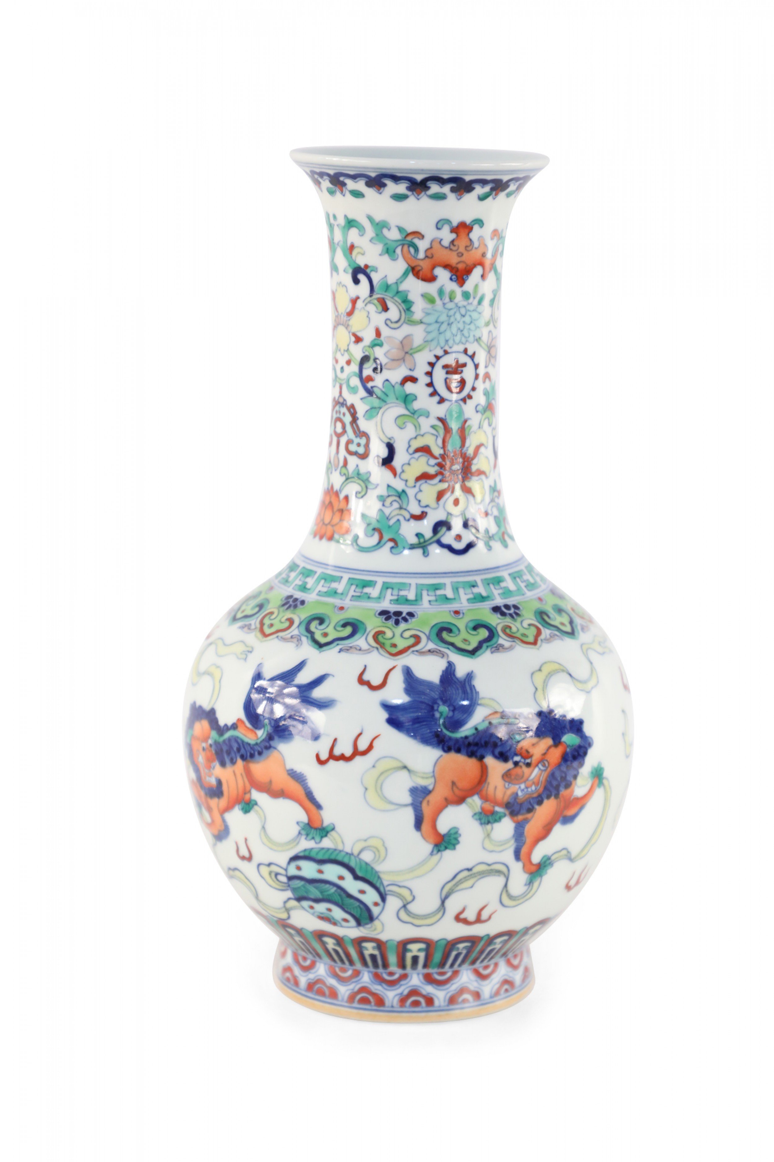 Chinese (late 19th Century) white, globular porcelain vase with colorful kylin beasts, symbolizing good luck, amid geometric and floral designs..