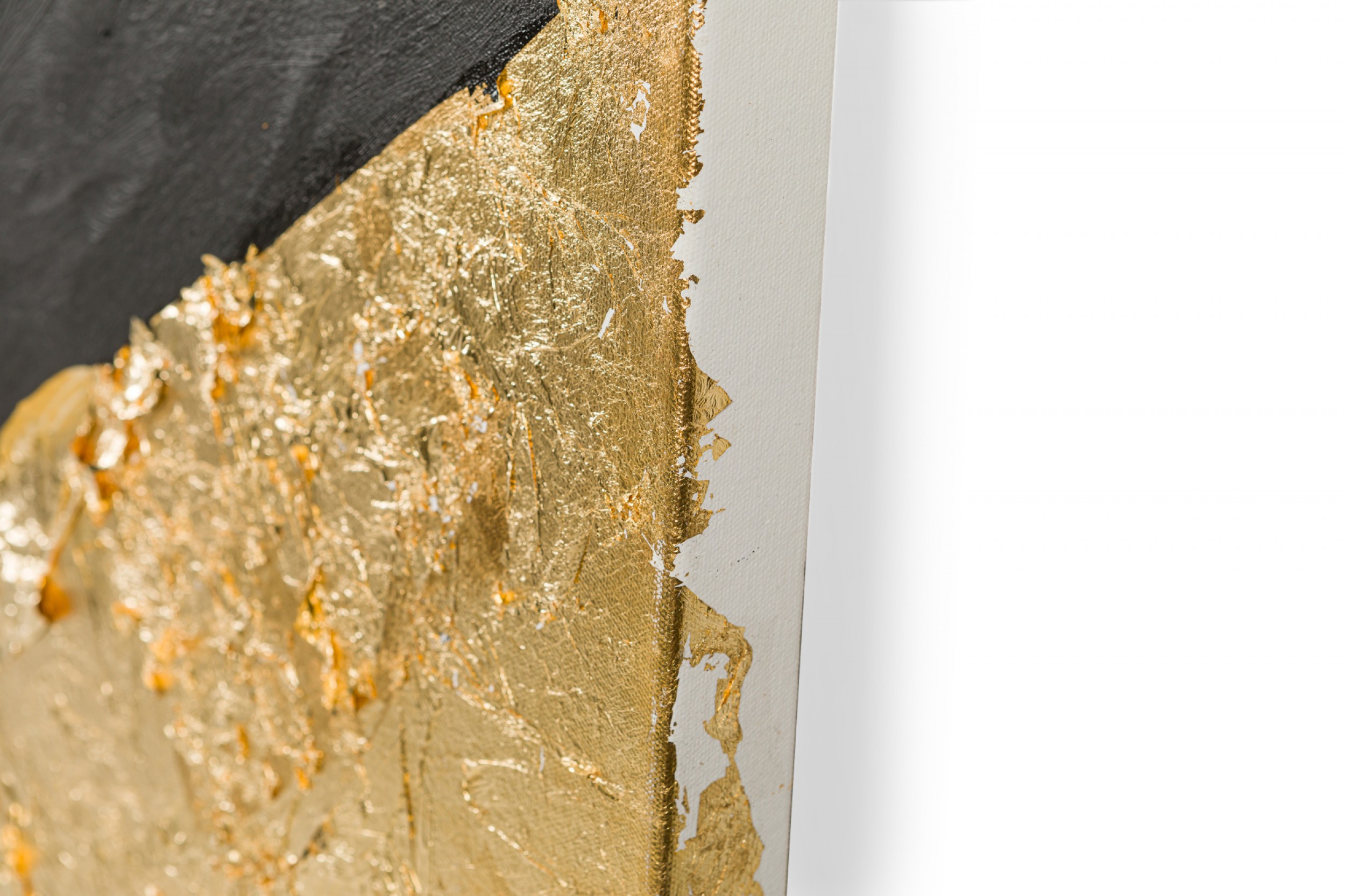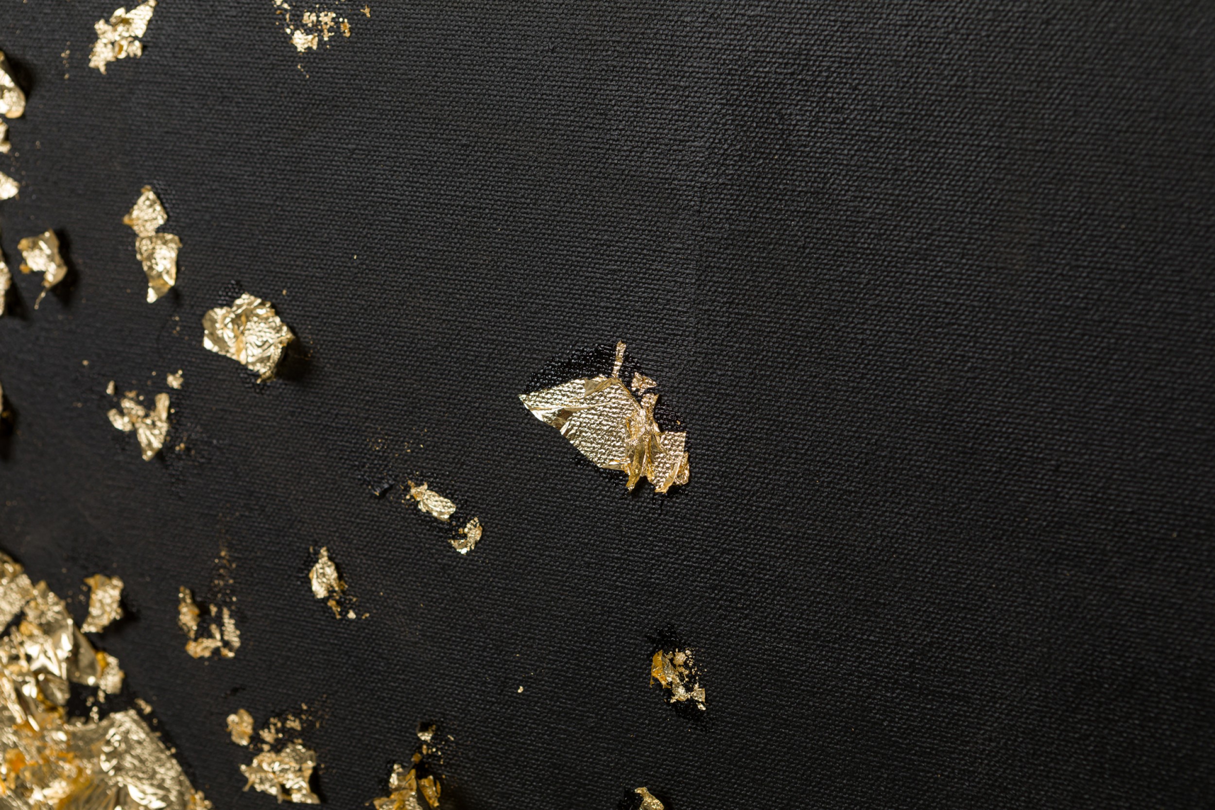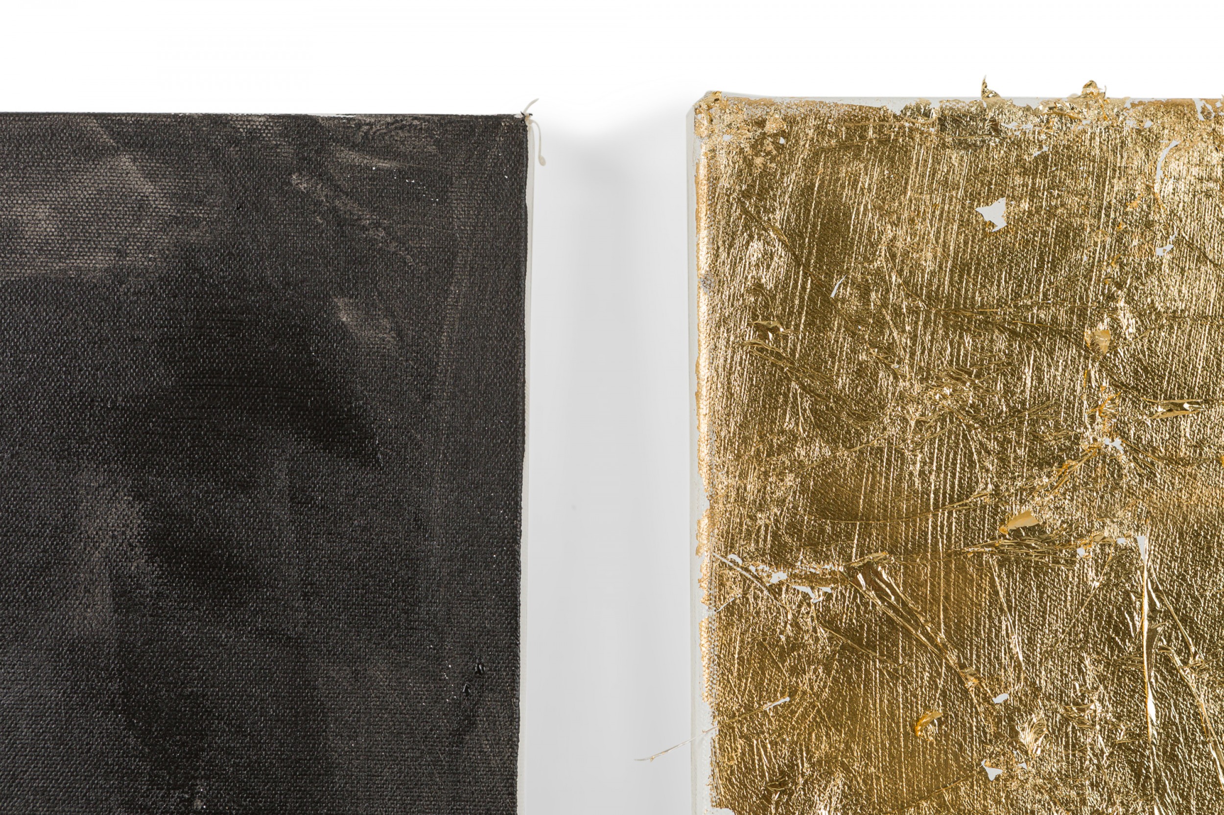 Barbara Kiskovski Contemporary Abstract Diptych Paintings of Gold Leaf Shapes on Black Canvas