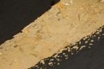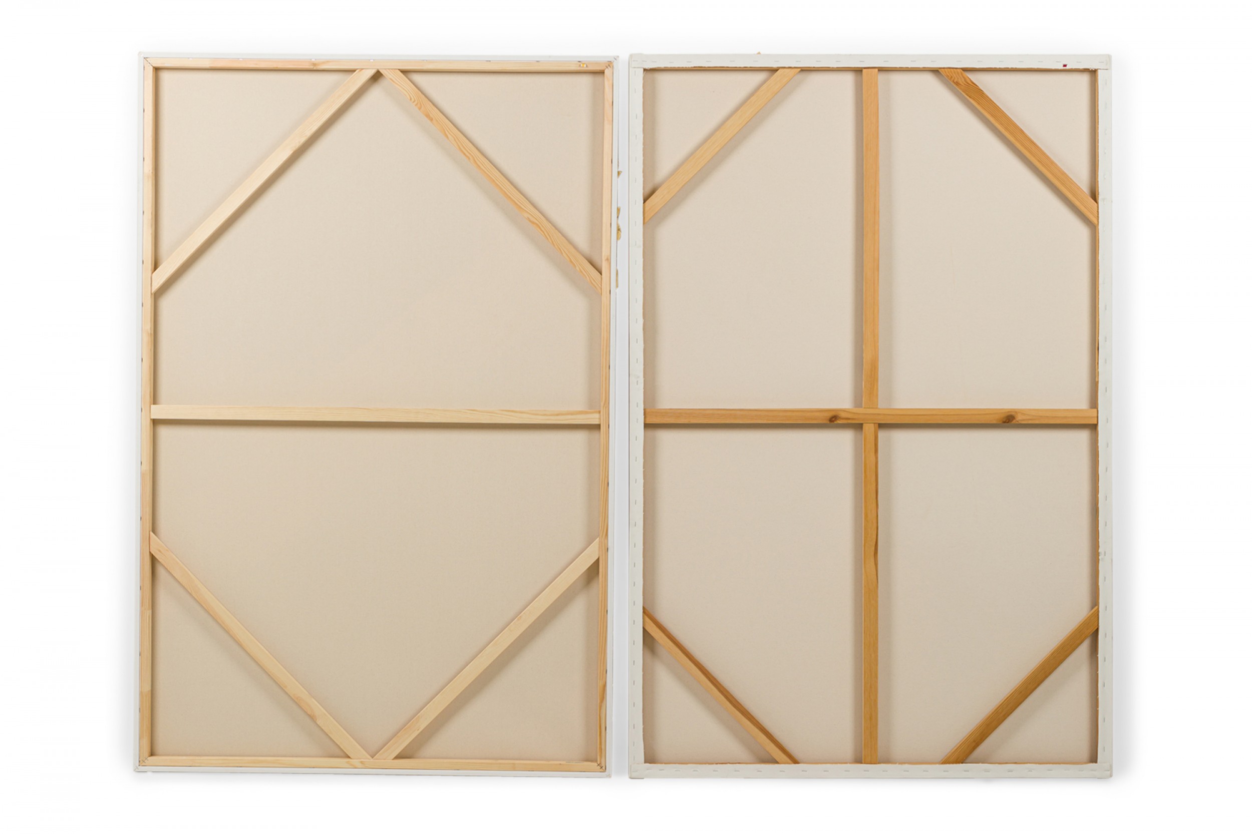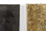 Contemporary abstract diptych painting featuring abstract stripes in gold leaf with black acrylic painted backgrounds on two rectangular stretched canvases. ("Stardust," by BARBARA KISKOVSKI).