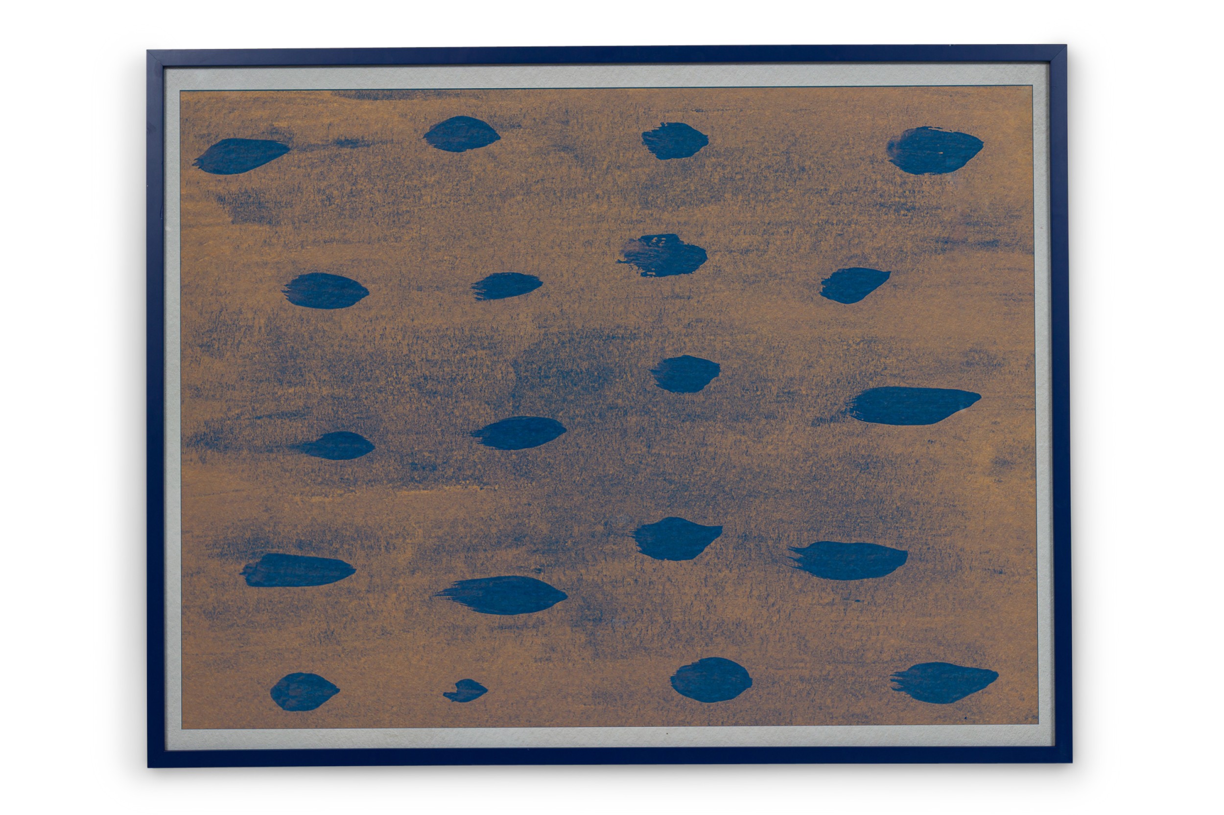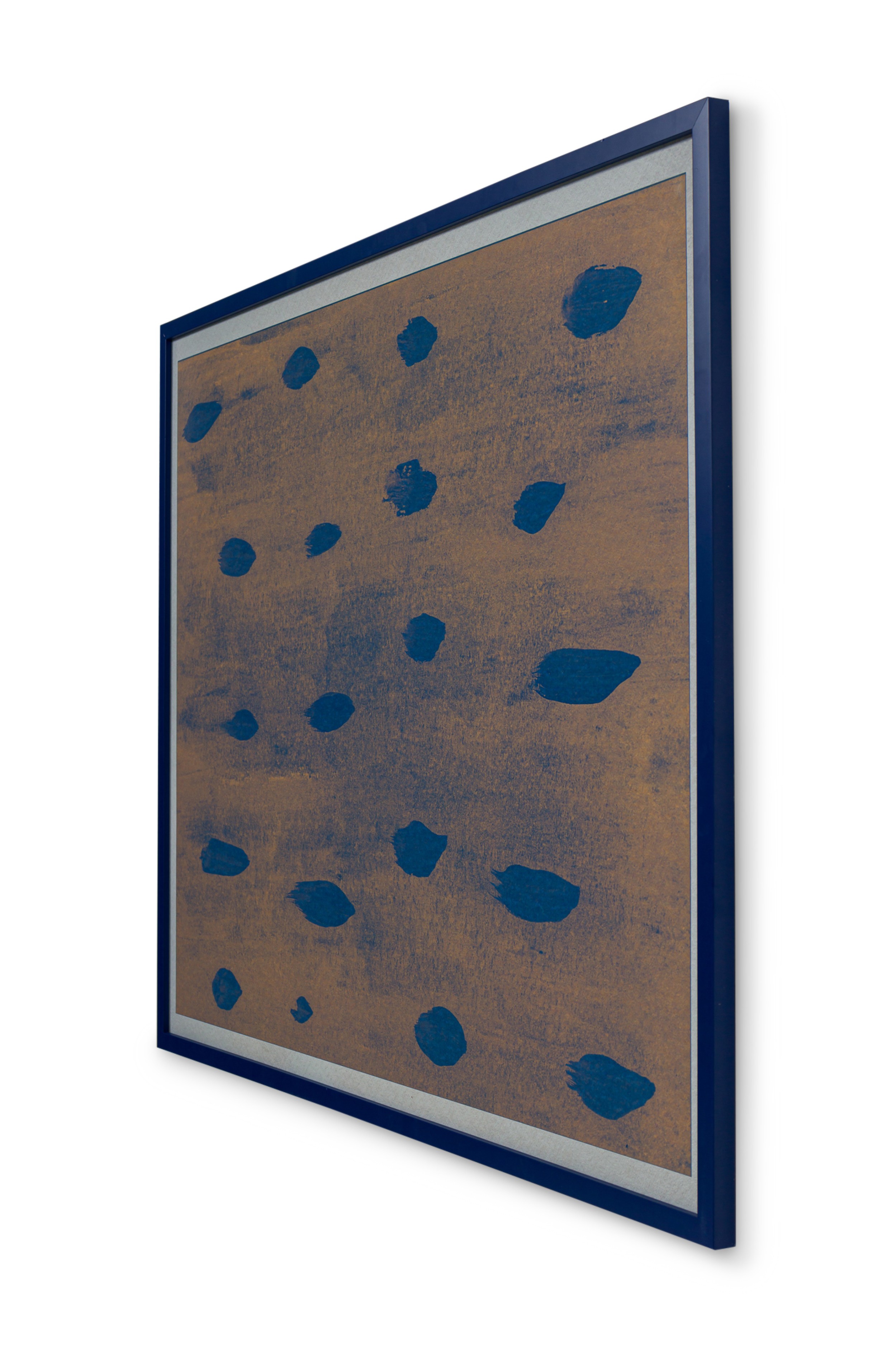 Contemporary American abstract print with grey and navy blue dots on a faded orange background, in a matching contemporary frame.