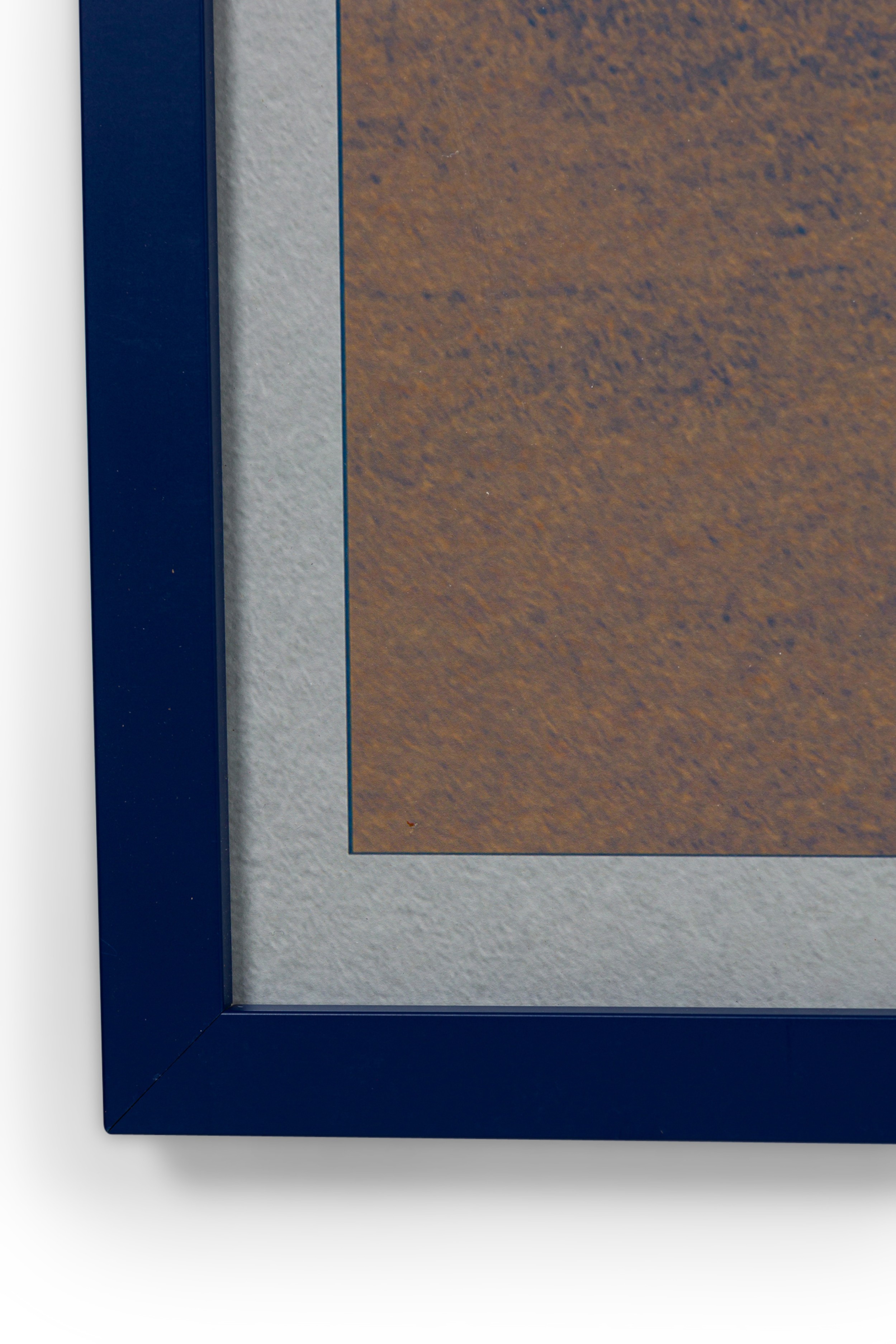 Contemporary American abstract print with grey and navy blue dots on a faded orange background, in a matching contemporary frame..