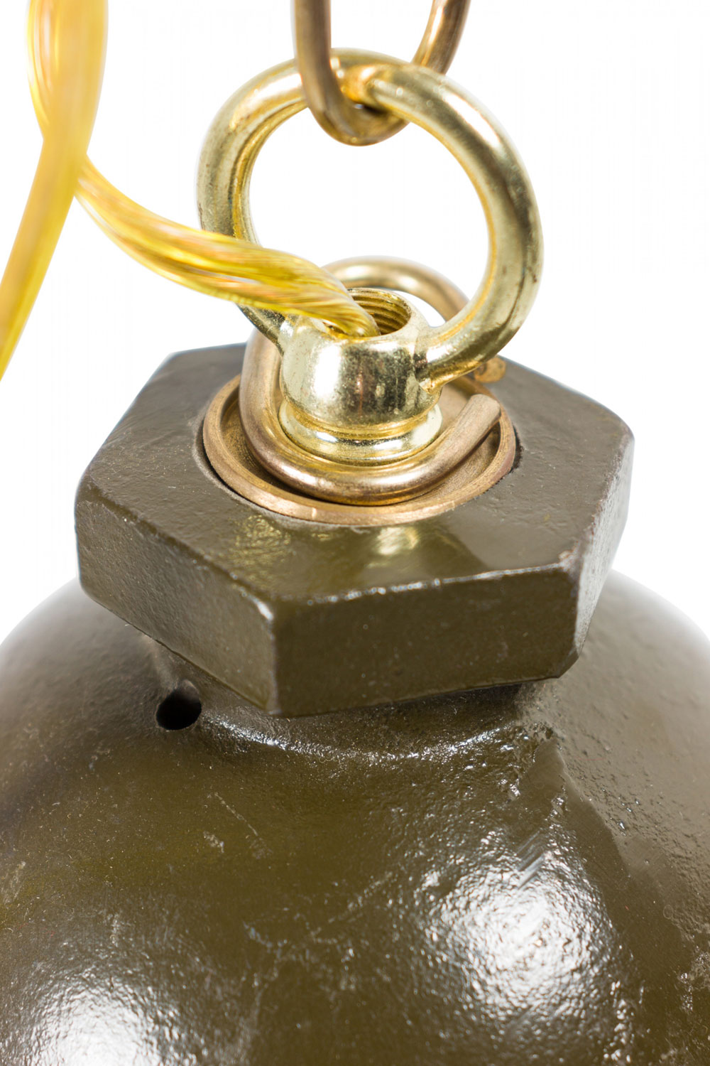 Contemporary industrial hanging light fixture with a dark gray / olive painted steel fixture supporting a thick clear ribbed glass globe wired with a standard wall plug. (Similar fixture: 062967).