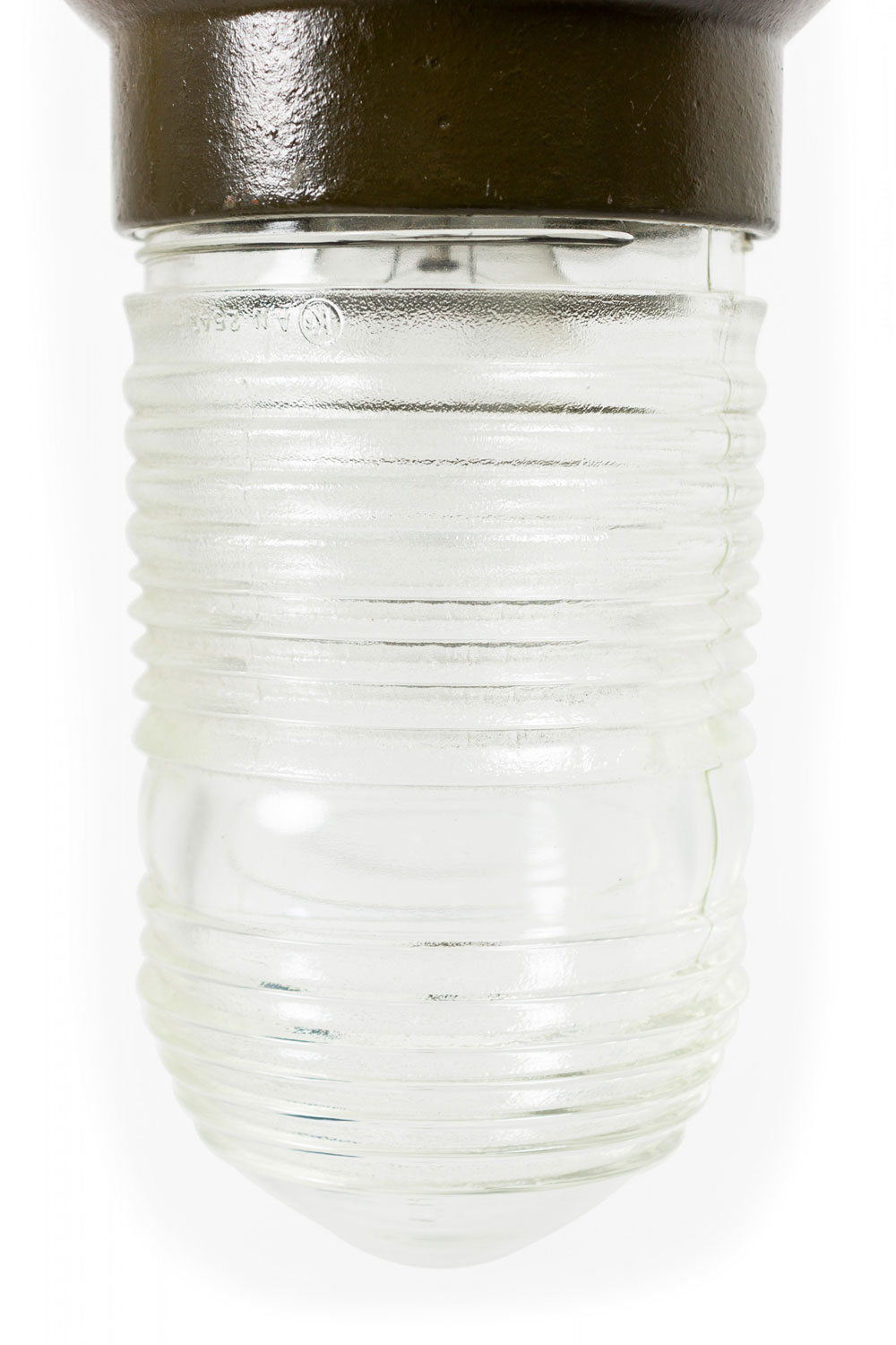 Contemporary industrial hanging light fixture with a dark gray / olive painted steel fixture supporting a thick clear ribbed glass globe wired with a standard wall plug. (Similar fixture: 062967)