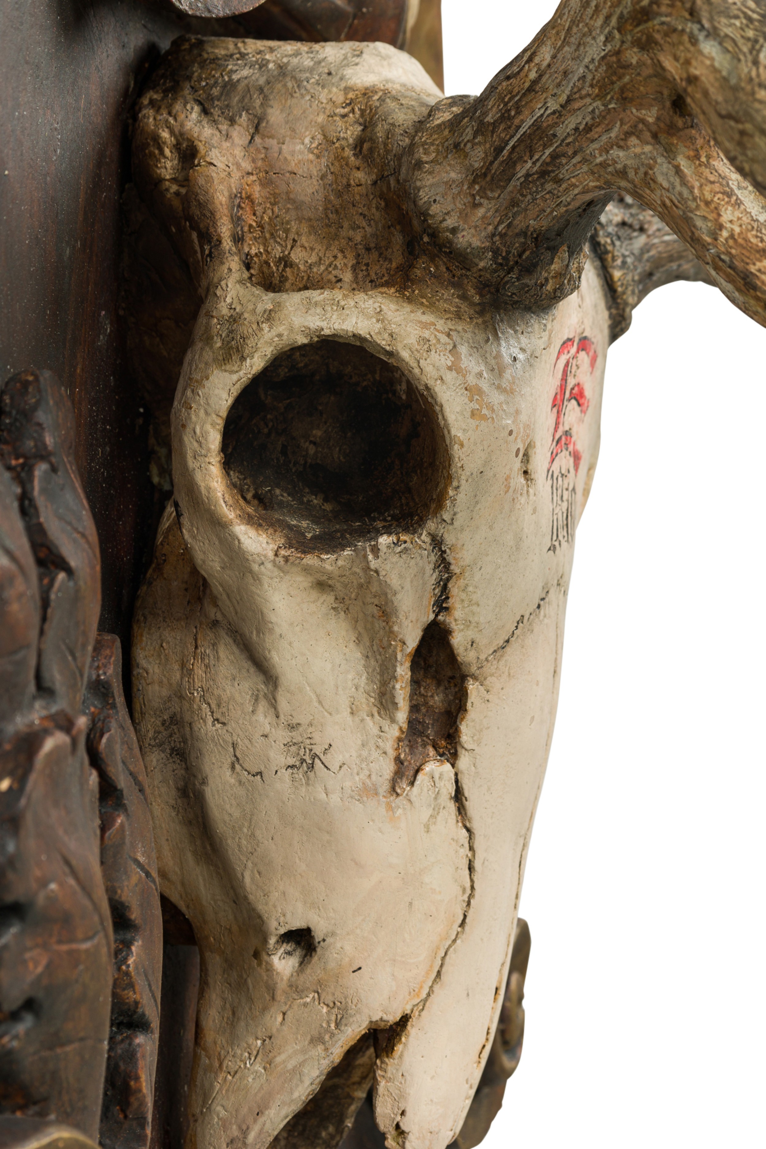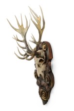 Rustic Continental elk head with Red painted "E" on forehead mounted on a wall plaque with oak leaves andscroll designs.