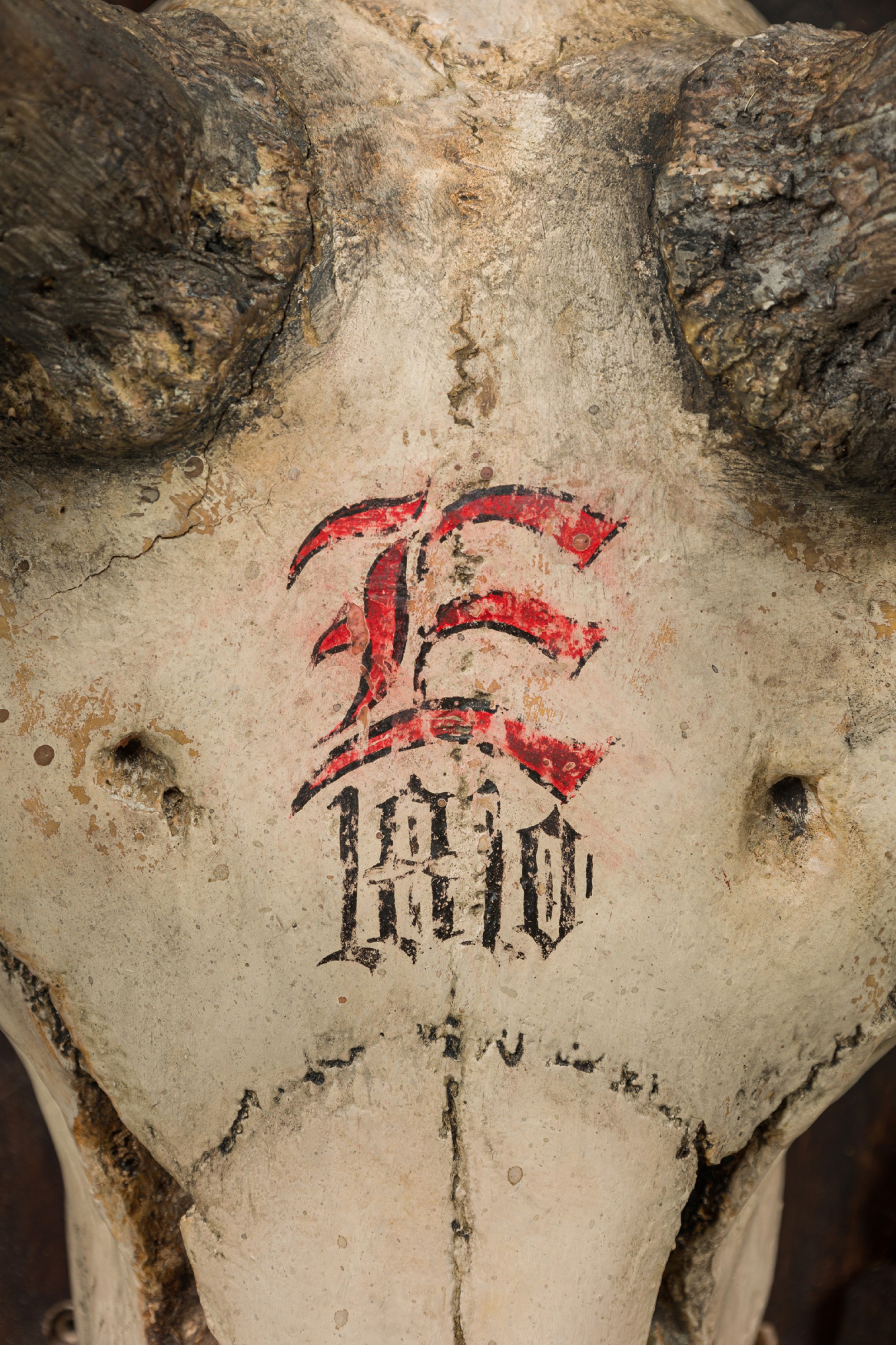 Rustic Continental elk head with Red painted "E" on forehead mounted on a wall plaque with oak leaves andscroll designs