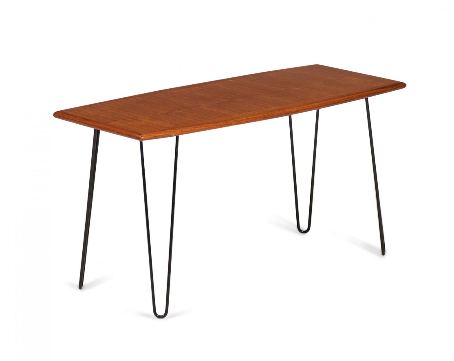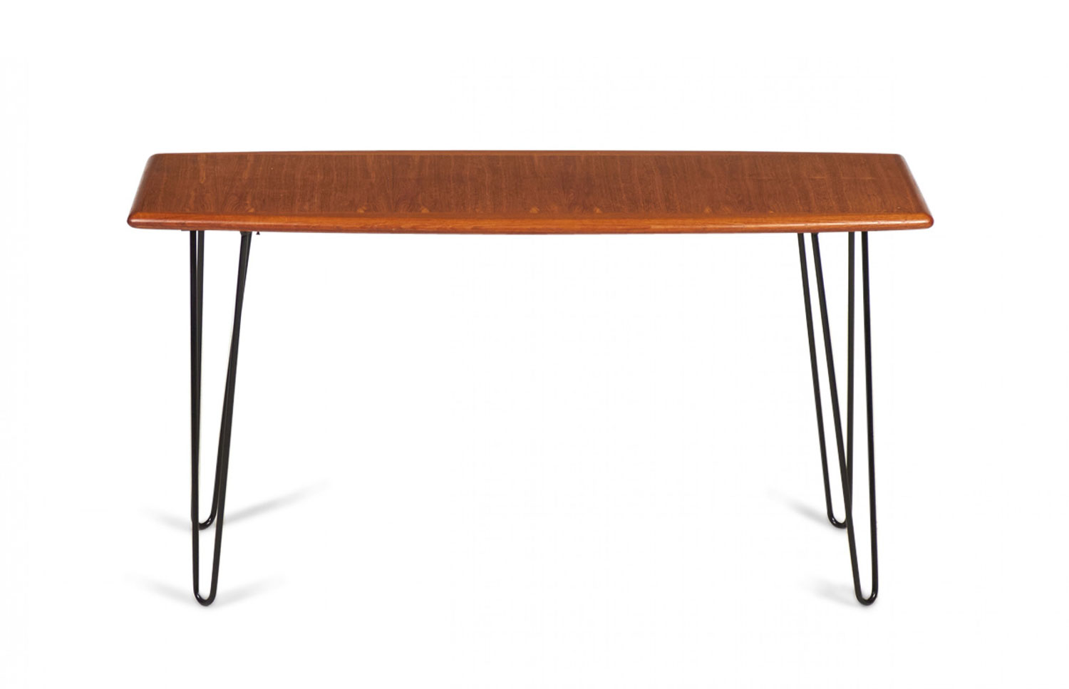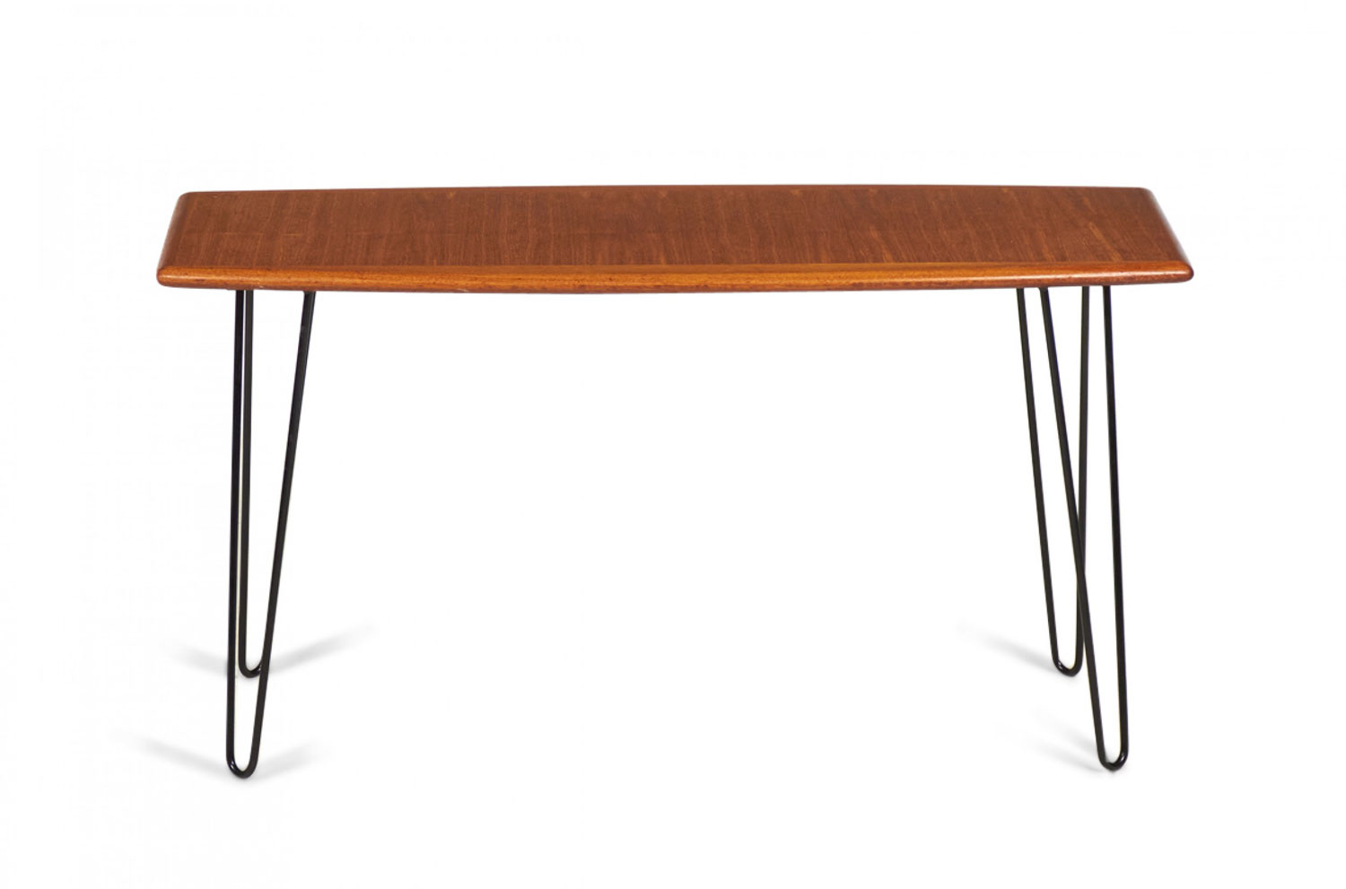 Danish mid-century rectangular teak coffee table on 4 iron hairpin legs.