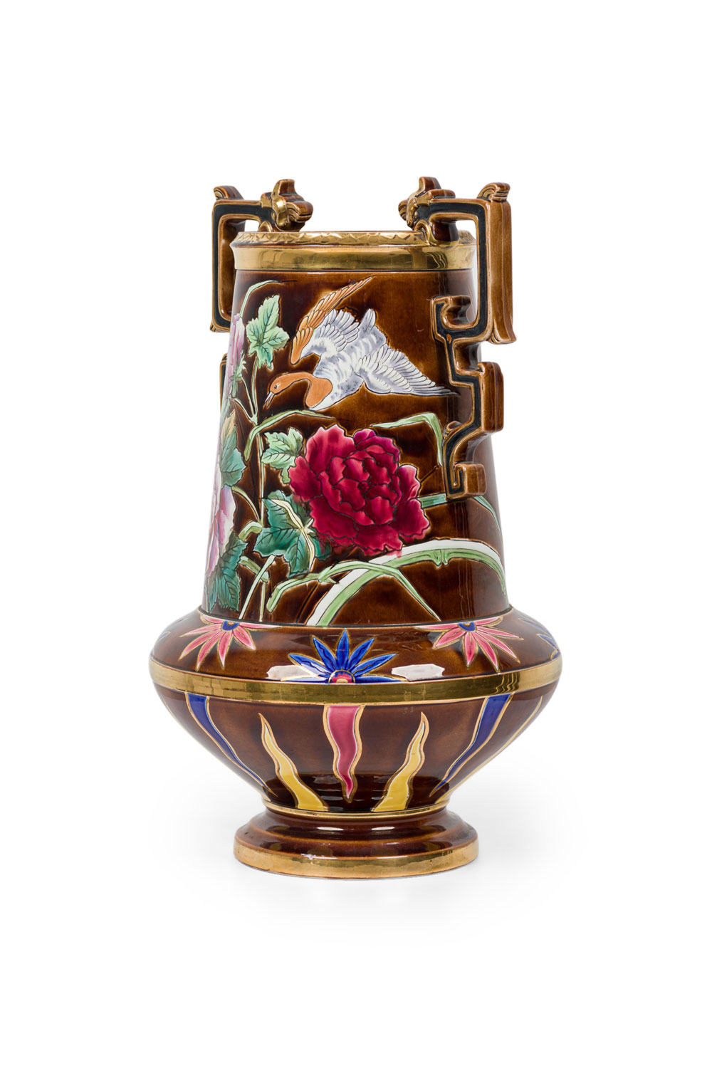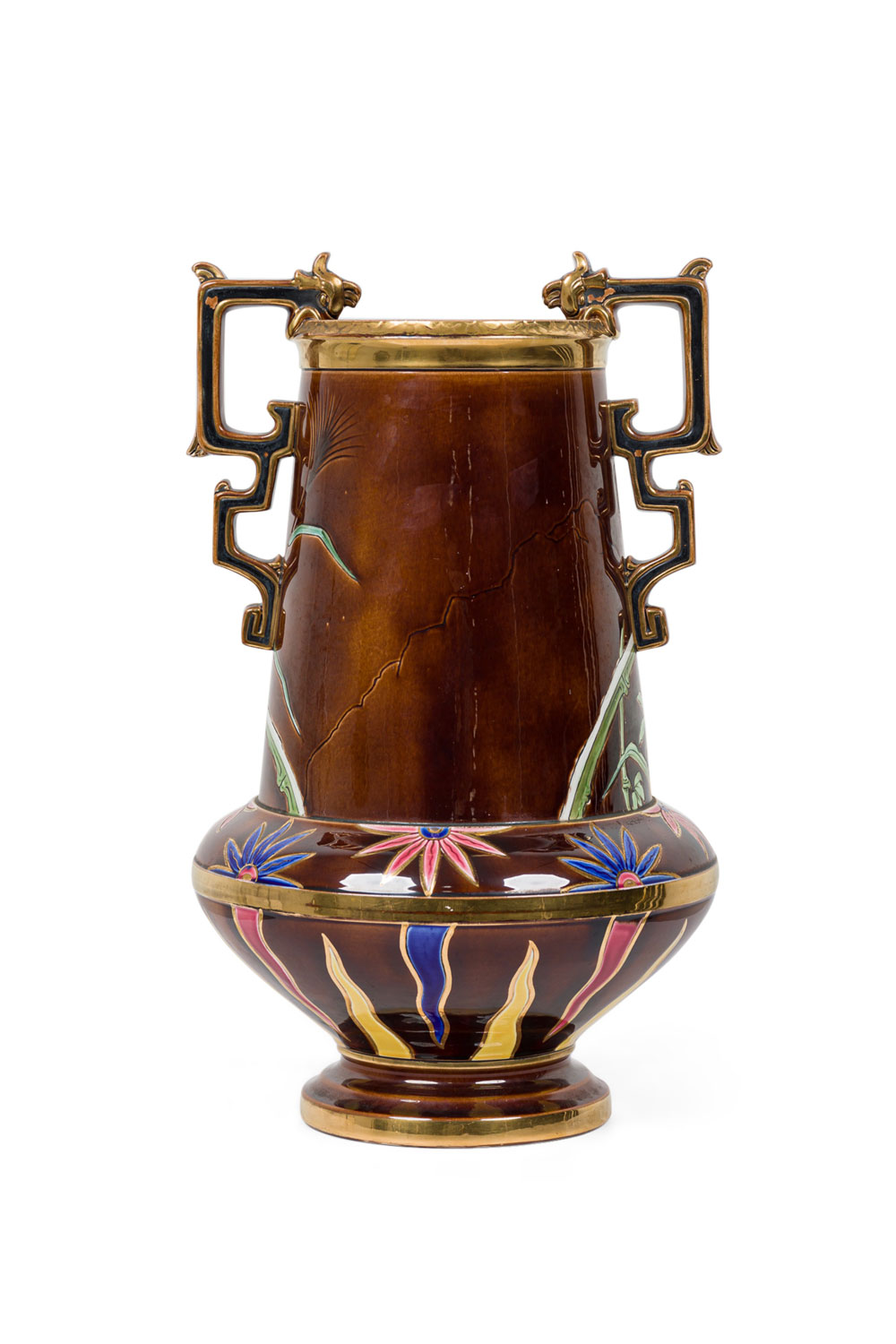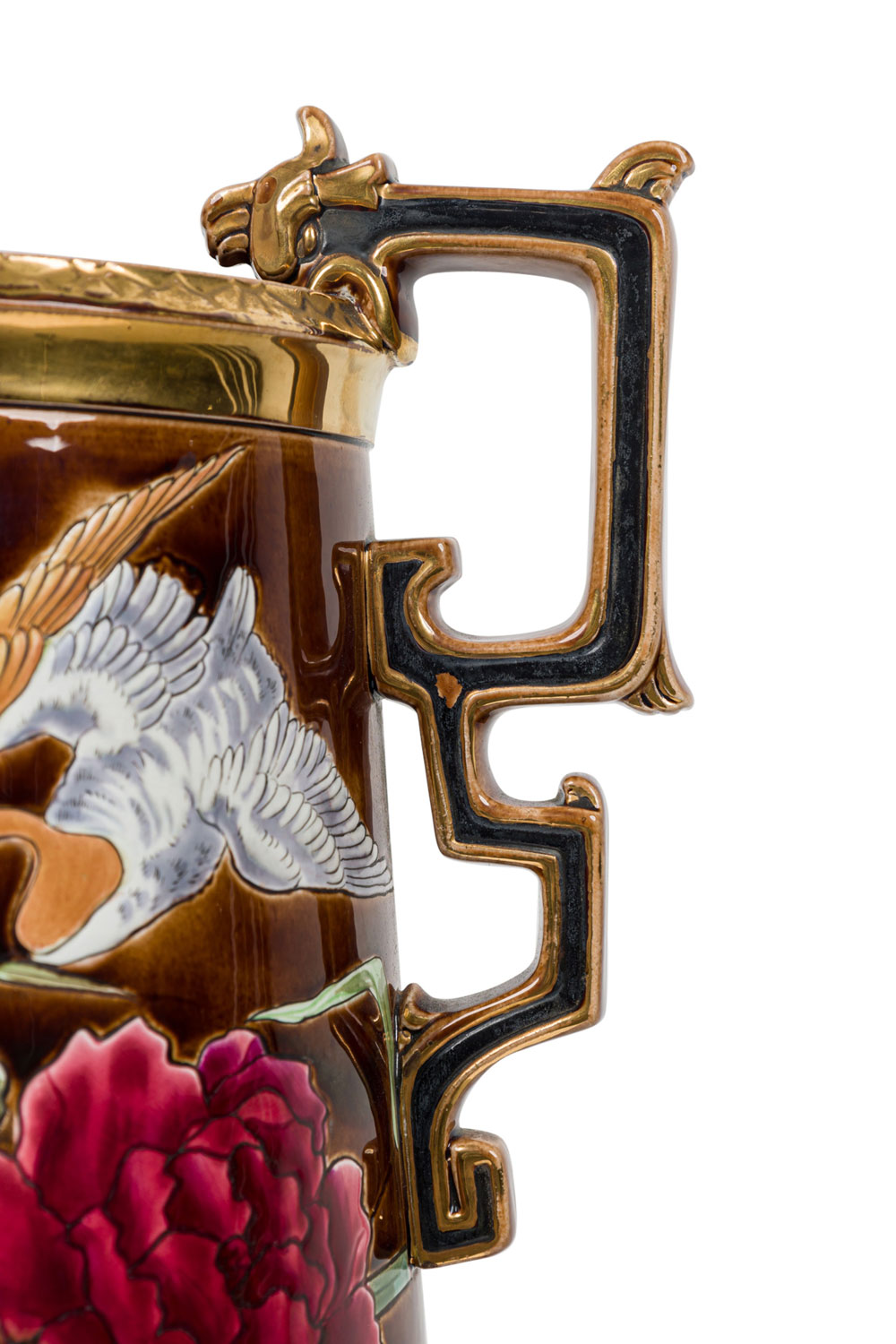 Dutch Victorian (19th Century) Aesthetic Movement monumental ceramic vase in footed ovoid form with ornate keyfret handles, featuring a shallow relief nature scene; a duck hovering over abundant flora, painted in bold colors over a brown ground with gilt highlighting.