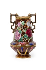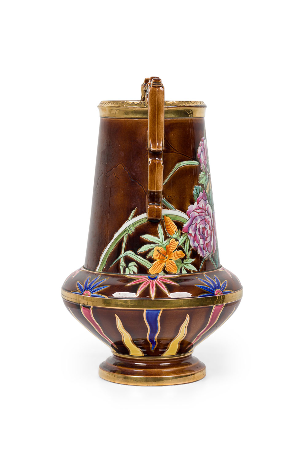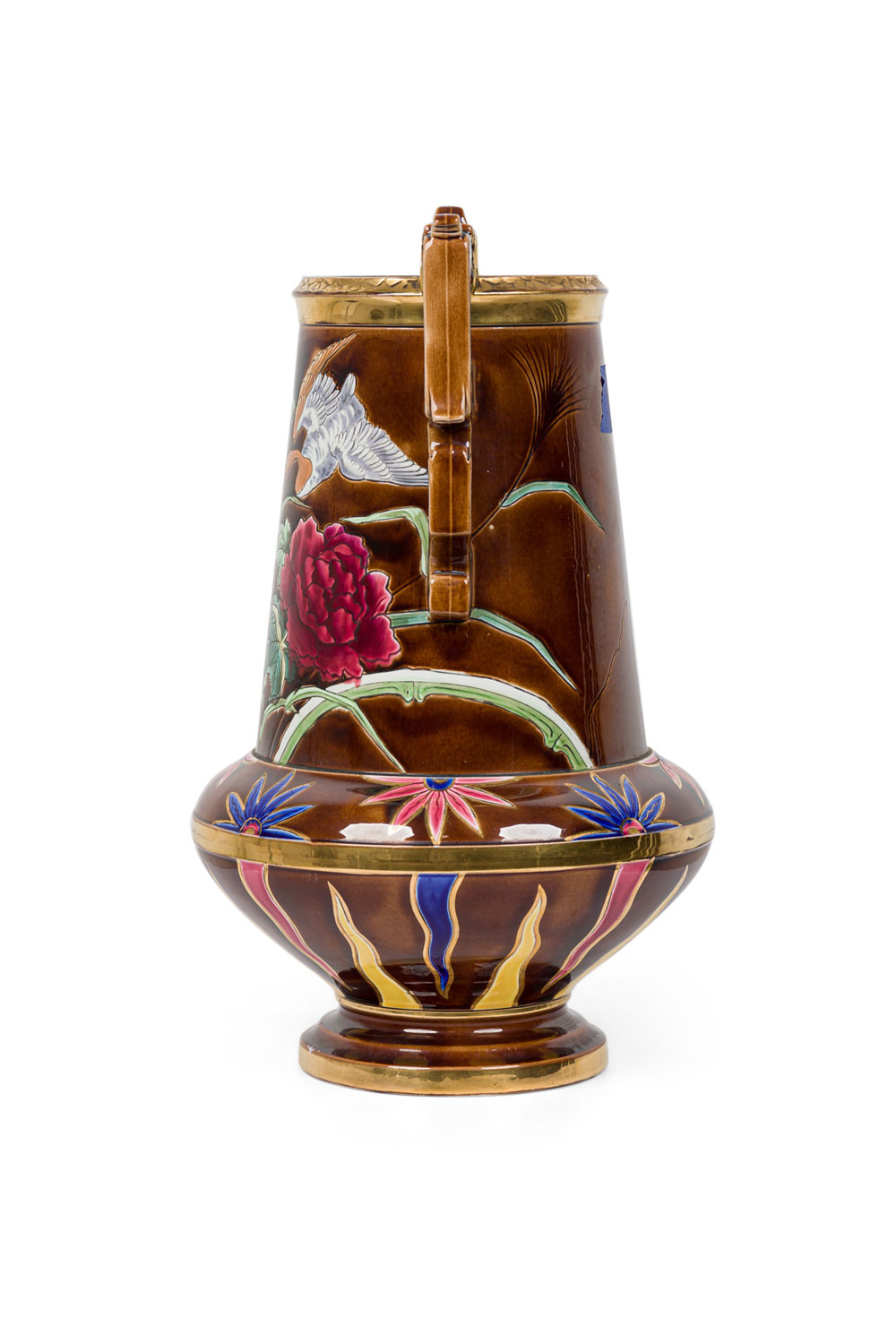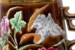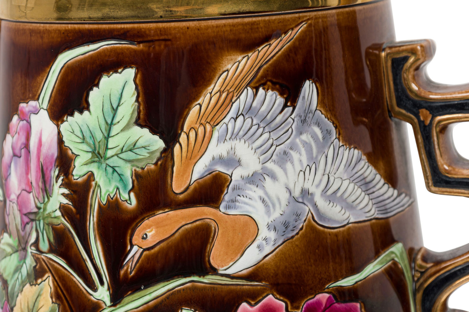 Dutch Victorian (19th Century) Aesthetic Movement monumental ceramic vase in footed ovoid form with ornate keyfret handles, featuring a shallow relief nature scene; a duck hovering over abundant flora, painted in bold colors over a brown ground with gilt highlighting.