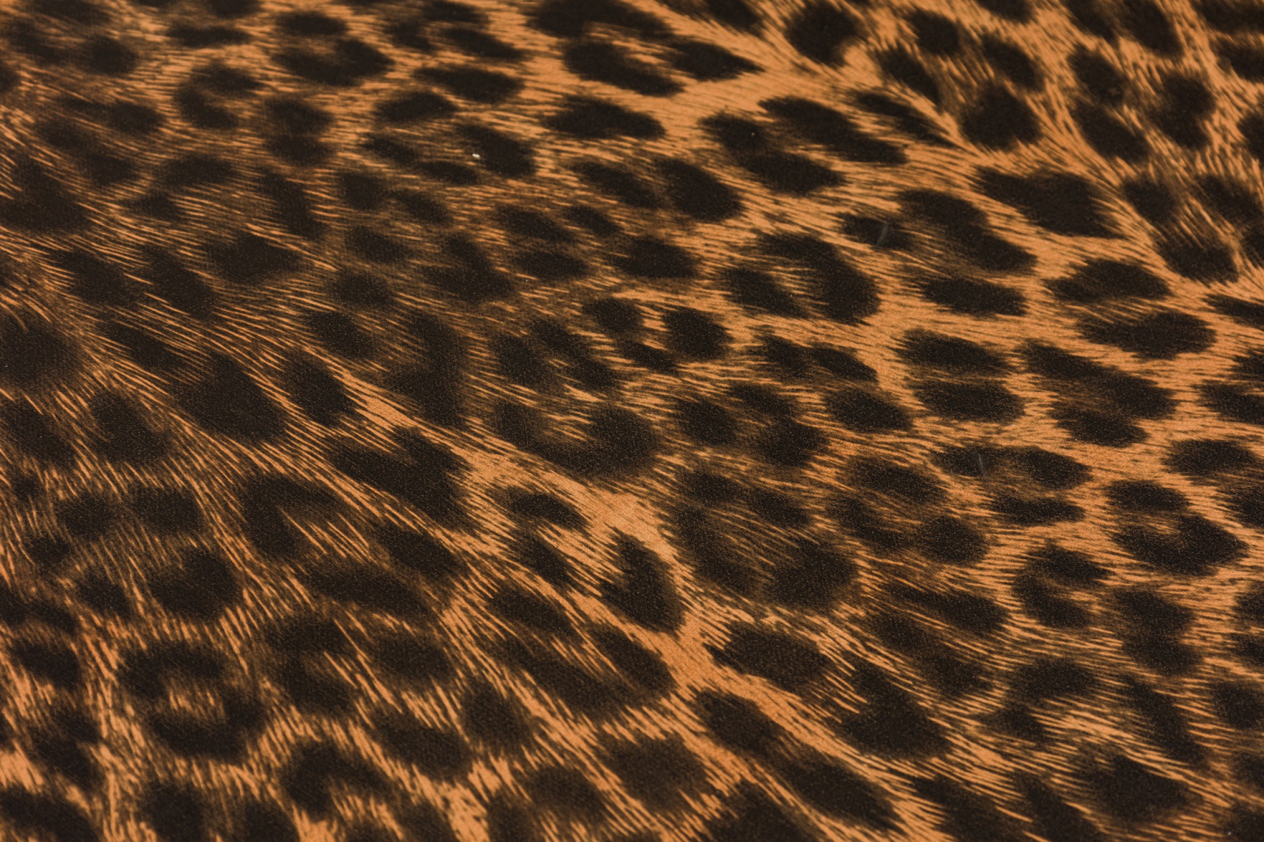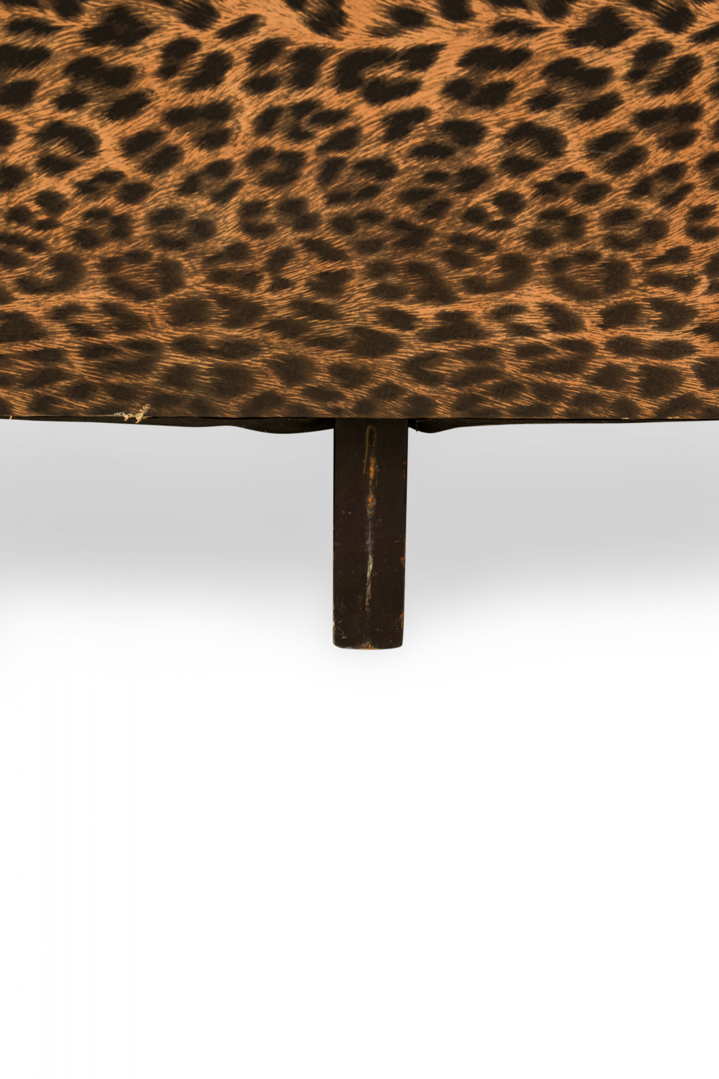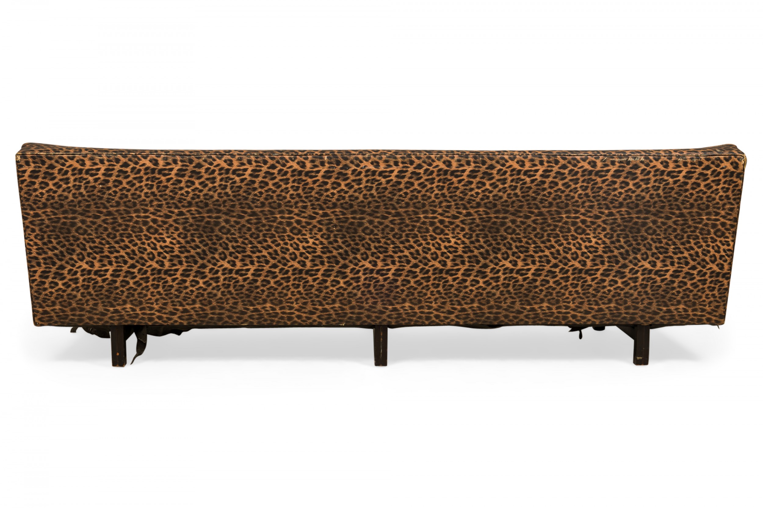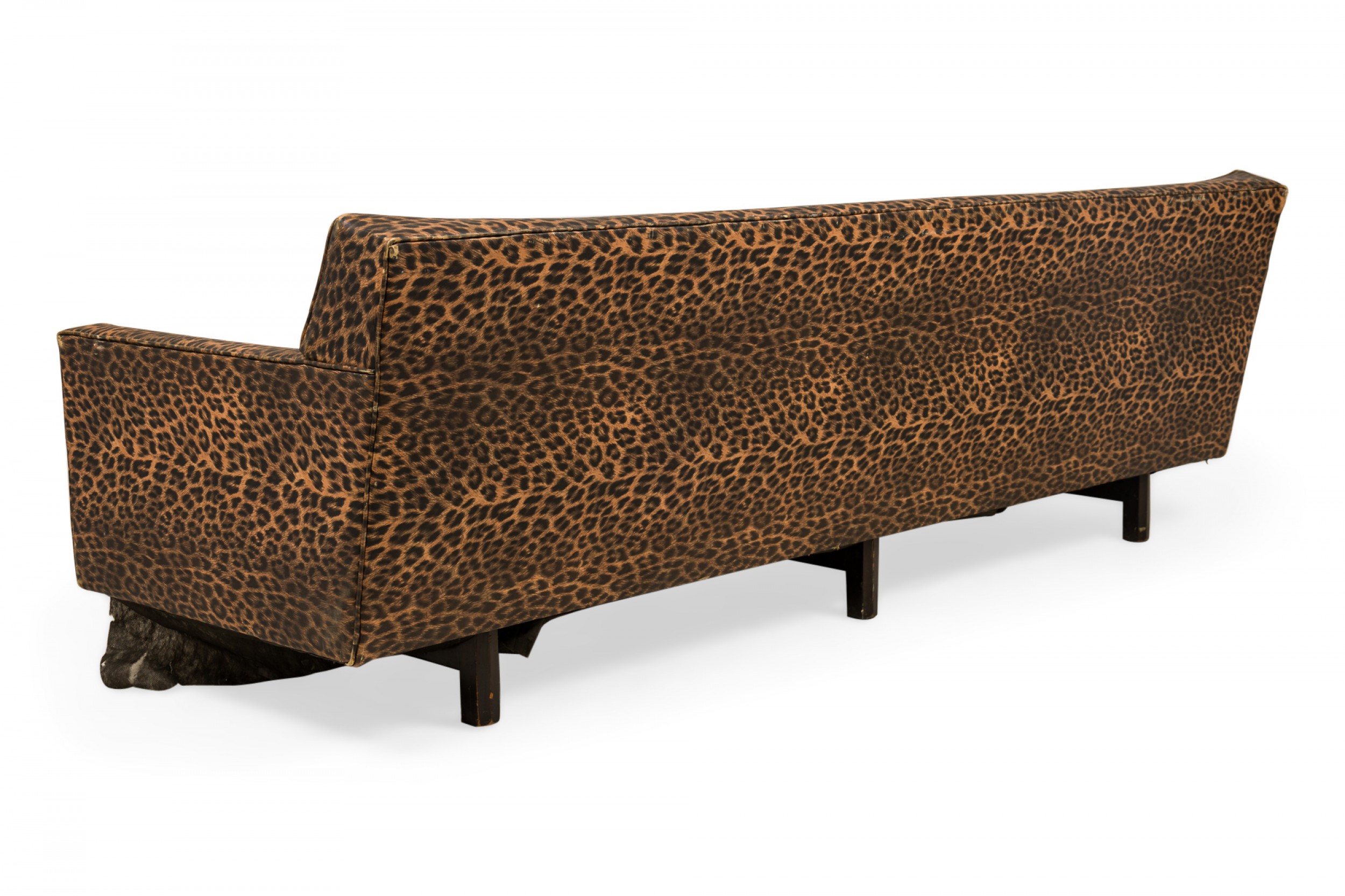 American Mid-Century three seat sofa, upholstered in a brown and black leopard print vinyl with two removable seat cushions, resting on three sets of square walnut legs. (EDWARD J WORMLEY FOR DUNBAR FURNITURE COMPANY).