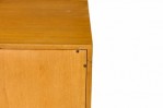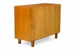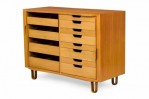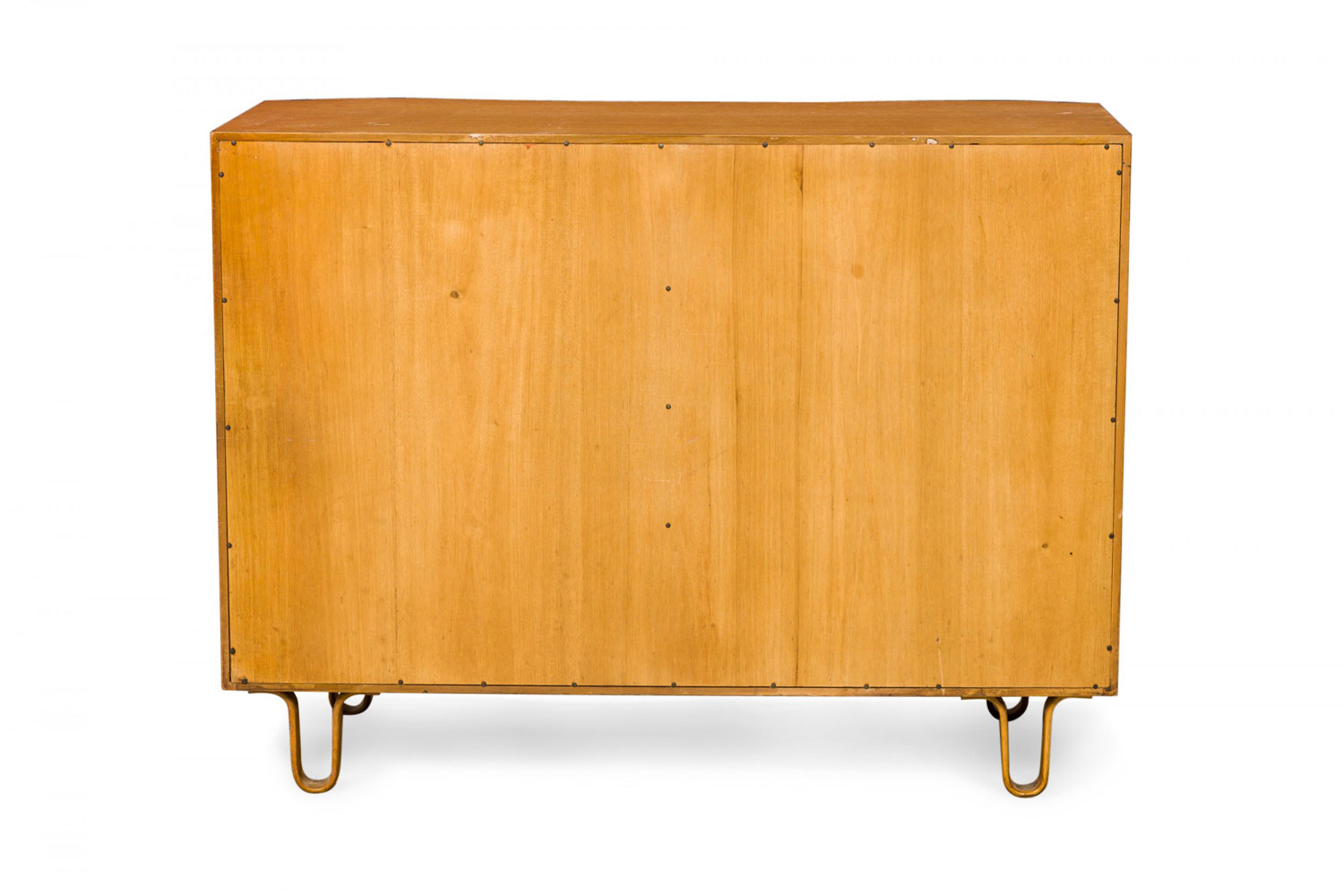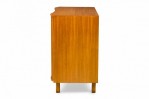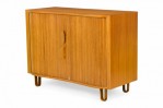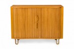 American Mid-Century walnut cabinet with two tambour doors, the left with 4 larger pull out drawers, and the right with 8 drawers of alternating size, resting on four U-shaped bentwood legs. (EDWARD J WORMLEY FOR DUNBAR FURNITURE CO.)(Similar piece: DUF0266)