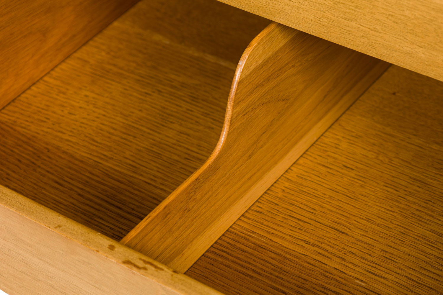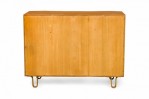 American Mid-Century walnut cabinet with two tambour doors, the left with 4 larger pull out drawers, and the right with 8 drawers of alternating size, resting on four U-shaped bentwood legs. (EDWARD J WORMLEY FOR DUNBAR FURNITURE CO.)(Similar piece: DUF0266).