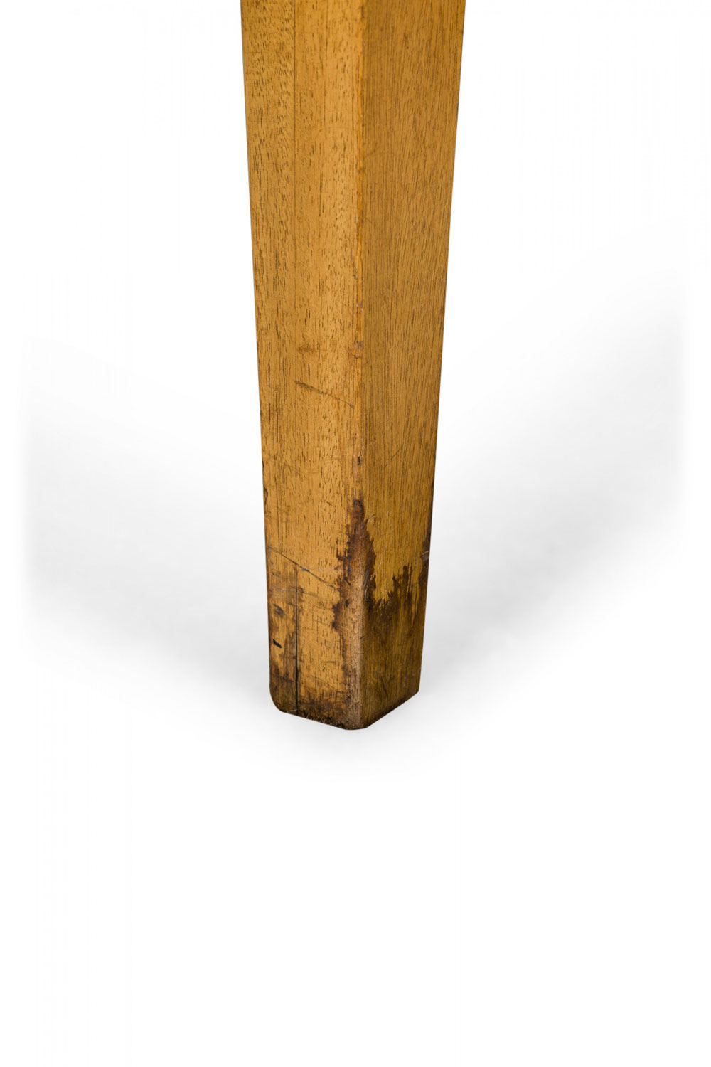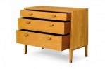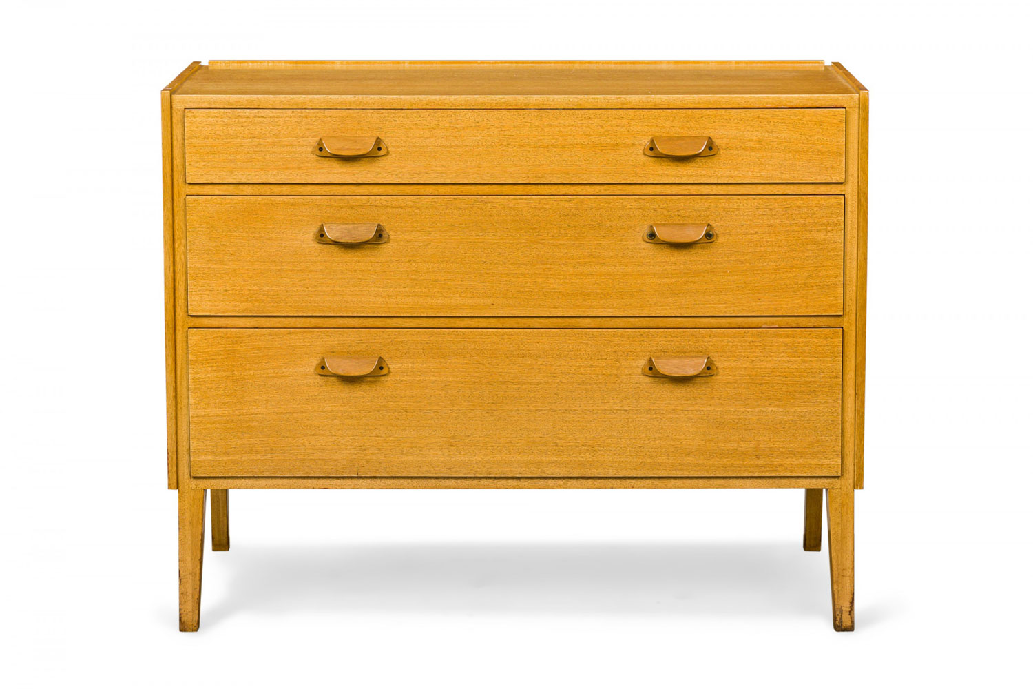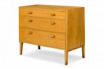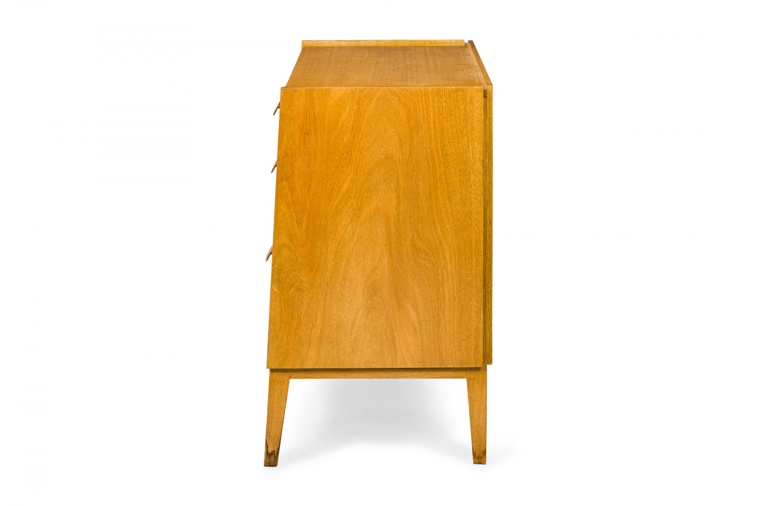 American Mid-Century maple chest with three drawers with semi-circular wooden drawer pulls, resting on four tapered square wooden legs. (EDWARD J WORMLEY FOR DUNBAR FURNITURE COMPANY)