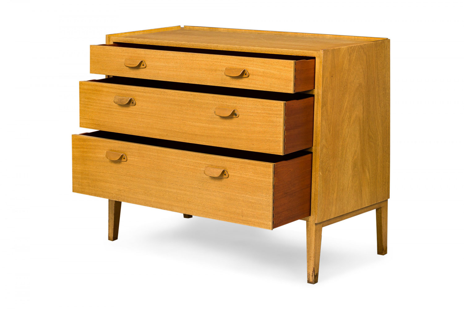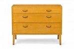 American Mid-Century maple chest with three drawers with semi-circular wooden drawer pulls, resting on four tapered square wooden legs. (EDWARD J WORMLEY FOR DUNBAR FURNITURE COMPANY).