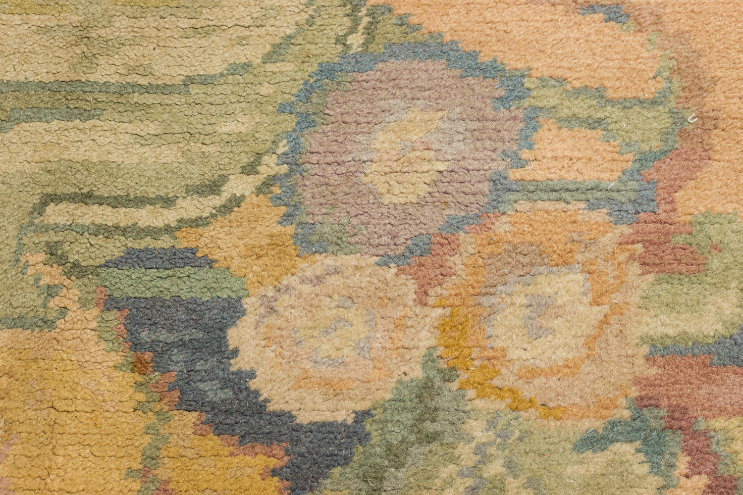 English Arts & Crafts wool rug carpet with pastel swirl design and border. Designed by Frank Brangwyn, R.A., circa 1930 for an exhibition of modern furnishings at E. Pollard and Company and produced by Templeton's Axminster, signed with artist's monogram in two of the corners. (JAMES TEMPLETON & CO., BY FRANK BRANGWYN) (15 x 11.5') (AS IS-damages) (ref: rug in the V&A http://collections.vam.ac.uk/item/O68310/carpet/carpet-brangwynfrank/